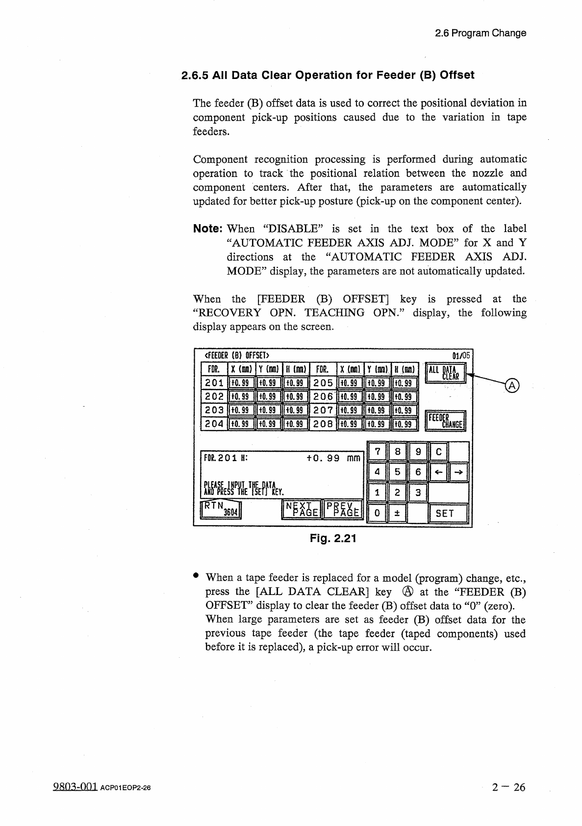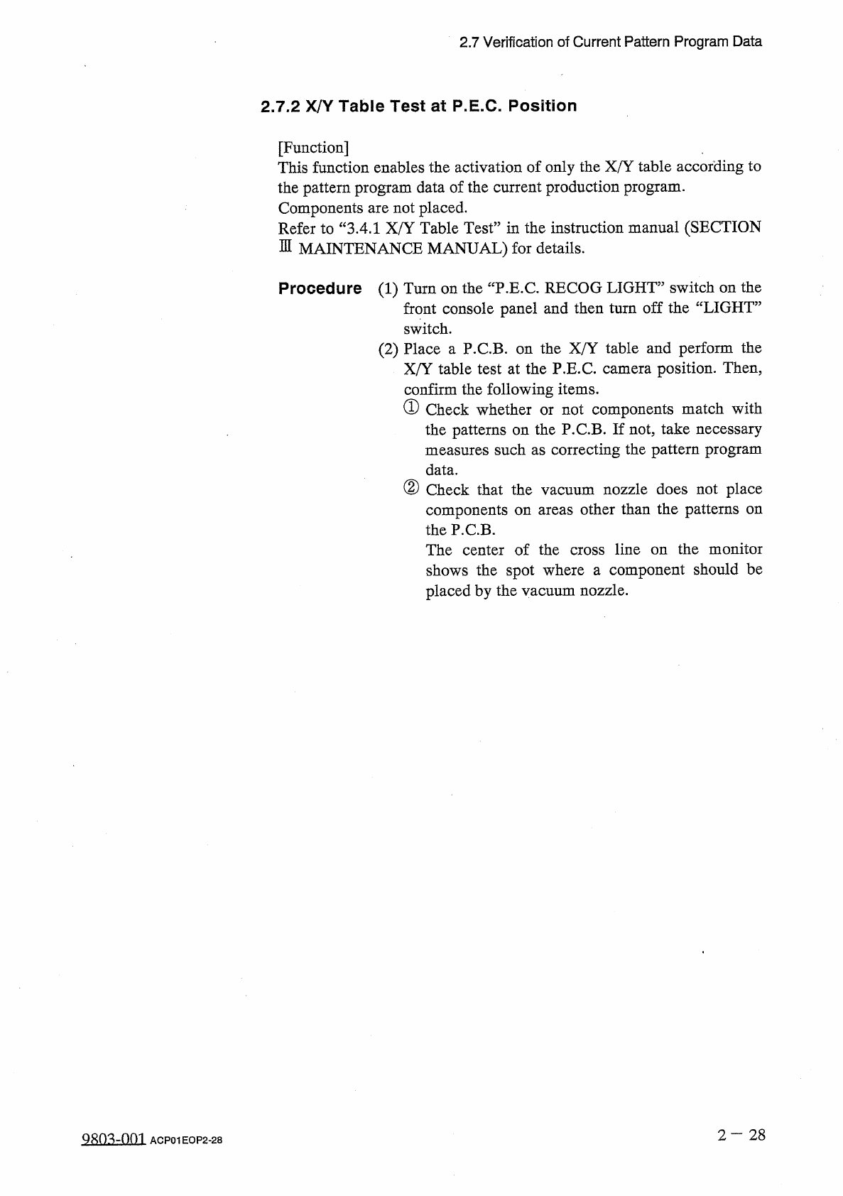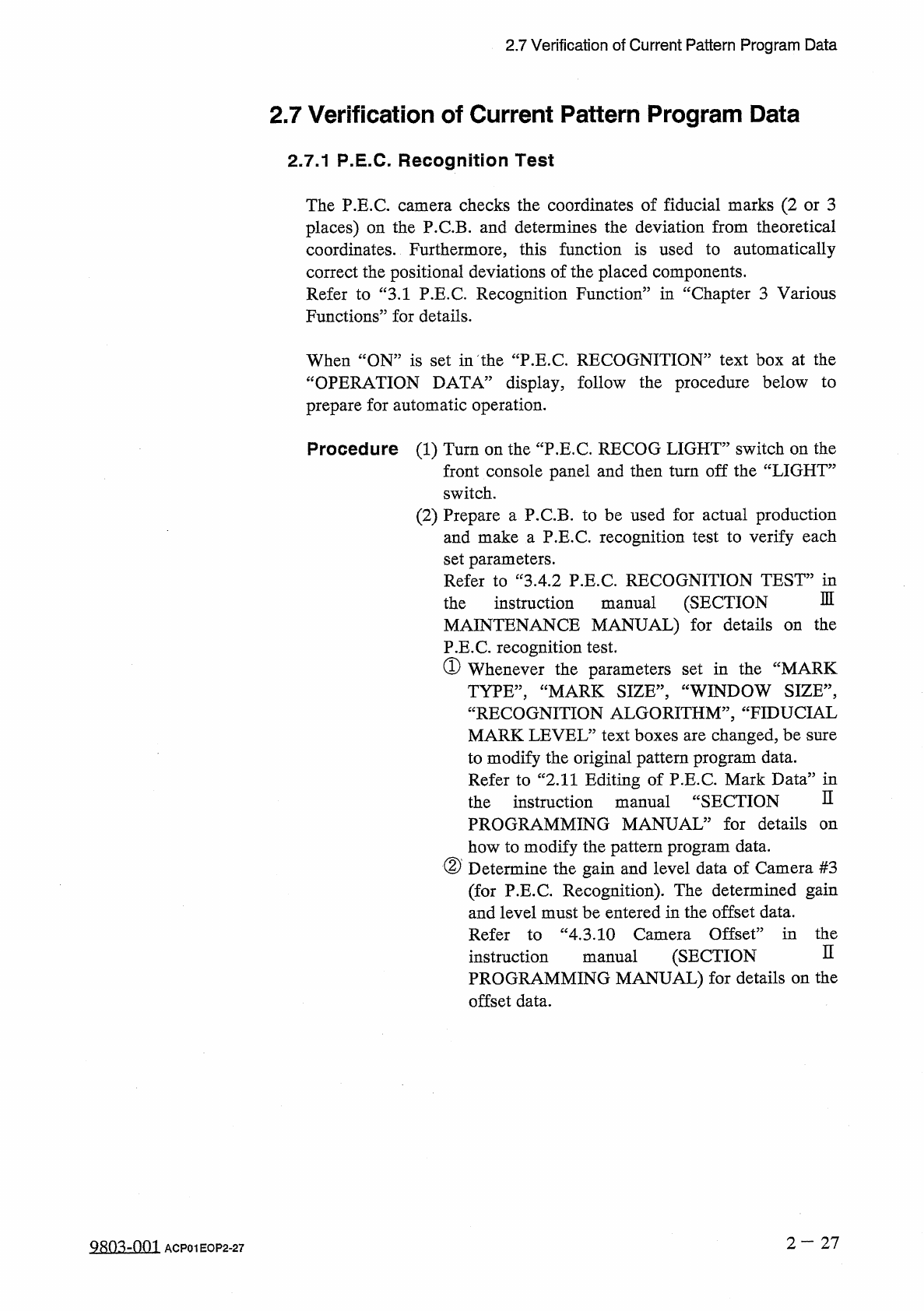 2.7 Verification of Current Pattern Program Data 2.7 Verification of Current Pattern Program Data 2.7 . 1 P . E . C . Recognition Test The P . E . C . camera checks the coordinates of fiducial marks ( 2 or 3 places ) on …