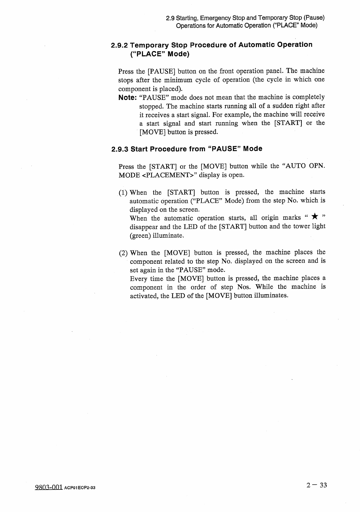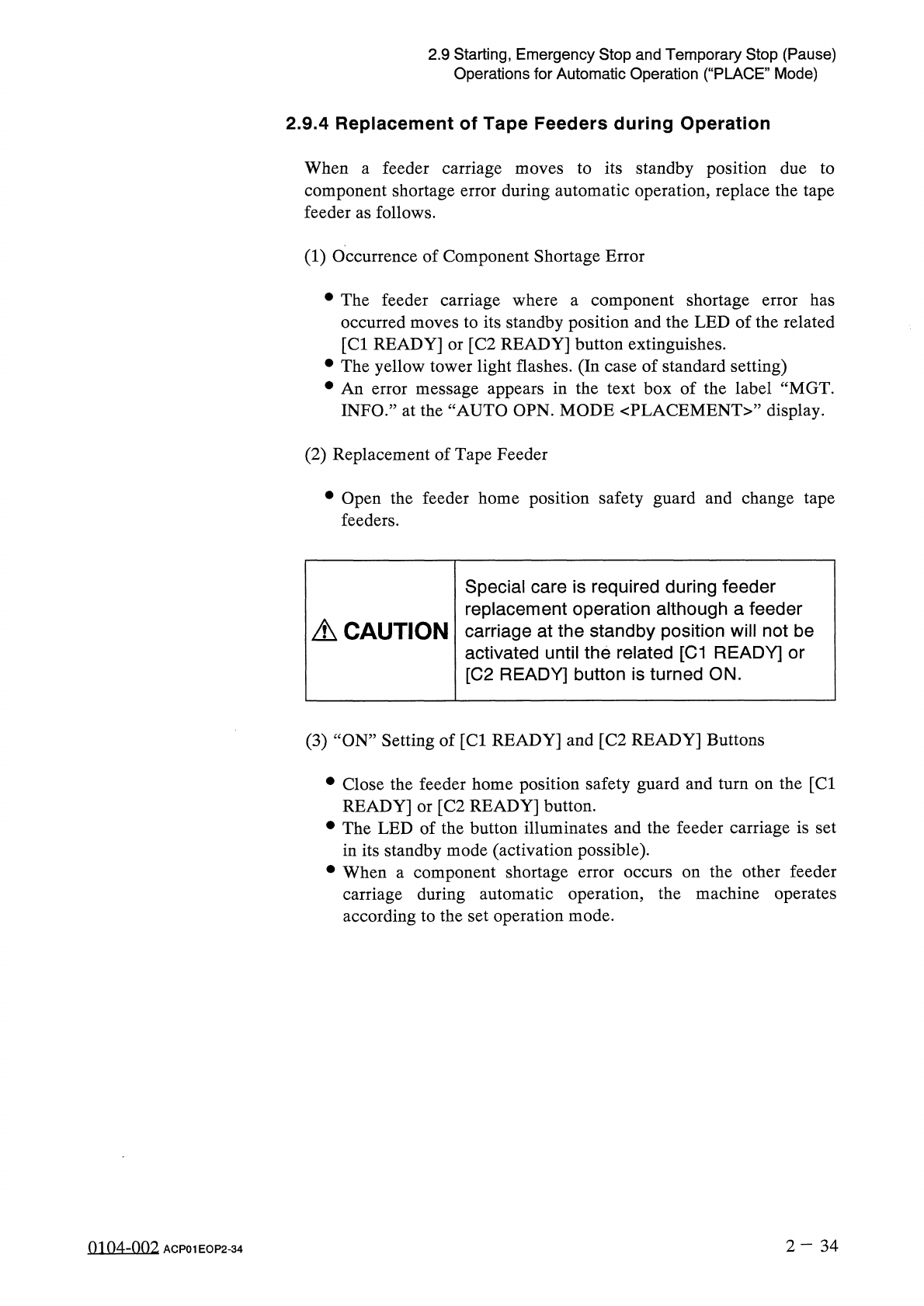 2.9 Starting , Emergency Stop and Temporary Stop ( Pause ) Operations for Automatic Operation ( “ PLACE ” Mode ) 2 , 9.4 Replacement of Tape Feeders during Operation When a feeder carriage component shortage error during…