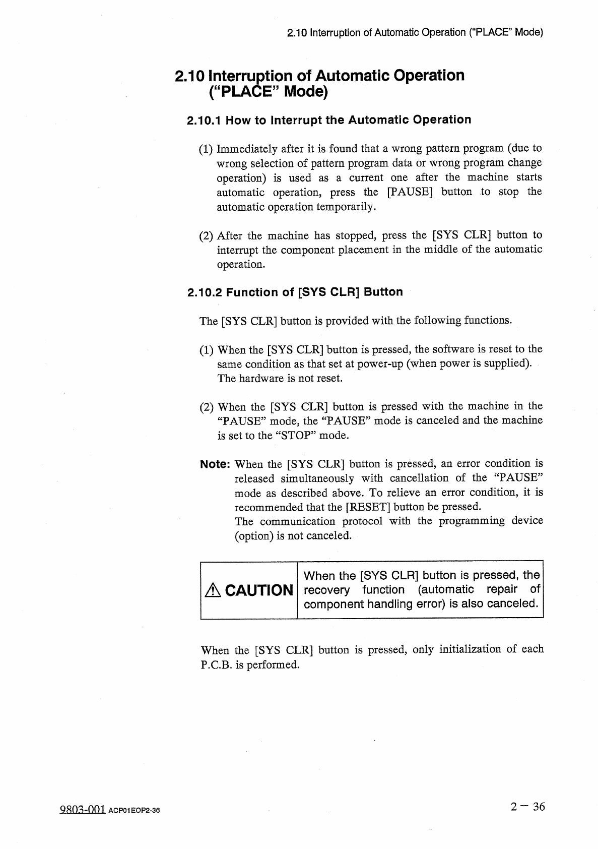 2.10 Interruption of Automatic Operation ( “ PLACE ” Mode ) T H E A S Y S T E M T I S N 0 W U B E * l N G I N I T I A L I Z E D . CPU BOARD ( D . INiliALIZIHG SERIAL BOARD ( 1 ) INITIALIZING — ( 1 - 1 ) INITIALIZING 1 IN…