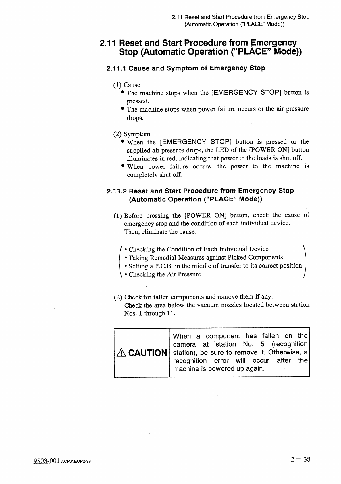 2.11 Reset and Start Procedure from Emergency Stop ( Automatic Operation ( “ PLACE ” Mode ) ) 2.11 Reset and Start Procedure from Emergency Stop ( Automatic Operation ( “ PLACE ” Mode ) ) 2.11 . 1 Cause and Symptom of Em…