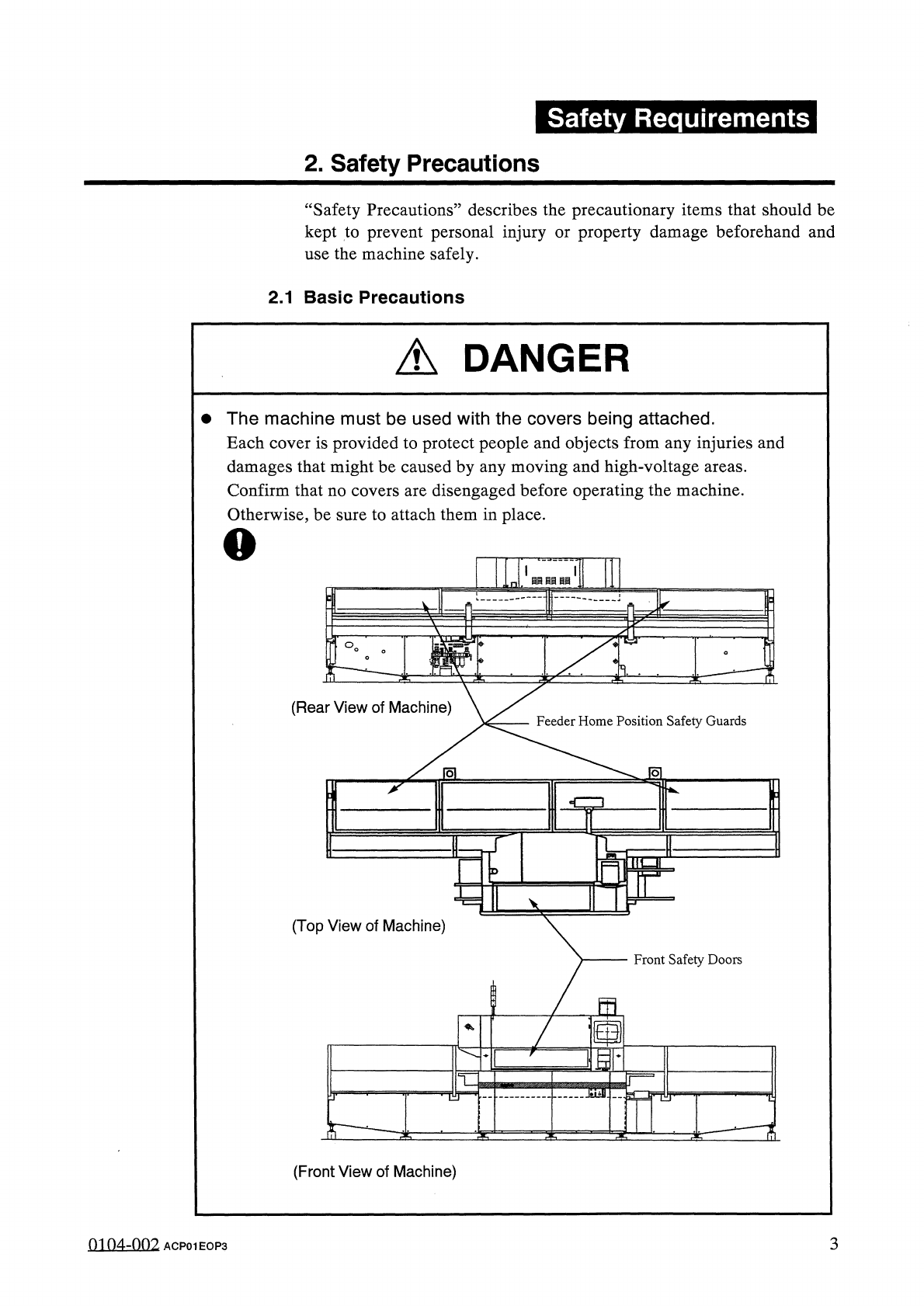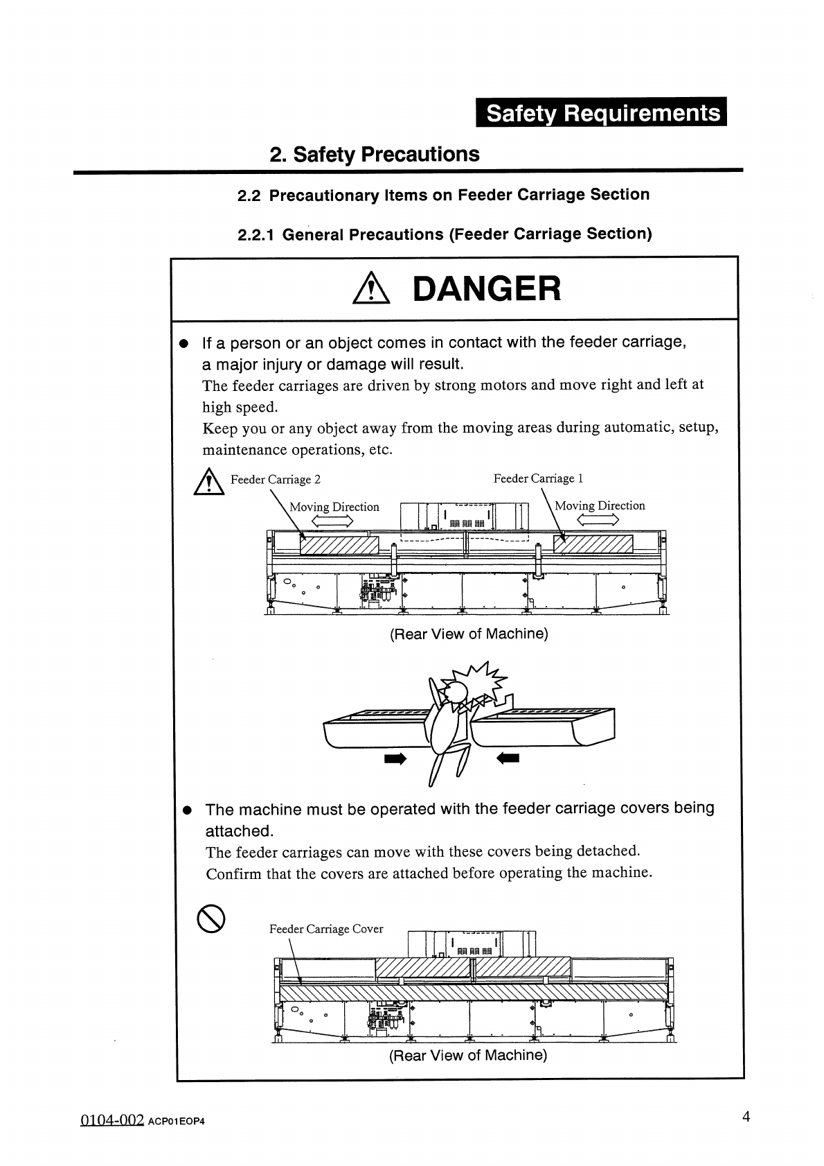 Safety Requirements 2 . Safety Precautions 2.2 Precautionary Items on Feeder Carriage Section 2.2 . 1 General Precautions ( Feeder Carriage Section ) A DANGER • If a person or an object comes in contact with the feeder c…
