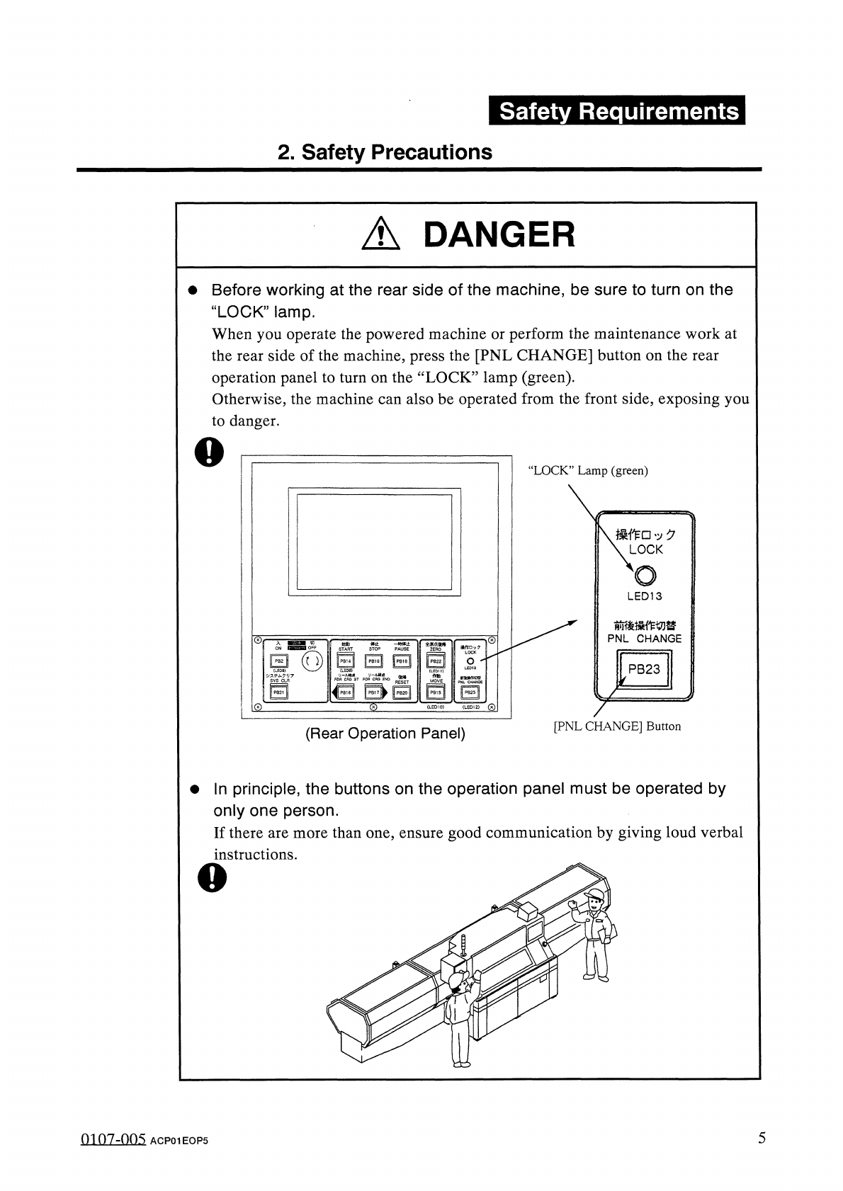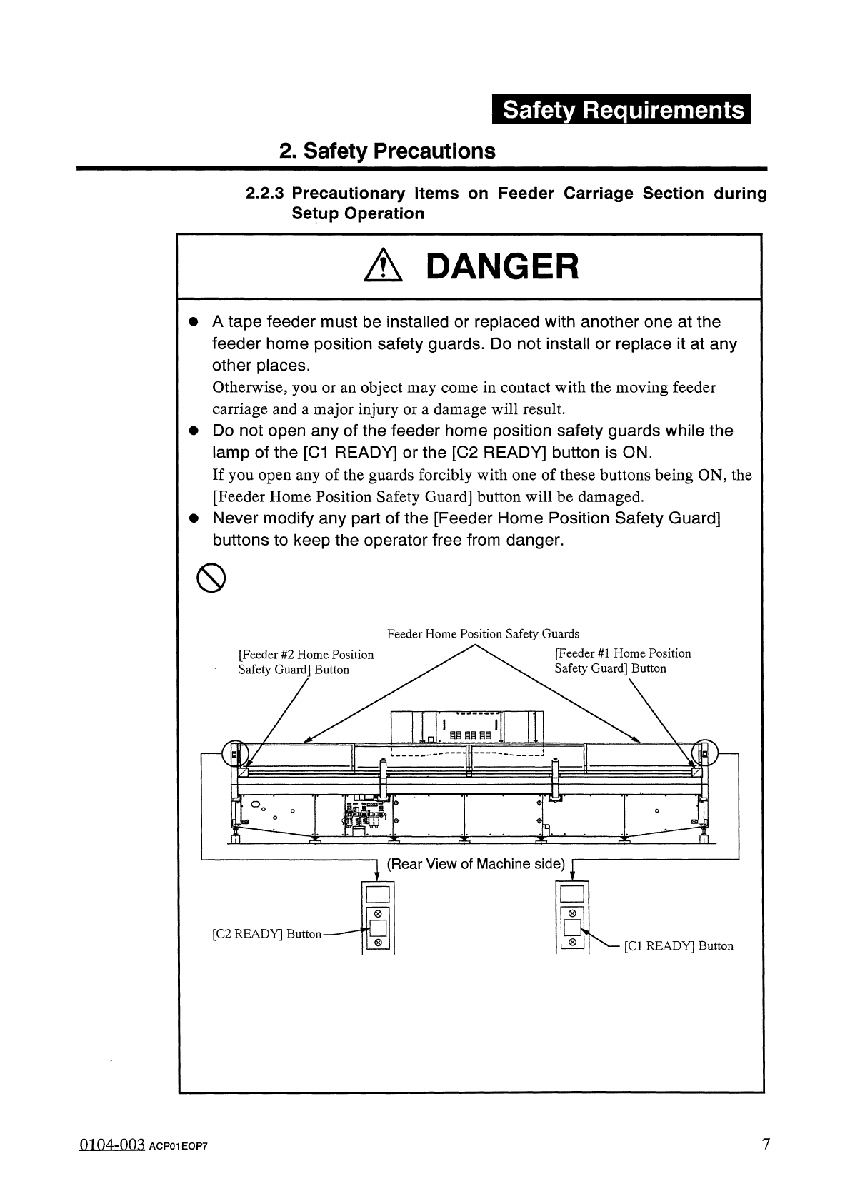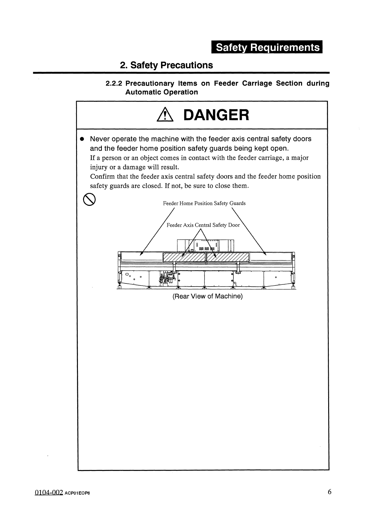 Safety Requirements 2 . Safety Precautions 2.2 . 2 Precautionary Items on Feeder Carriage Section during Automatic Operation A DANGER • Never operate the machine with the feeder axis central safety doors and the feeder h…
