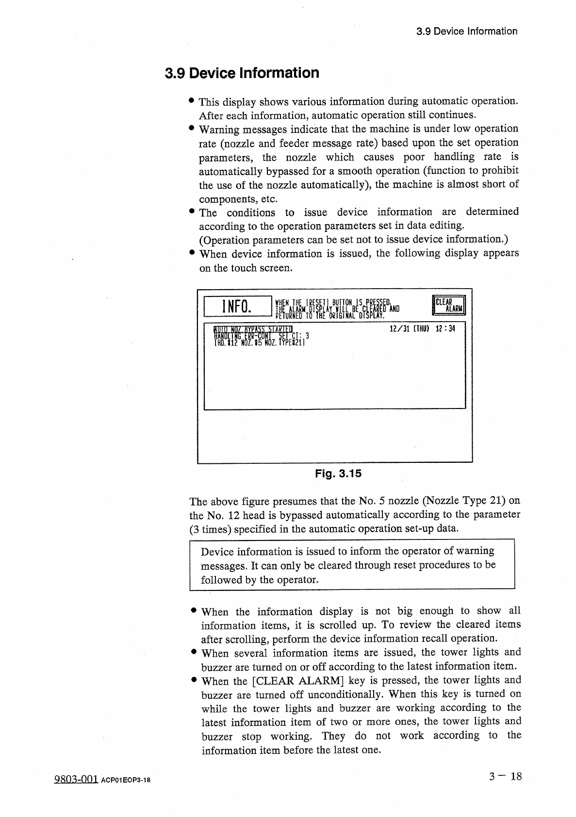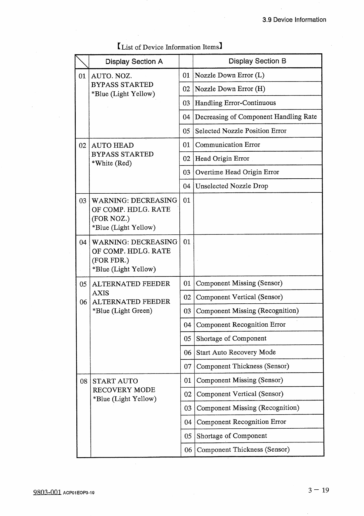 3.9 Device information 【 List of Device Information Items 】 Display Section B Display Section A 01 Nozzle Down Error ( L ) 01 AUTO . NOZ . BYPASS STARTED * Blue ( Light Yellow ) Nozzle Down Error ( H ) 02 Handling Error …