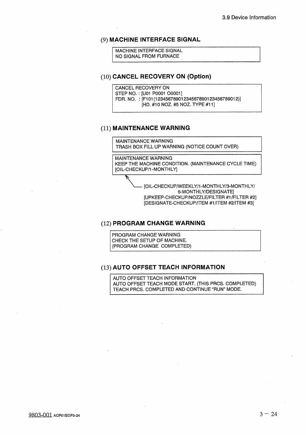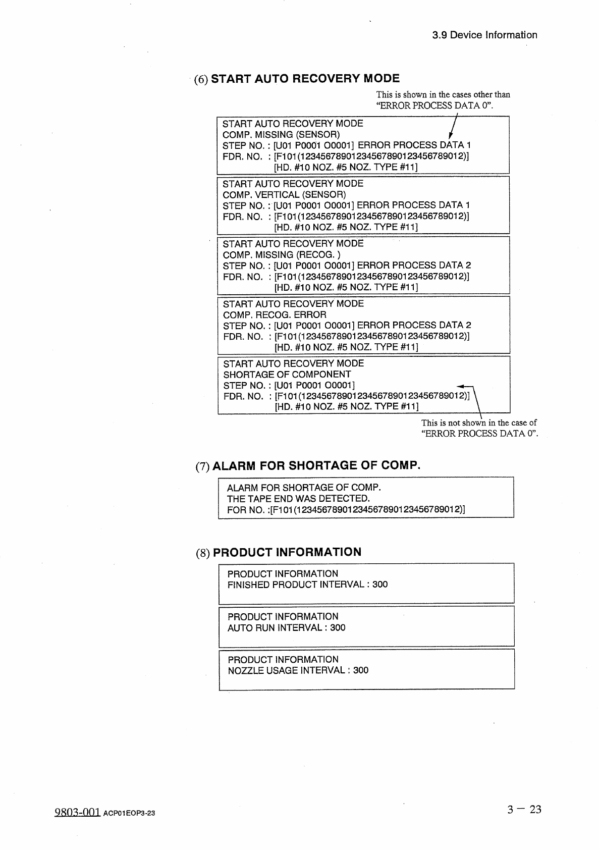 3.9 Device Information ( 6 ) START AUTO RECOVERY MODE This is shown in the cases other than “ ERROR PROCESS DATA 0 ” . START AUTO RECOVERY MODE COMP . MISSING ( SENSOR ) STEP NO . : [ U 01 P 0001 00001 ] ERROR PROCESS DA…