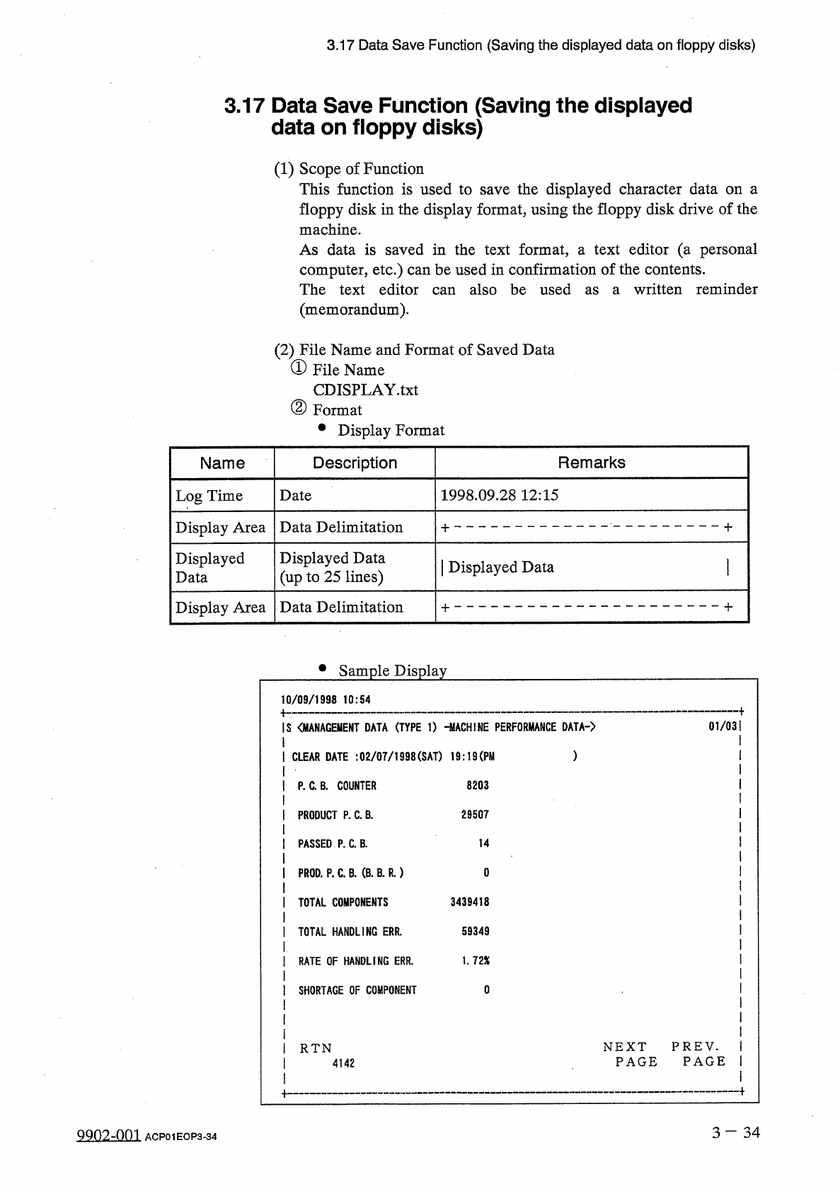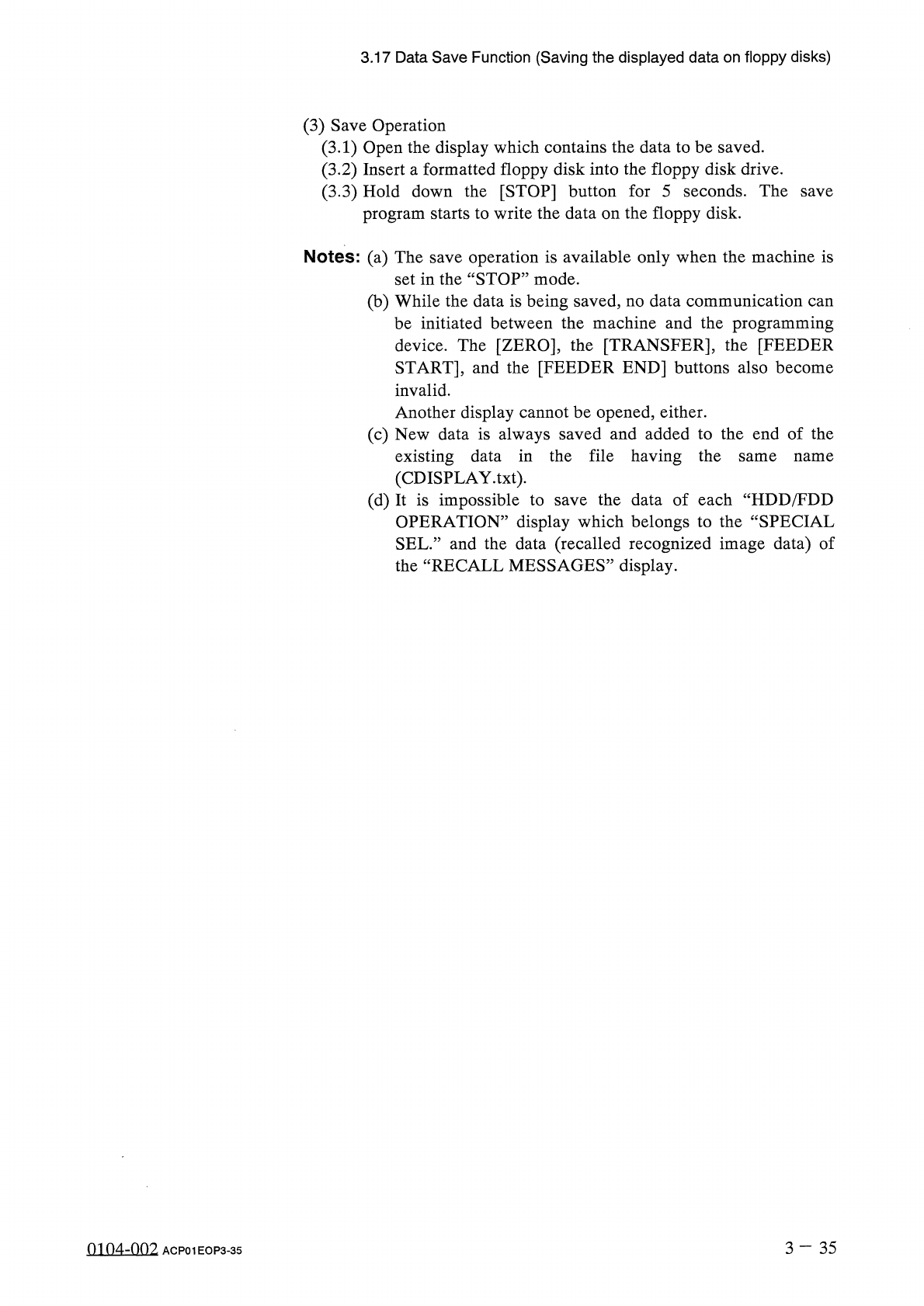 3.17 Data Save Function ( Saving the displayed data on floppy disks ) ( 3 ) Save Operation ( 3.1 ) Open the display which contains the data to be saved . ( 3.2 ) Insert a formatted floppy disk into the floppy disk drive …