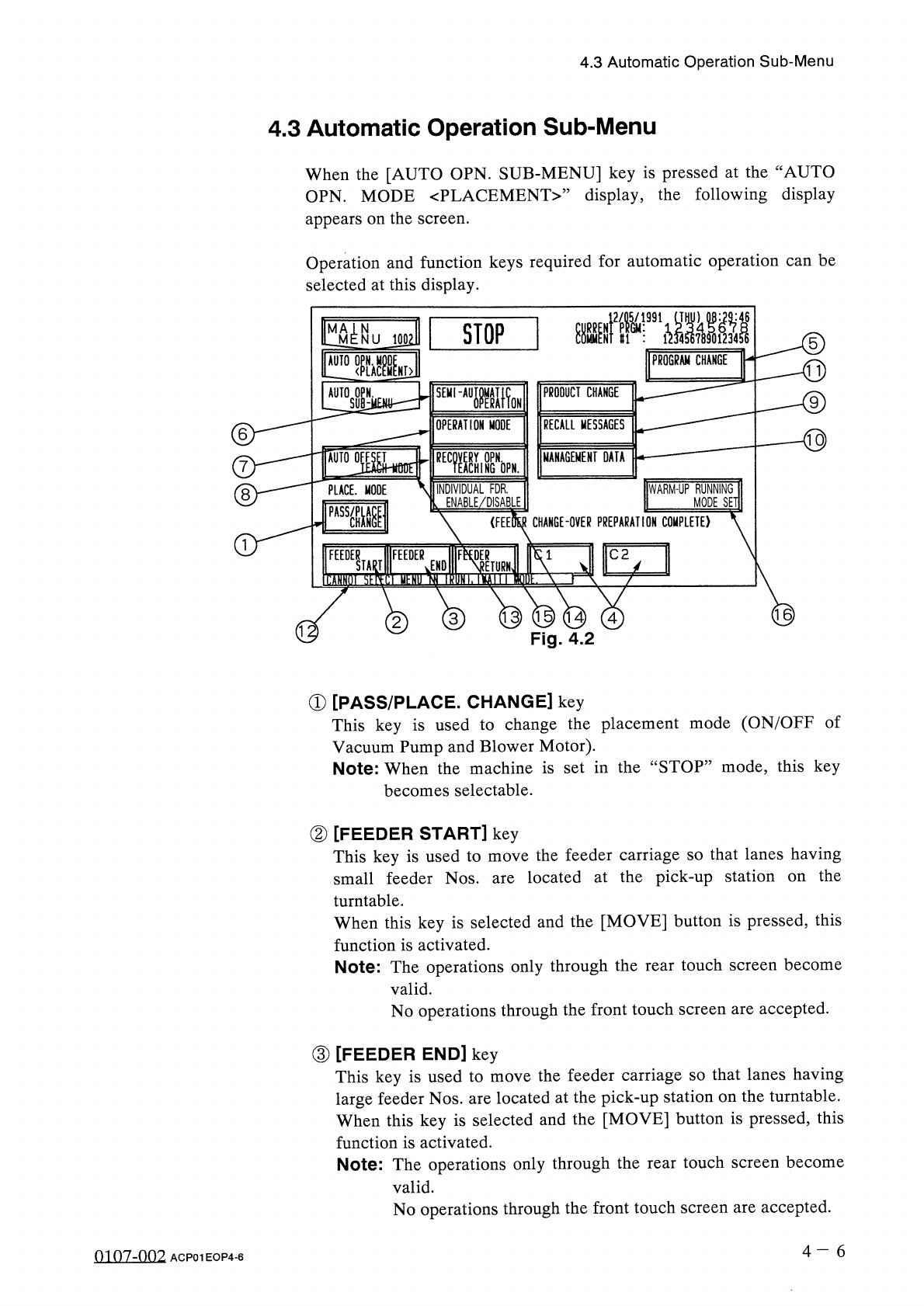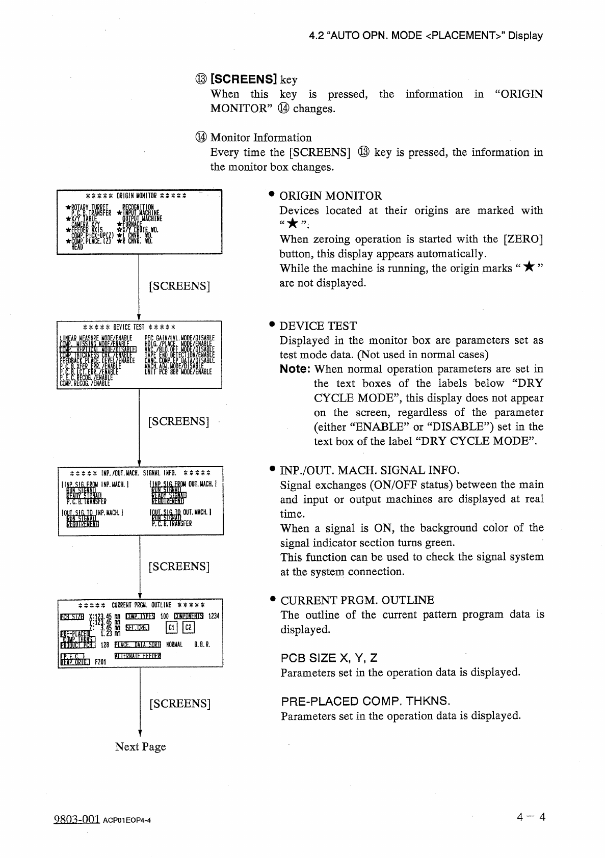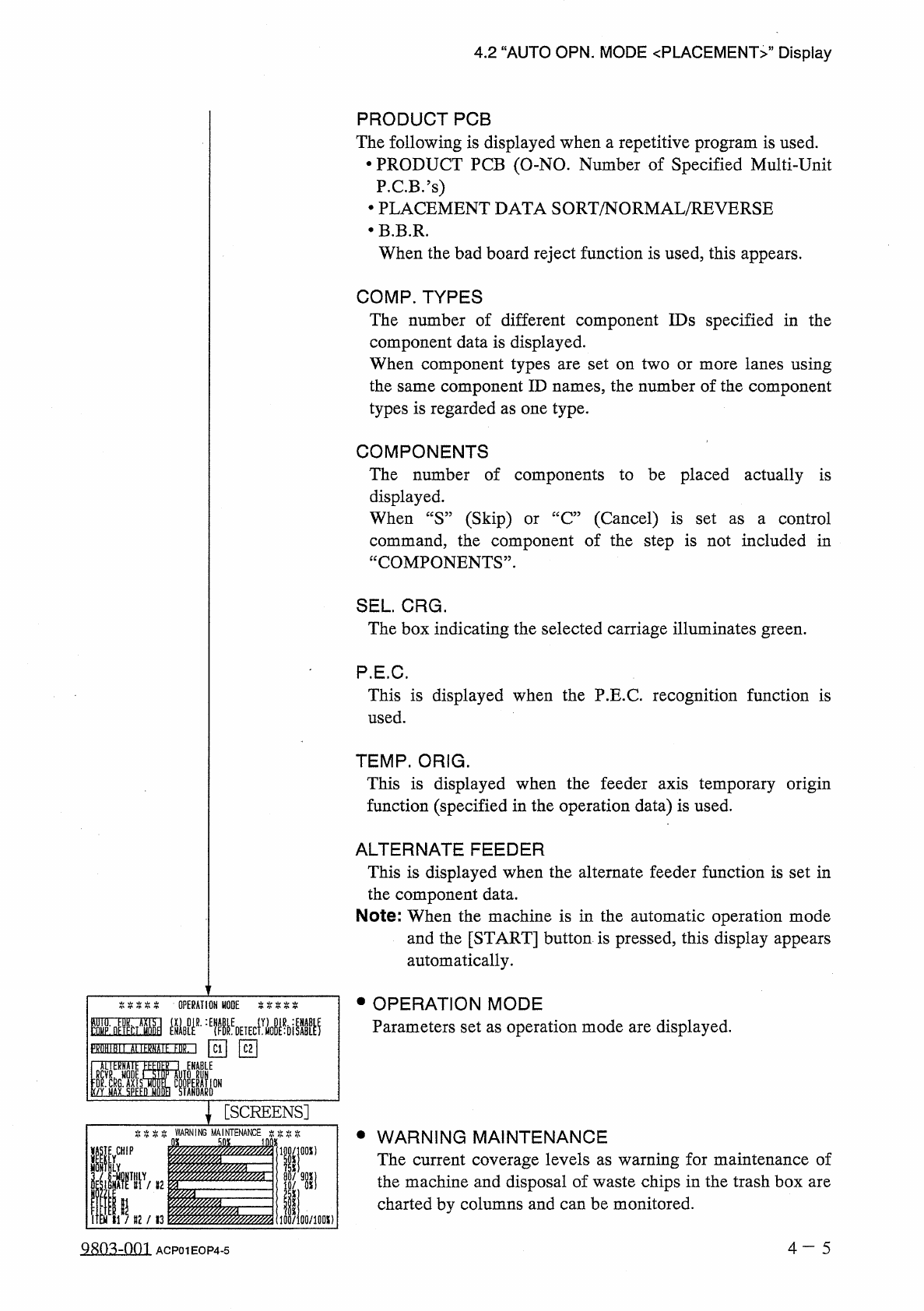 4.2 “ AUTO OPN . MODE 〈 PLACEMENT 〉 , , Display PRODUCT PCB The following is displayed when a repetitive program is used . • PRODUCT PCB ( O - NO . Number of Specified Multi - Unit P . C . B / s ) • PLACEMENT DATA SORT /…