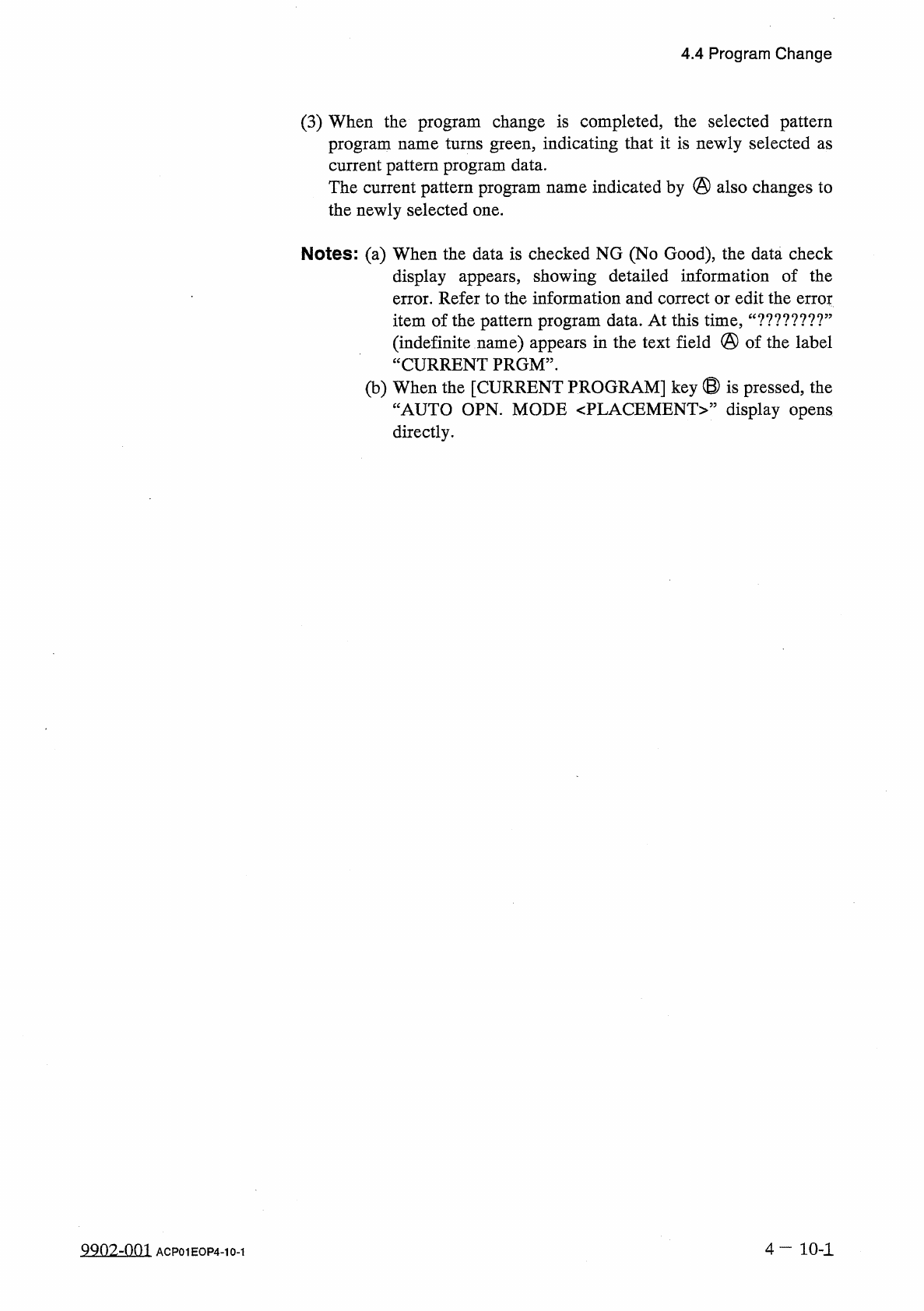 4.4 Program Change 4.4 Program Change When the [ PROGRAM CHANGE ] key is pressed at the “ AUTO OPN . SUB - MENU ” display , the following display appears on the screen . also be opened from the “ MANUAL MODE 2 This displ…