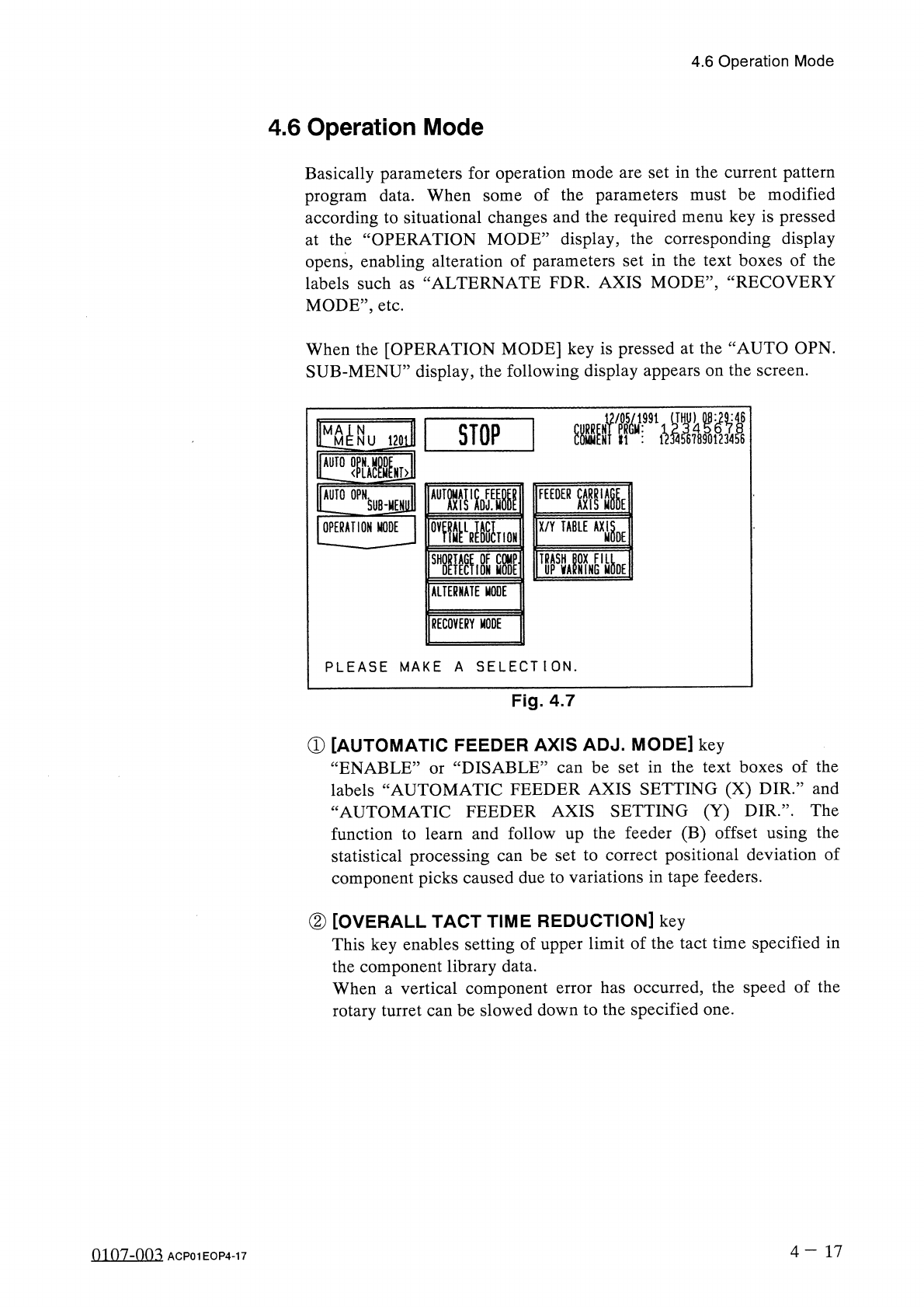 4.5 SEMI - AUTOMATIC OPERATION ⑥ [ FULL AUTO STEP [ MOVE ] ] Key When this key is selected and the [ MOVE ] button is pressed , the warm start function is activated . Ref . : The “ AUTO OPN . MODE 〈 PLACEMENT 〉 , , displ…