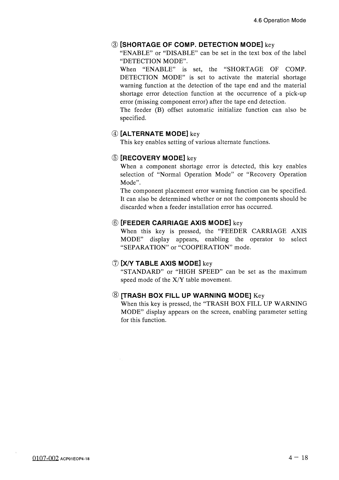 M | 6 ( AUTOMATIC FEEDER AXIS ADJUSTMENT DISABLE 11 ^ S ENABLE SET ENABLE ! C FEEDER AXIS ( X ) DIR . : DISABLE 觀 DISABLE ■ 疆 MV FQl [ S E T 4.6 Operation Mode 4.6 . 1 AUTOMATIC FEEDER AXIS ADJ . MODE • The difference be…