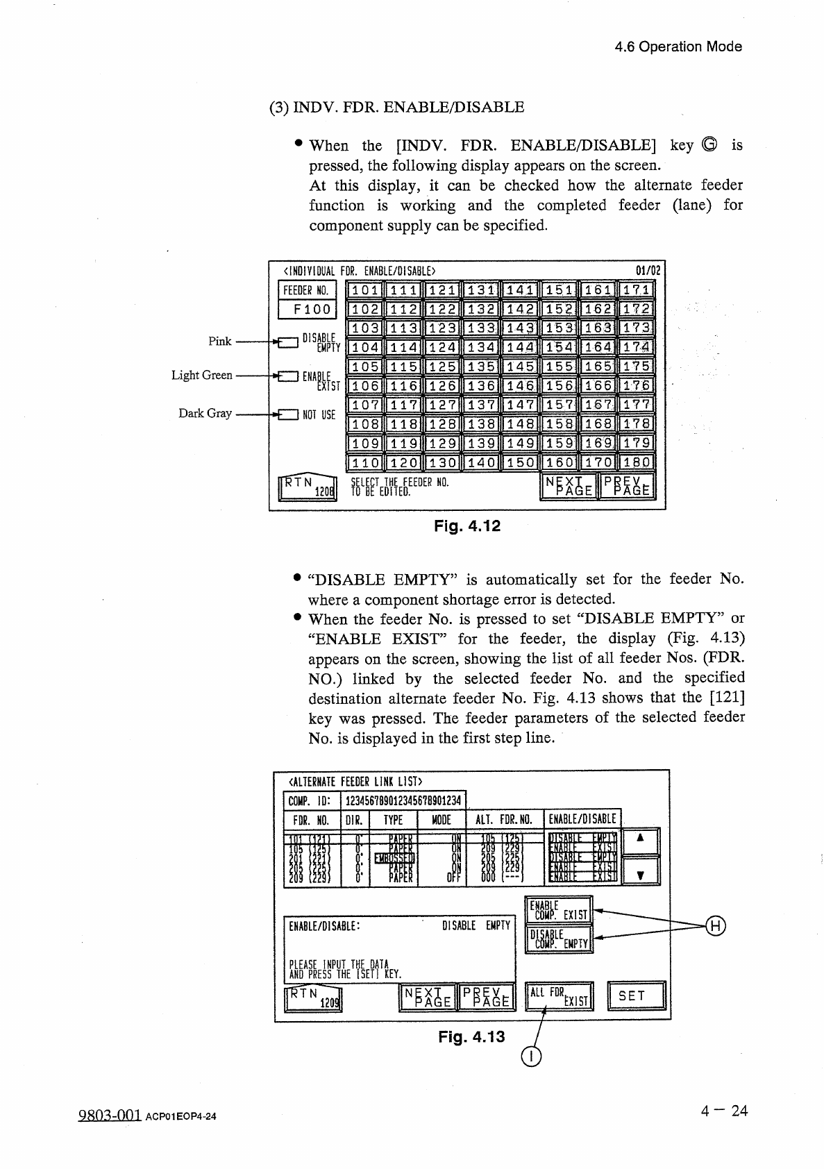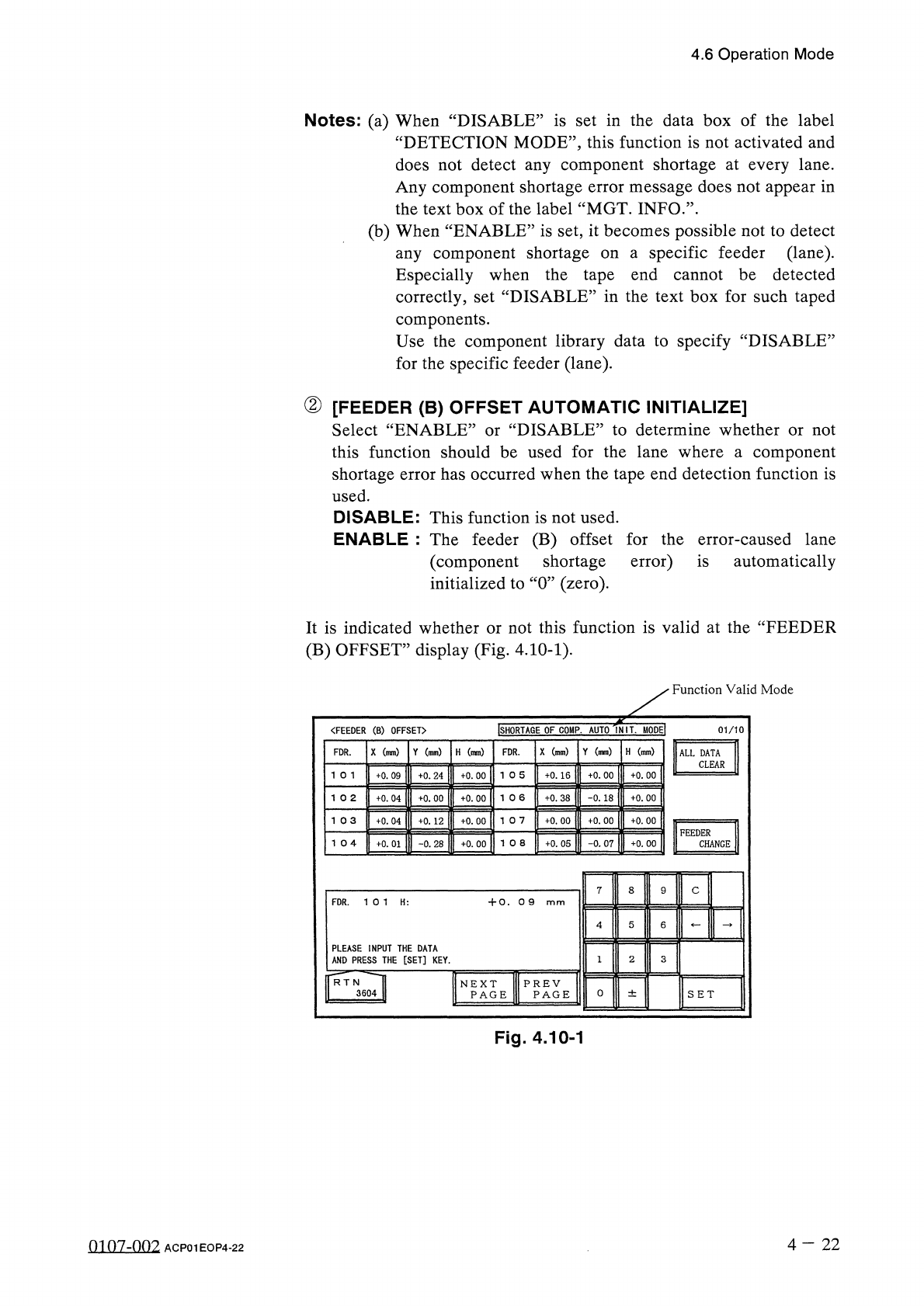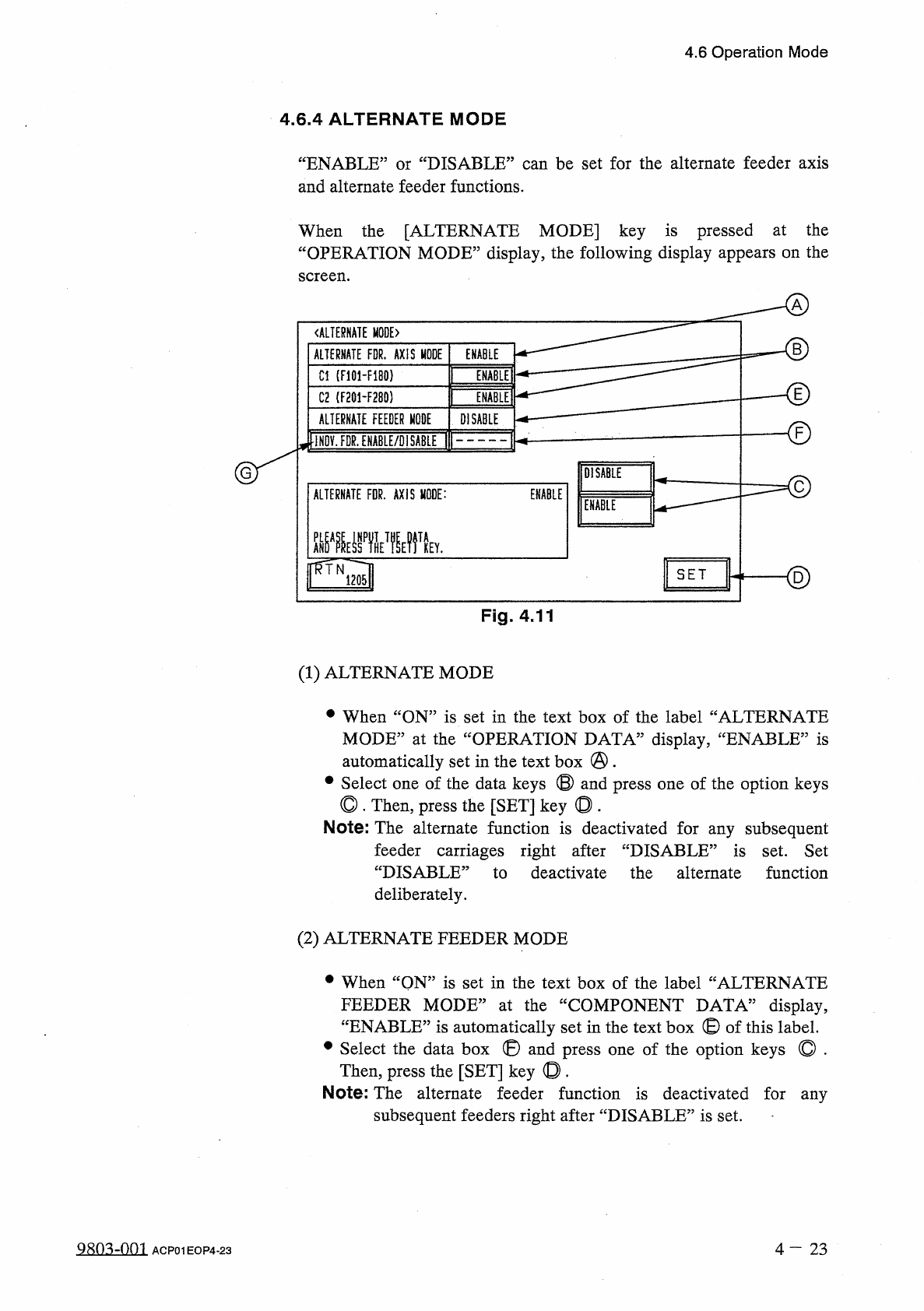 4.6 Operation Mode 4.6 . 4 ALTERNATE MODE “ ENABLE ” or “ DISABLE ” can be set for the alternate feeder axis and alternate feeder functions . When the [ ALTERNATE MODE ] key is pressed at the “ OPERATION MODE ” display ,…