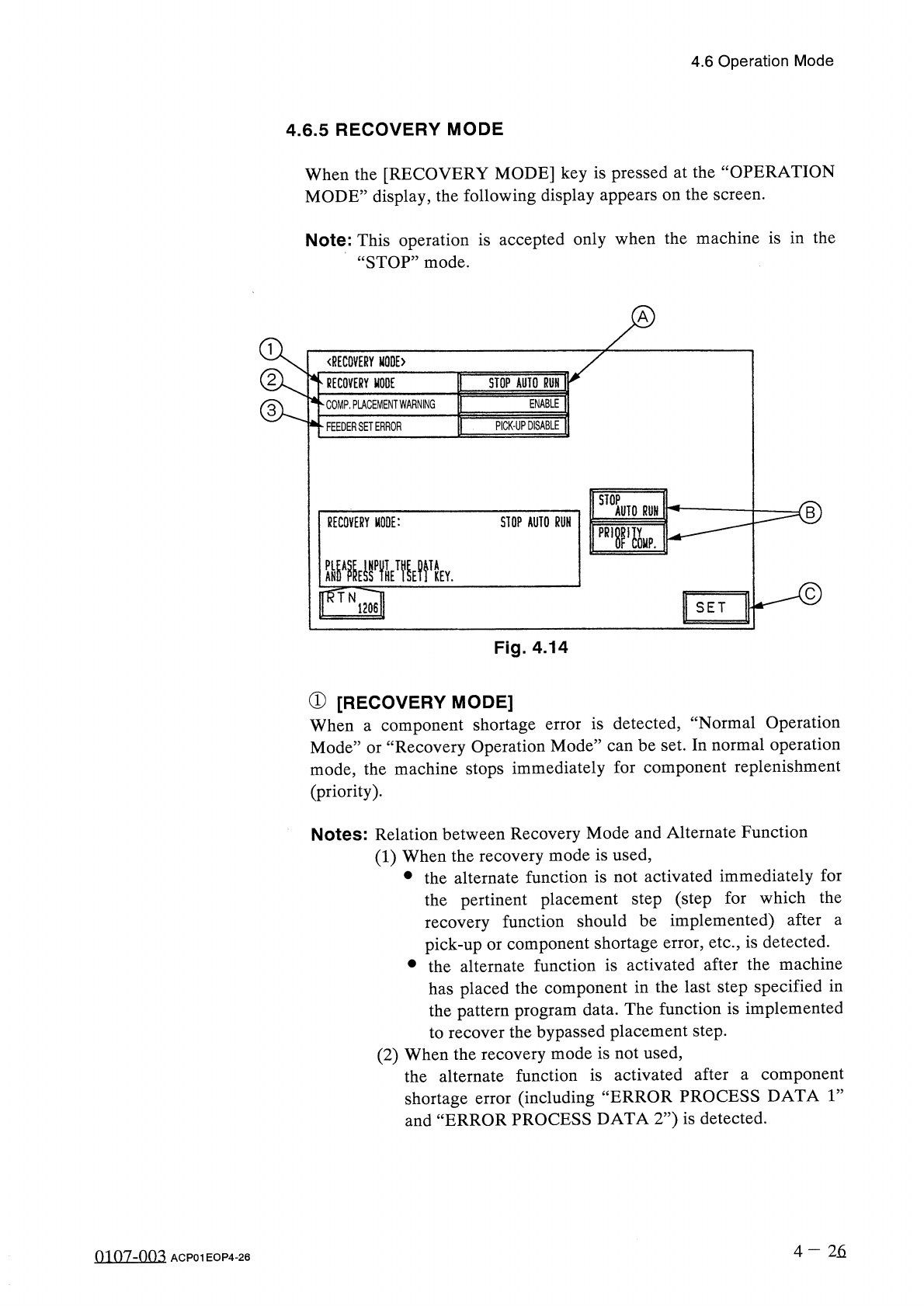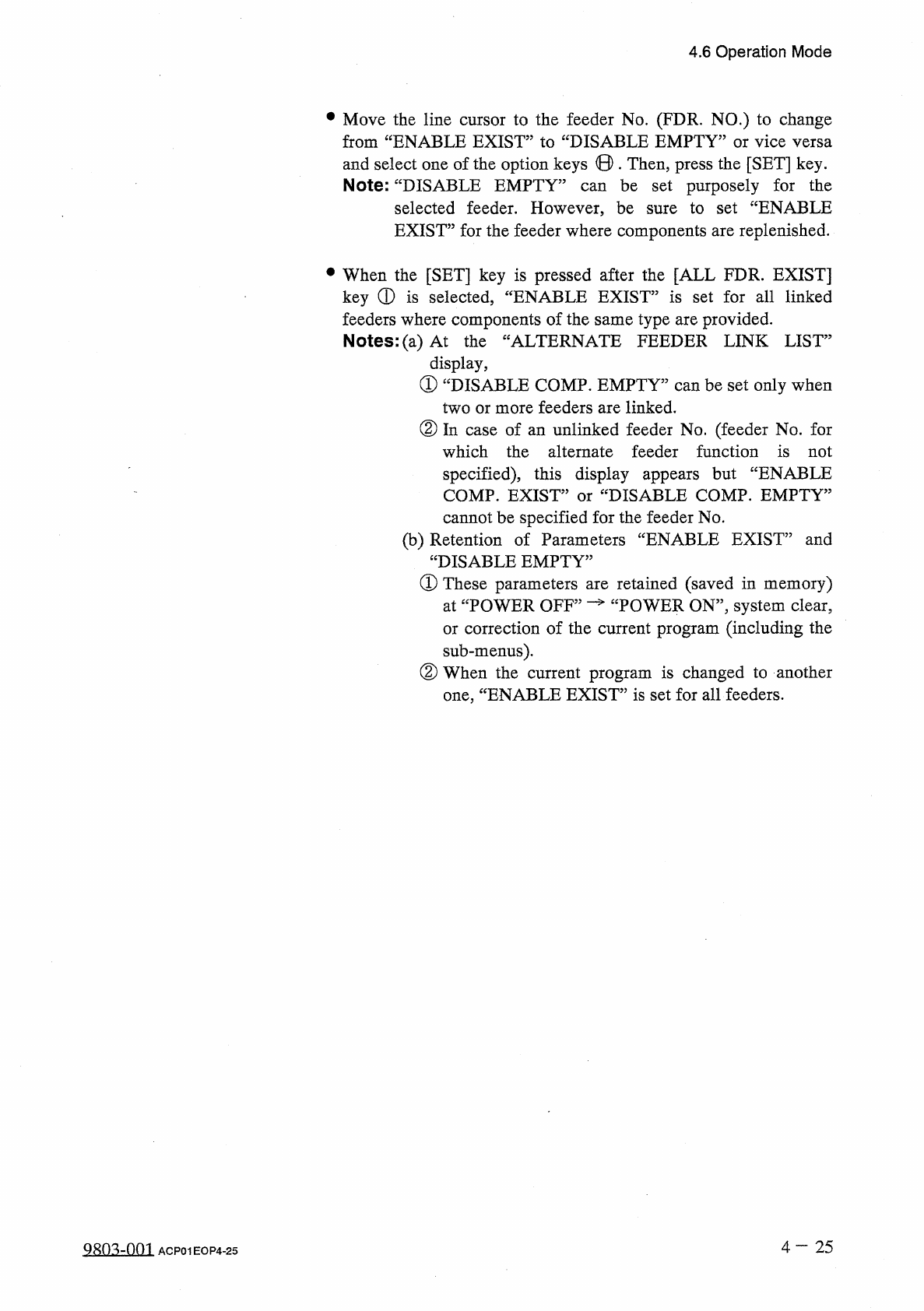 4.6 Operation Mode • Move the line cursor to the feeder No . ( FDR . NO . ) to change from “ ENABLE EXIST ” to “ DISABLE EMPTY ” or vice versa and select one of the option keys © . Then , press the [ SET ] key . Note : “…