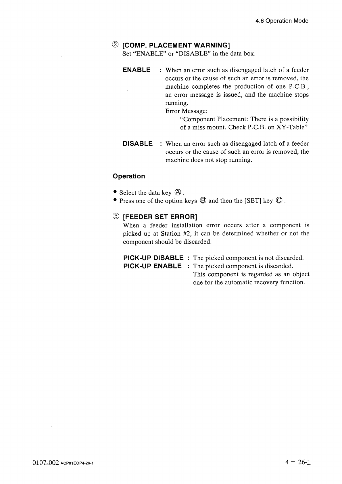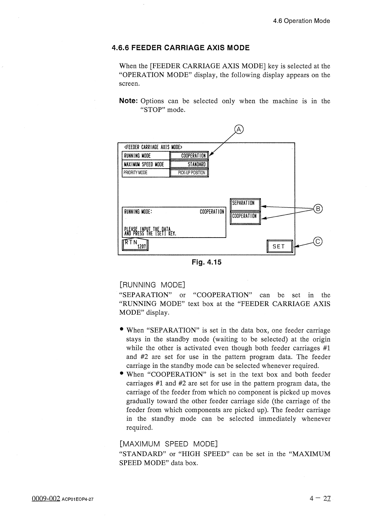 4.6 Operation Mode 4.6 . 6 FEEDER CARRIAGE AXIS MODE When the [ FEEDER CARRIAGE AXIS MODE ] key is selected at the “ OPERATION MODE ” display , the following display appears on the screen . Note : Options “ STOP ” mode .…