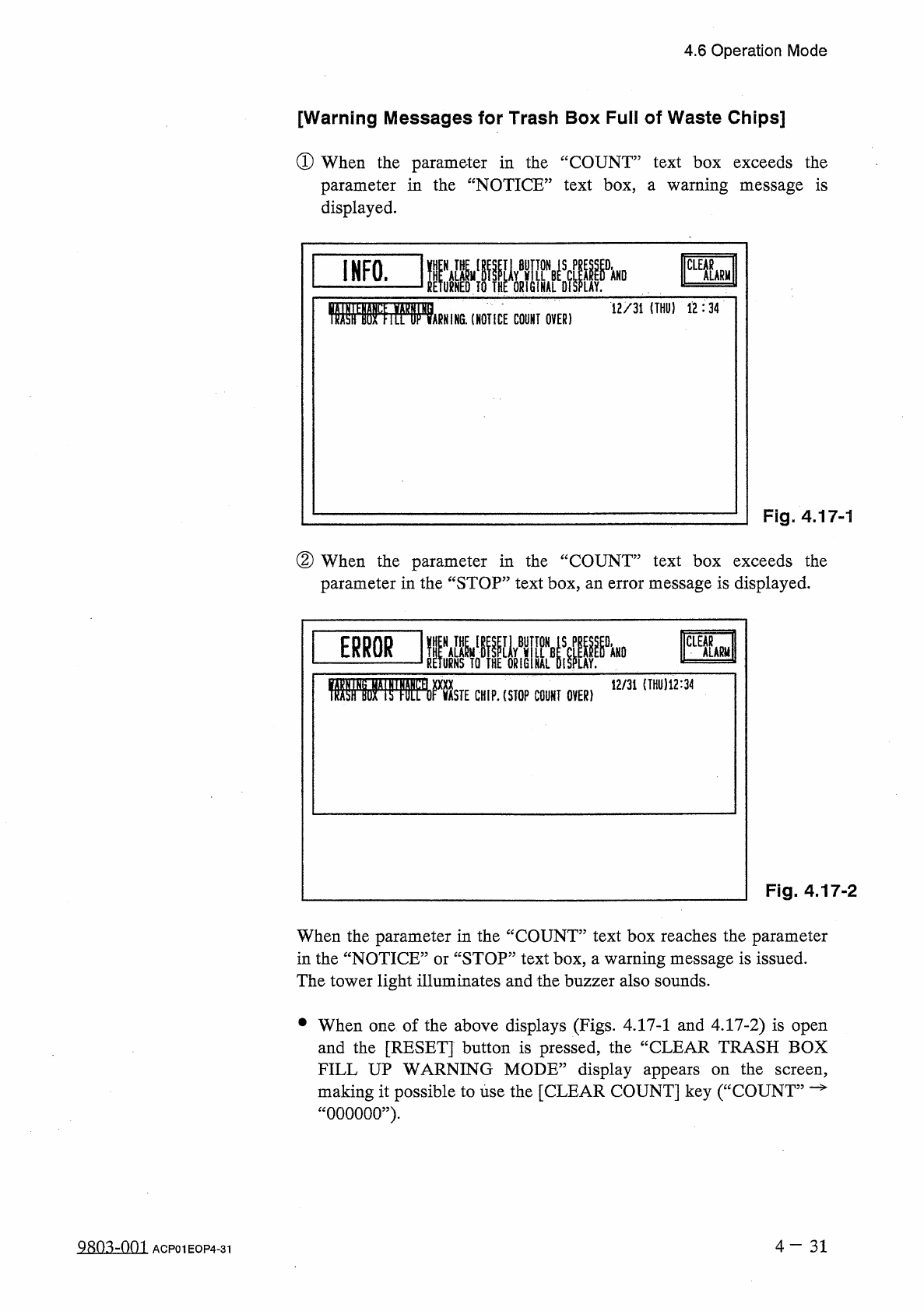 4.6 Operation Mode [ Warning Messages for Trash Box Full of Waste Chips ] ① When the parameter in the “ COUNT parameter in the “ NOTICE ” text box , a warning message is displayed . text box exceeds the B 圏 CLEAR I INFO …