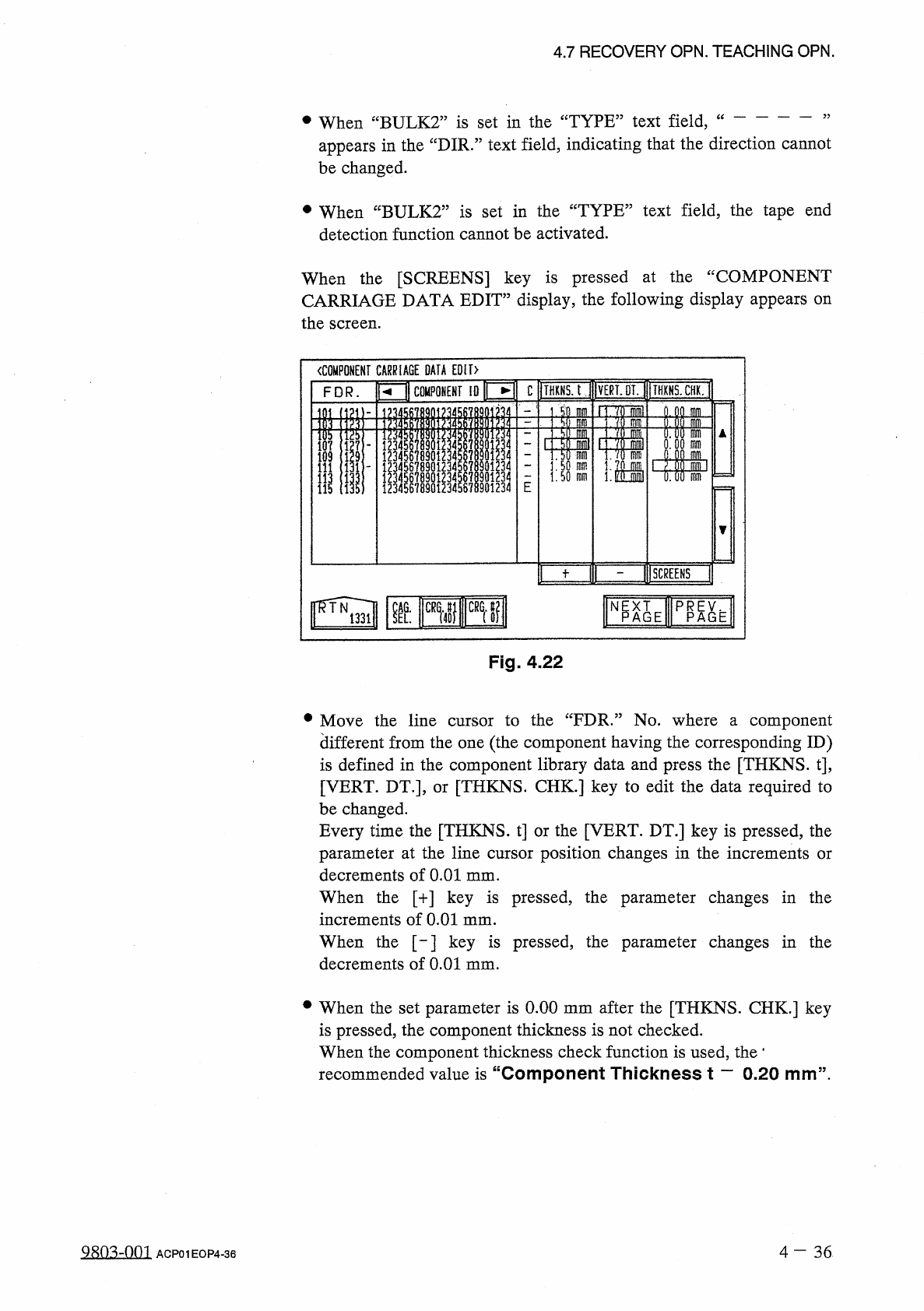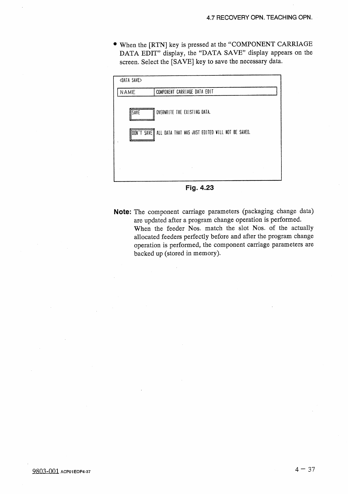 4.7 RECOVERY OPN . TEACHING OPN . at the “ COMPONENT CARRIAGE • When the [ RTN ] key is pressed DATA EDIT ” display , the “ DATA SAVE ” display appears on the screen . Select the [ SAVE ] key to save the necessary data .…