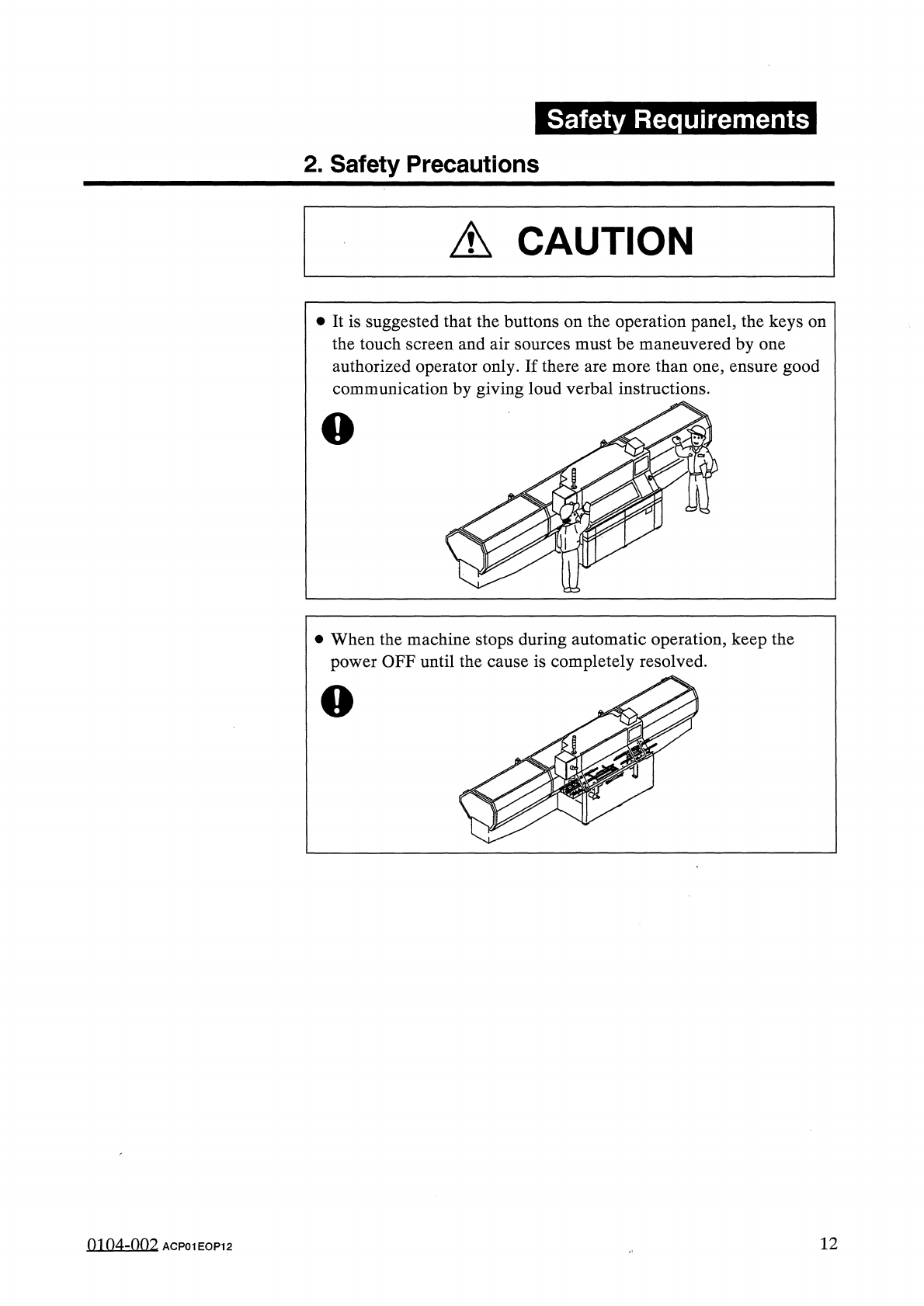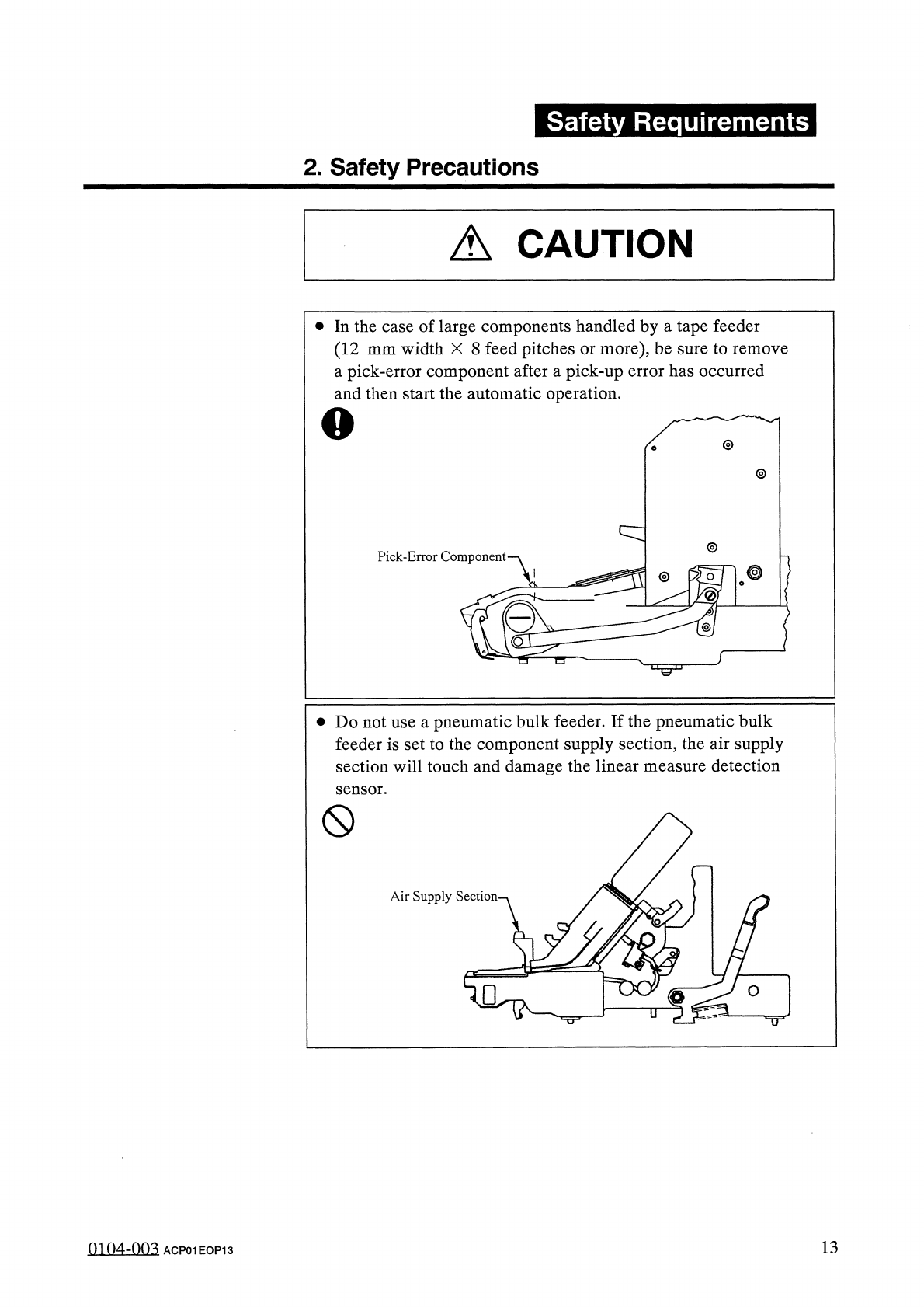 Safety Requirements 2 . Safety Precautions A CAUTION • In the case of large components handled by a tape feeder ( 12 mm width X 8 feed pitches or more ) , be sure to remove a pick - error component after a pick - up erro…