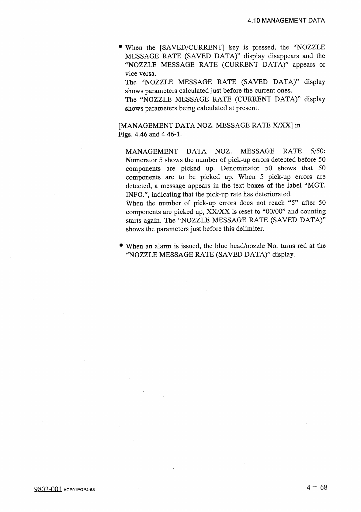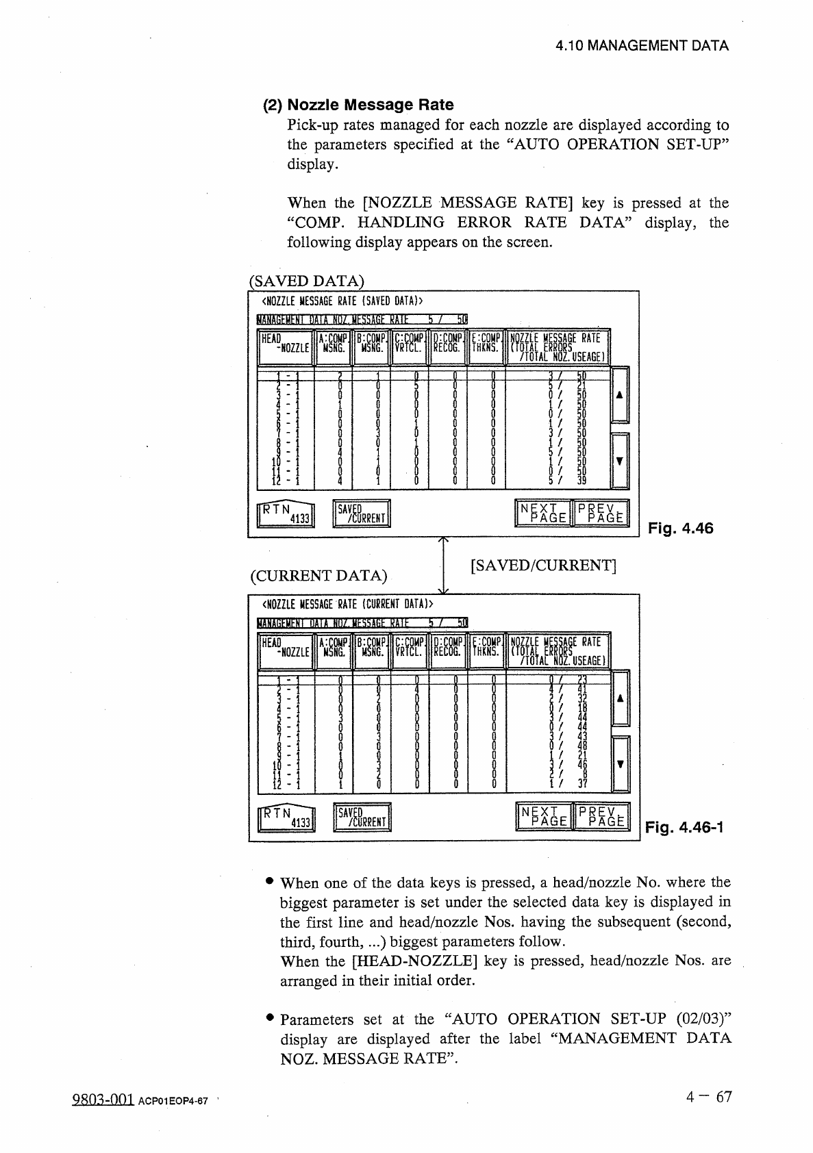 〈 NOZZLE MESSAGE RATE ( CURRENT DATA ) 〉 BfflSEBEHEIBn HDZ 3 ESSSE 15 IE b / bOI : COMP . HEAD A : HKNS . • NOZZLE M Fig . 4.46 - 1 N p X T — P ^ AGE A G E Fig . 4.46 [ SAVED / CURRENT ] ( CURRENT DATA ) • When one of th…
