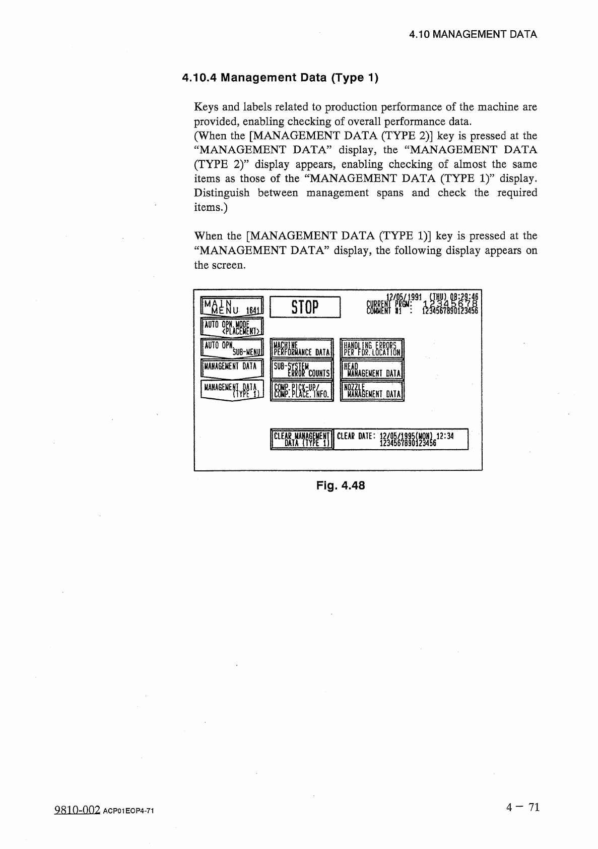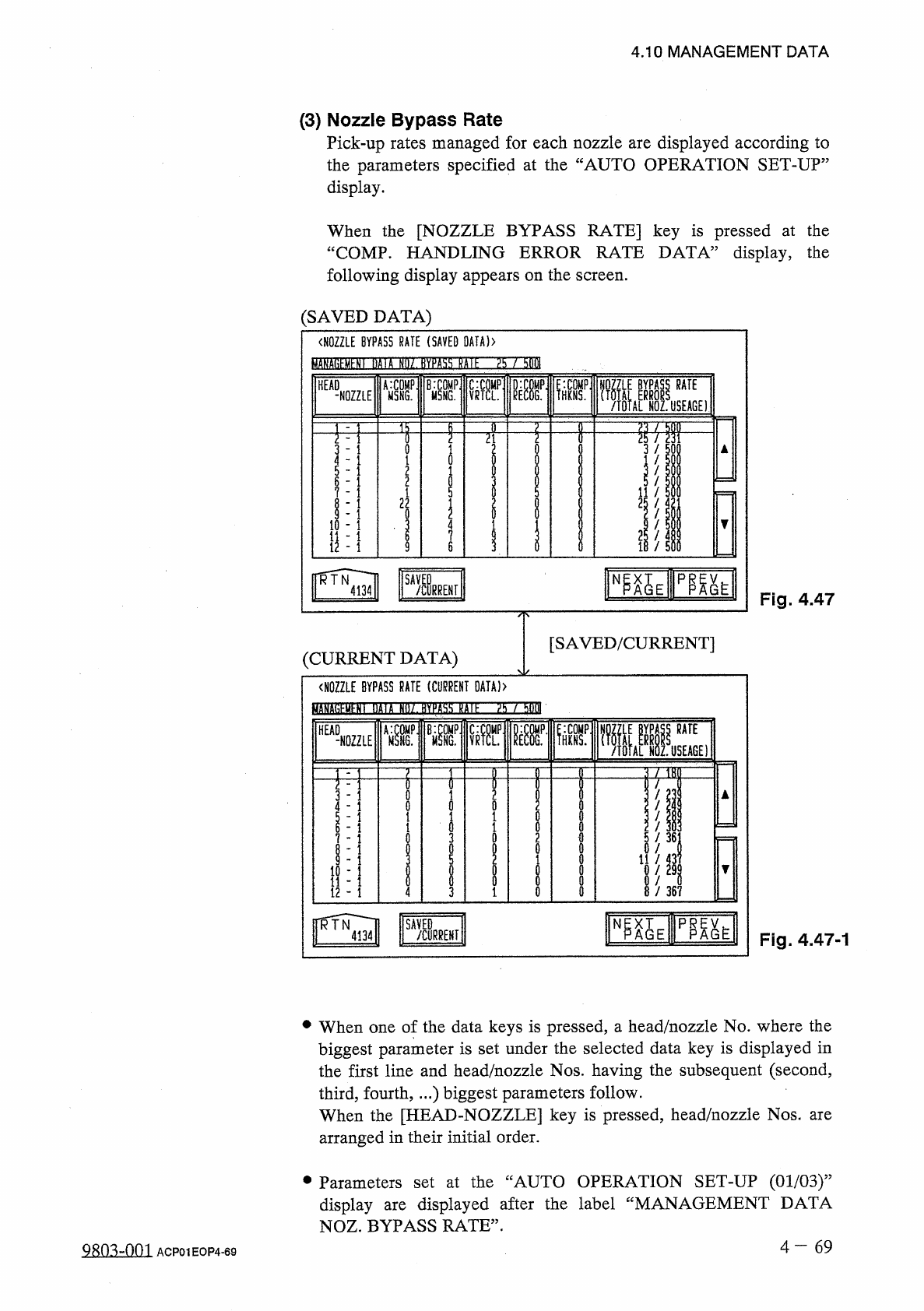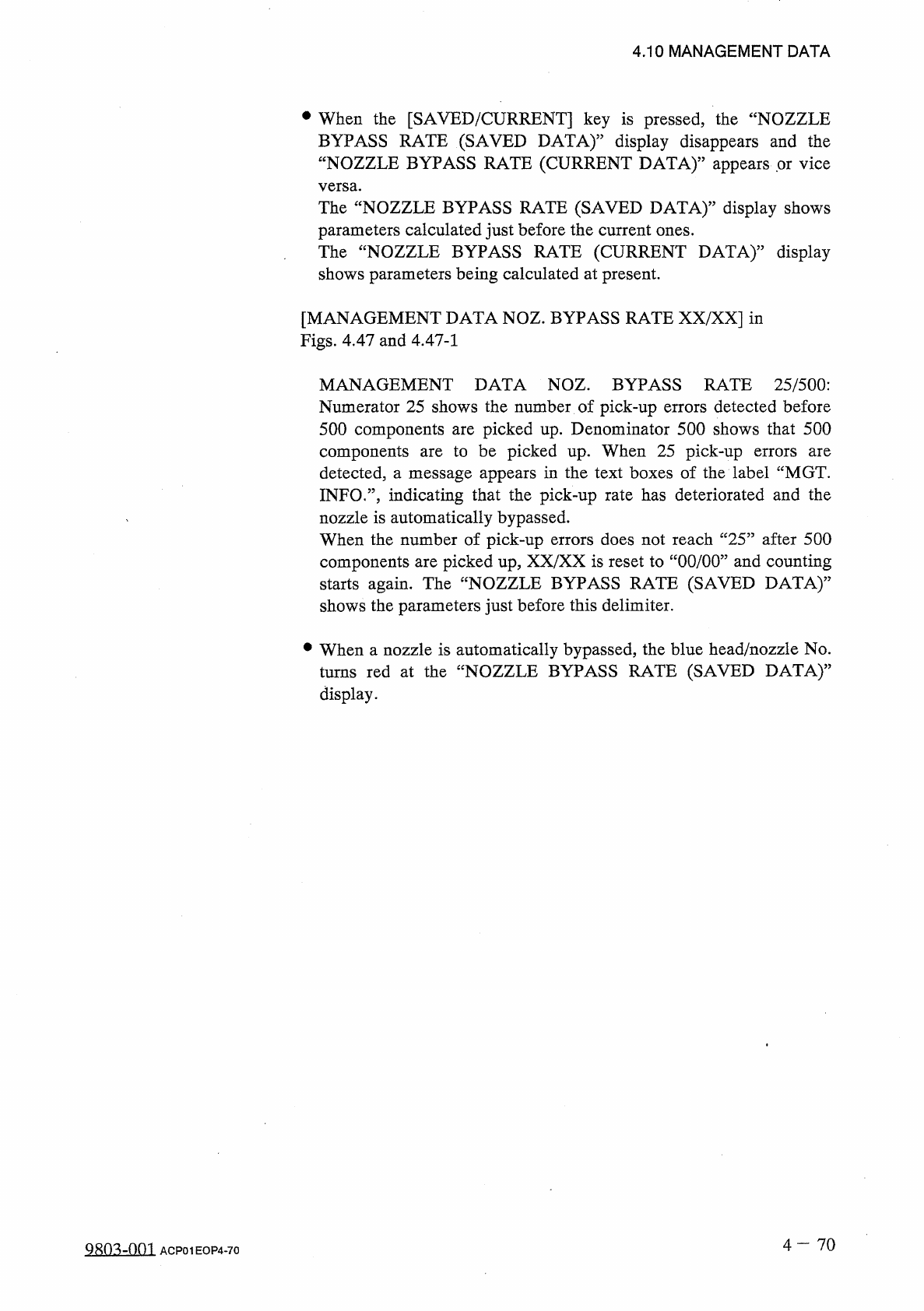 4.10 MANAGEMENT DATA • When the [ SAVED / CURRENT ] key is pressed , the “ NOZZLE BYPASS RATE ( SAVED DATA ) , , display disappears and the “ NOZZLE BYPASS RATE ( CURRENT DATA ) , , appears or vice versa . The “ NOZZLE B…