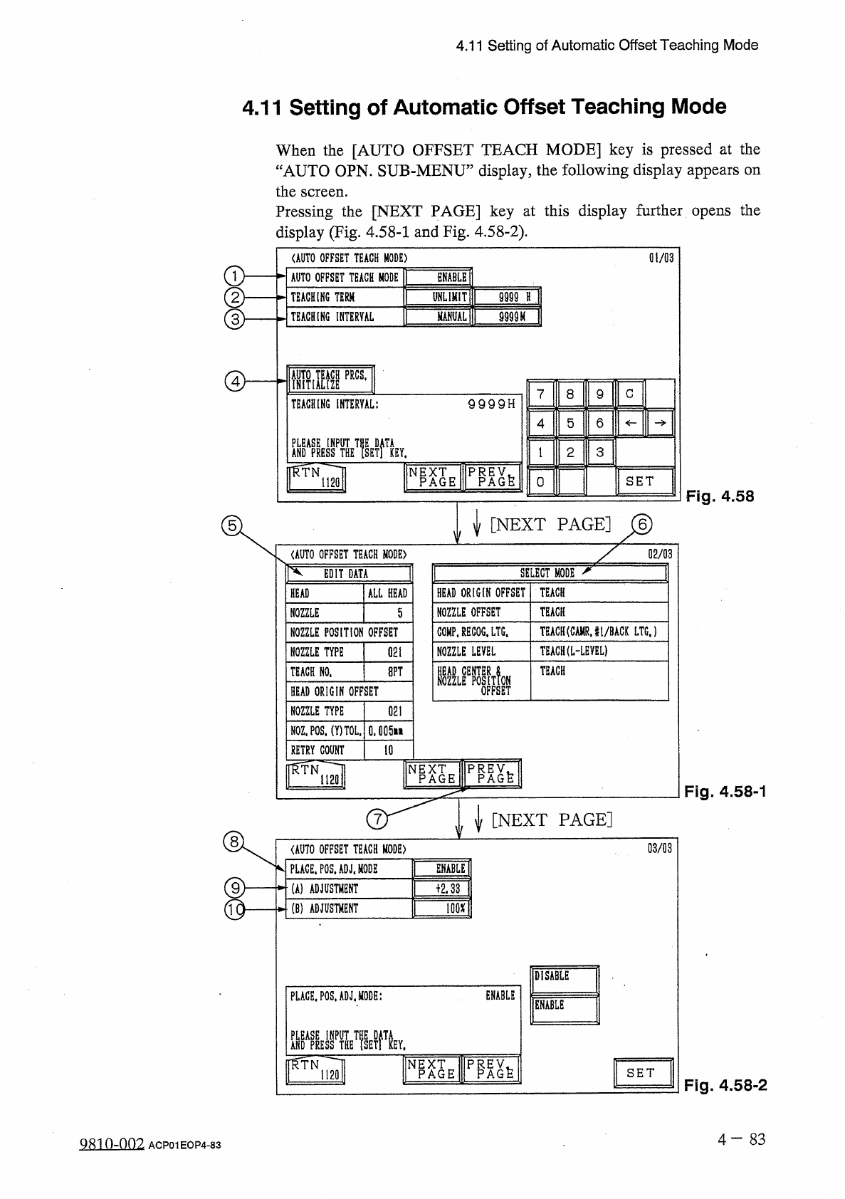 4.11 Setting of Automatic Offset Teaching Mode ( First Page ) This is protected by the password in the same level as that of the teaching session ( various head / nozzle offset data ) . ① AUTO OFFSET TEACH MODE When “ EN…