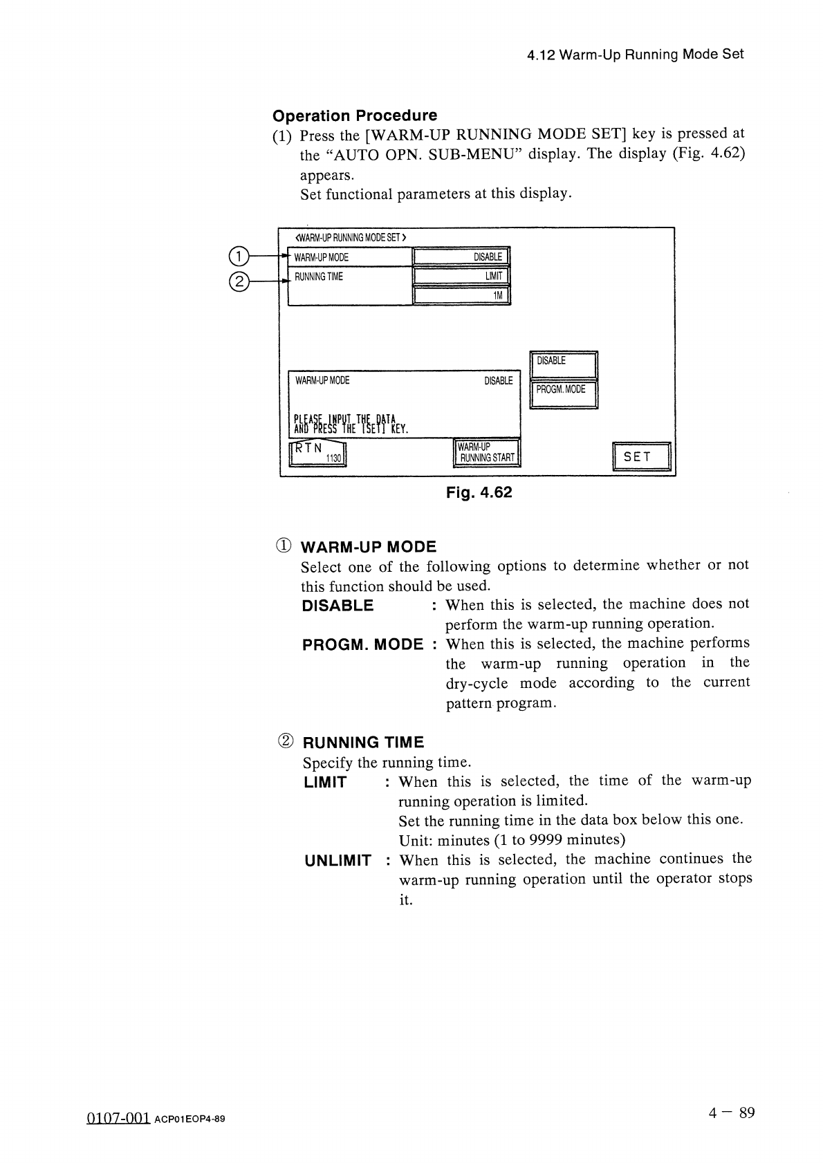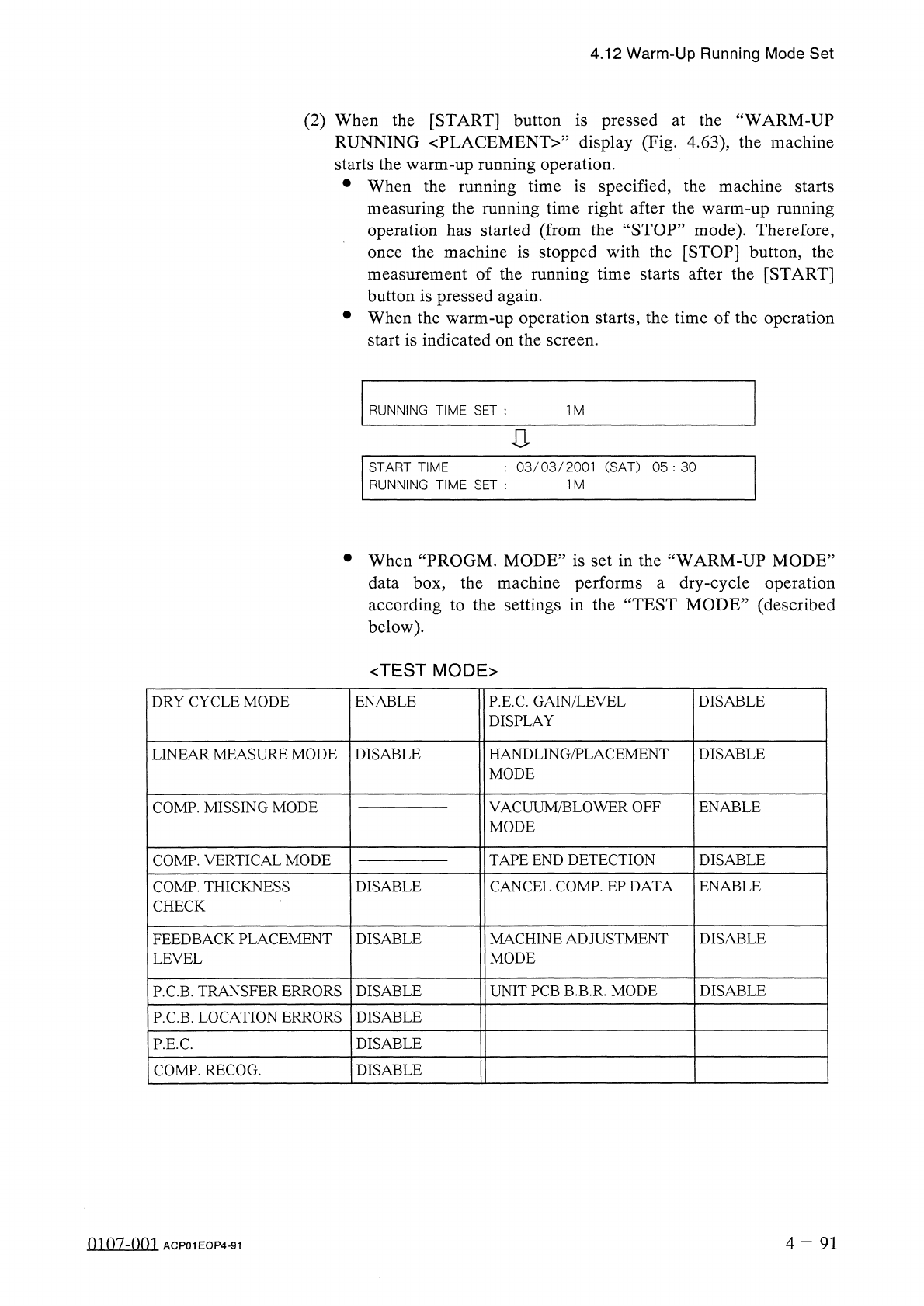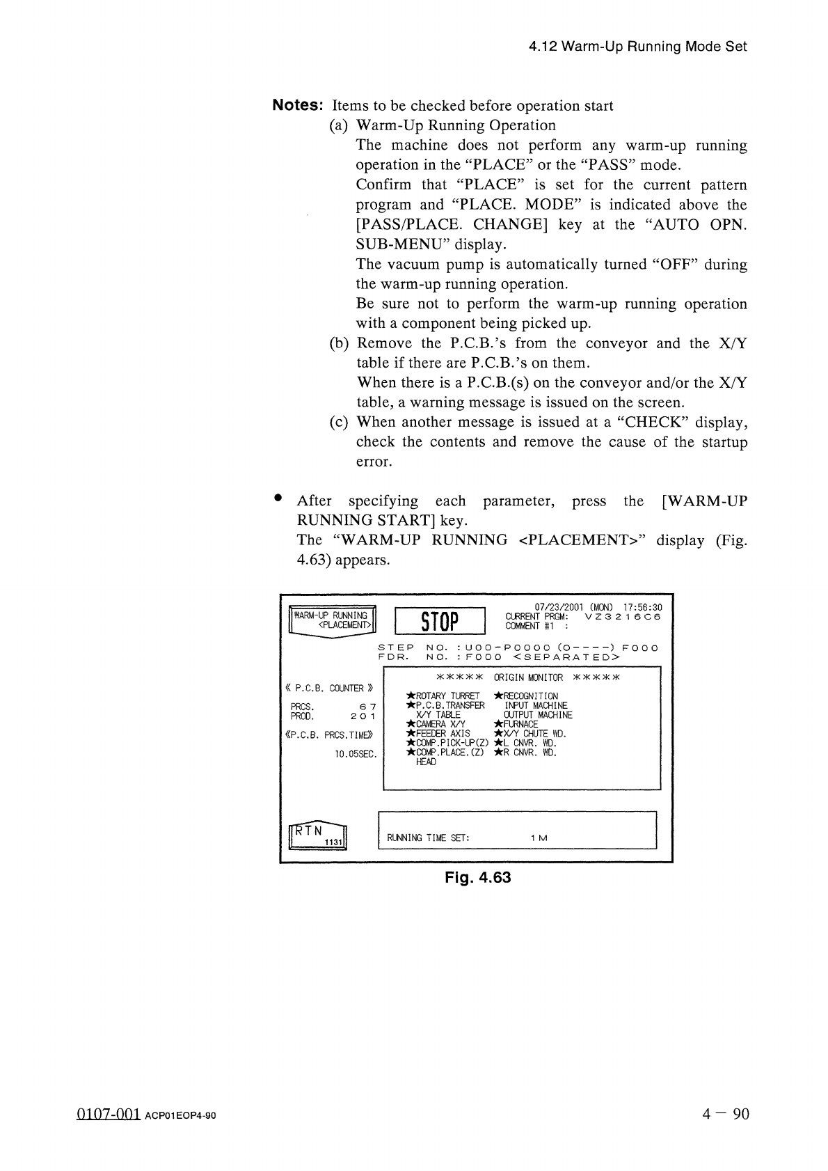4.12 Warm - Up Running Mode Set Notes : Items to be checked before operation start ( a ) Warm - Up Running Operation The machine does not perform any warm - up running operation in the “ PLACE ” or the “ PASS ” mode . Co…