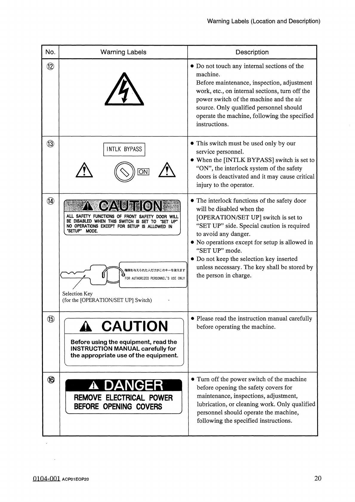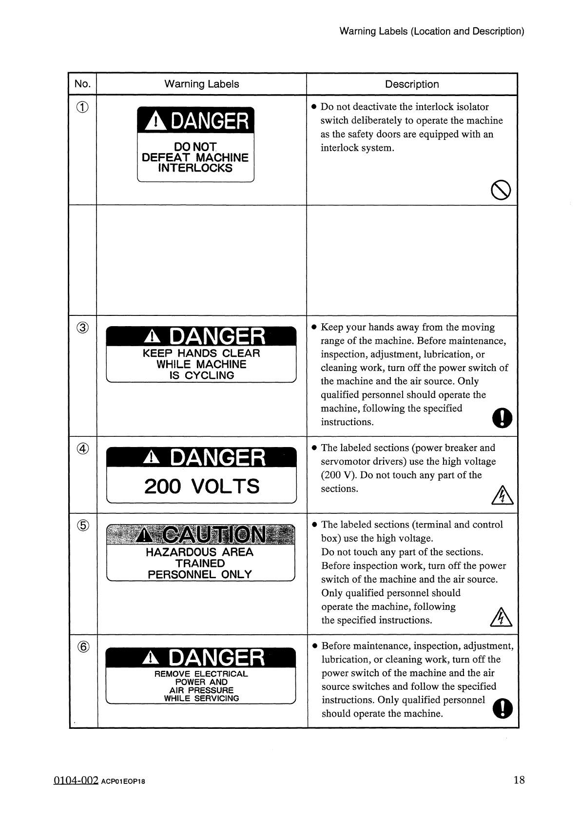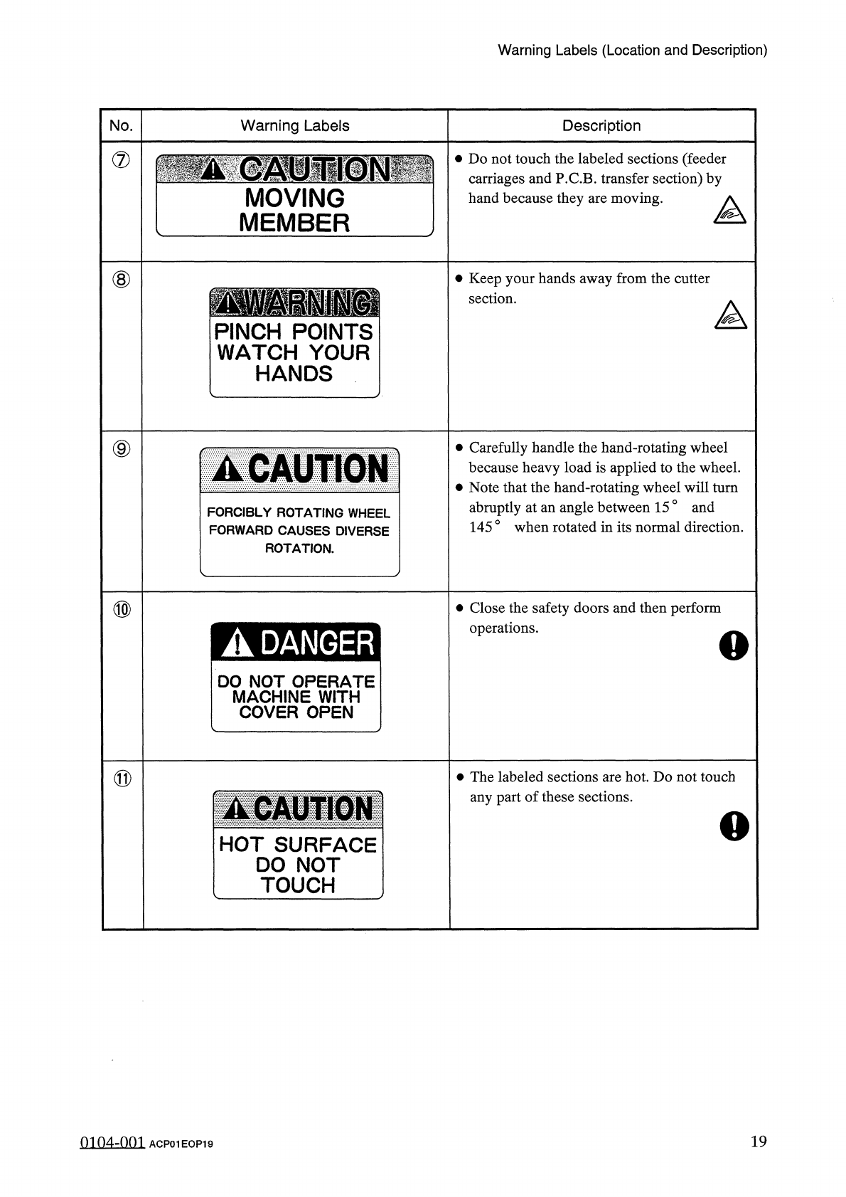Warning Labels ( Location and Description ) No . Warning Labels Description ⑦ • Do not touch the labeled sections ( feeder carriages and P . C . B . transfer section ) by hand because they are moving . MOVING MEMBER ⑧ • …