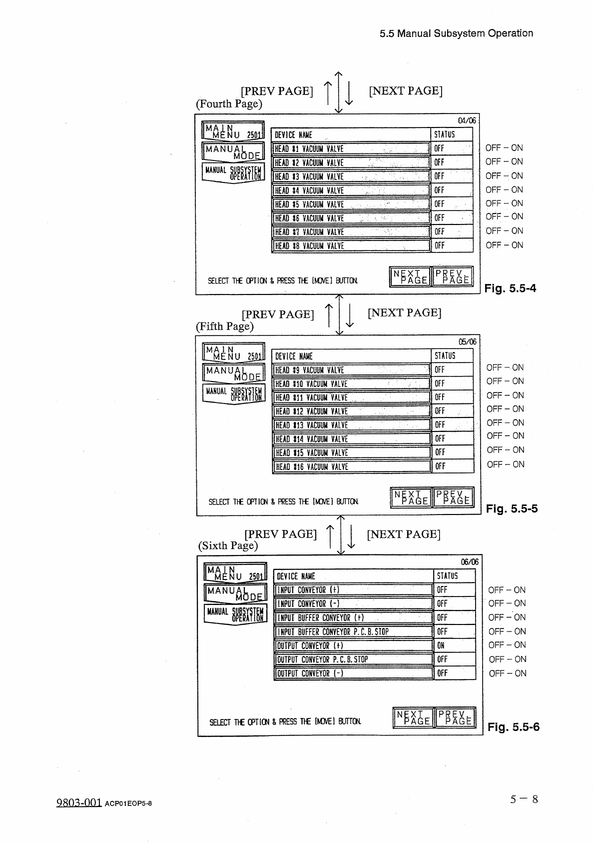 5.5 Manual Subsystem Operation [ NEXT PAGE ] [ PREY PAGE ] ( Fourth Page ) 04 / 06 m Eg : ! N STATUS DEVICE NAME N U 2 5 0 L 3 OFF - ON OFF - ON OFF - ON OFF - ON OFF - ON OFF - ON OFF - ON OFF - ON DFF HEAD II VACUUM VA…