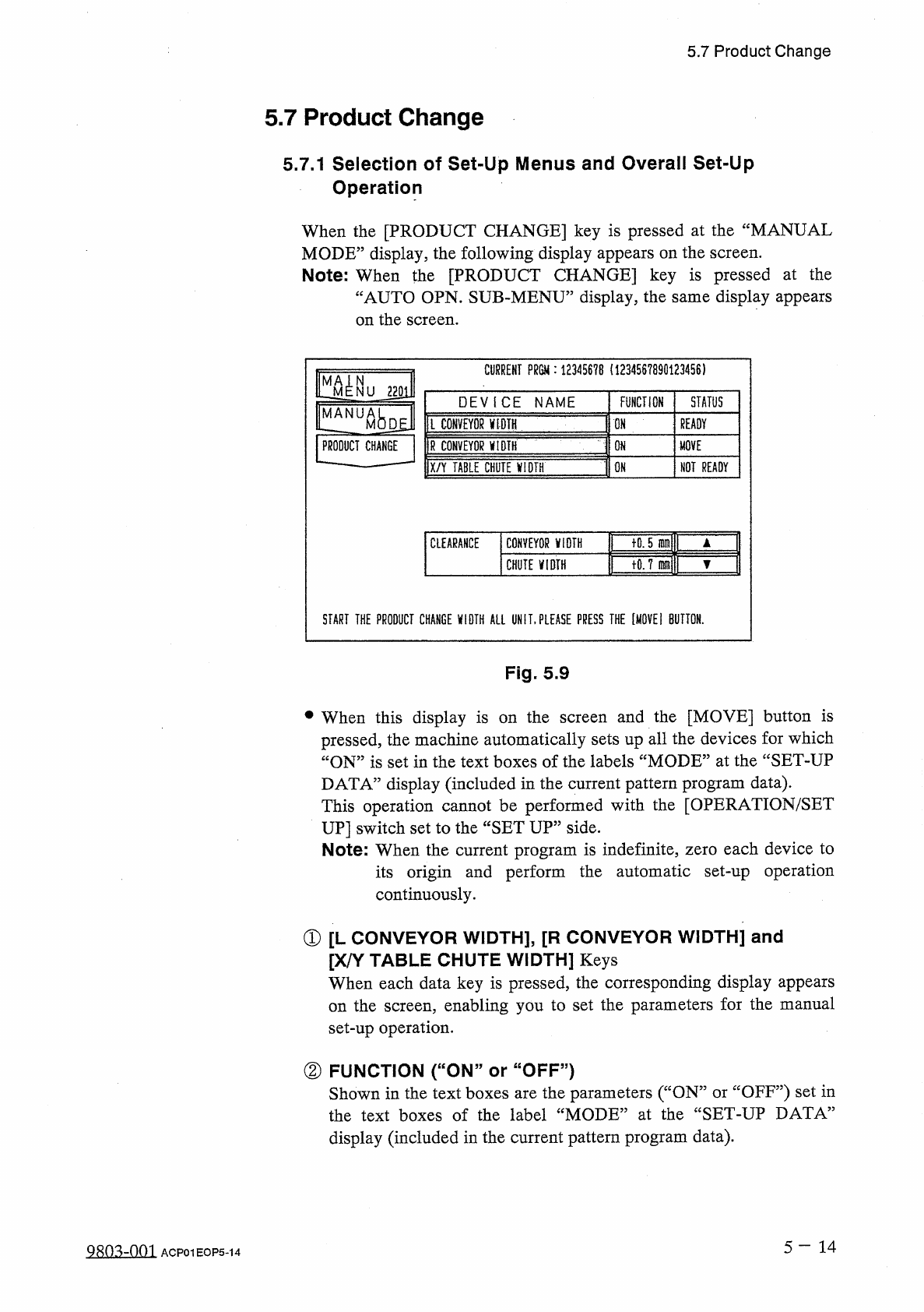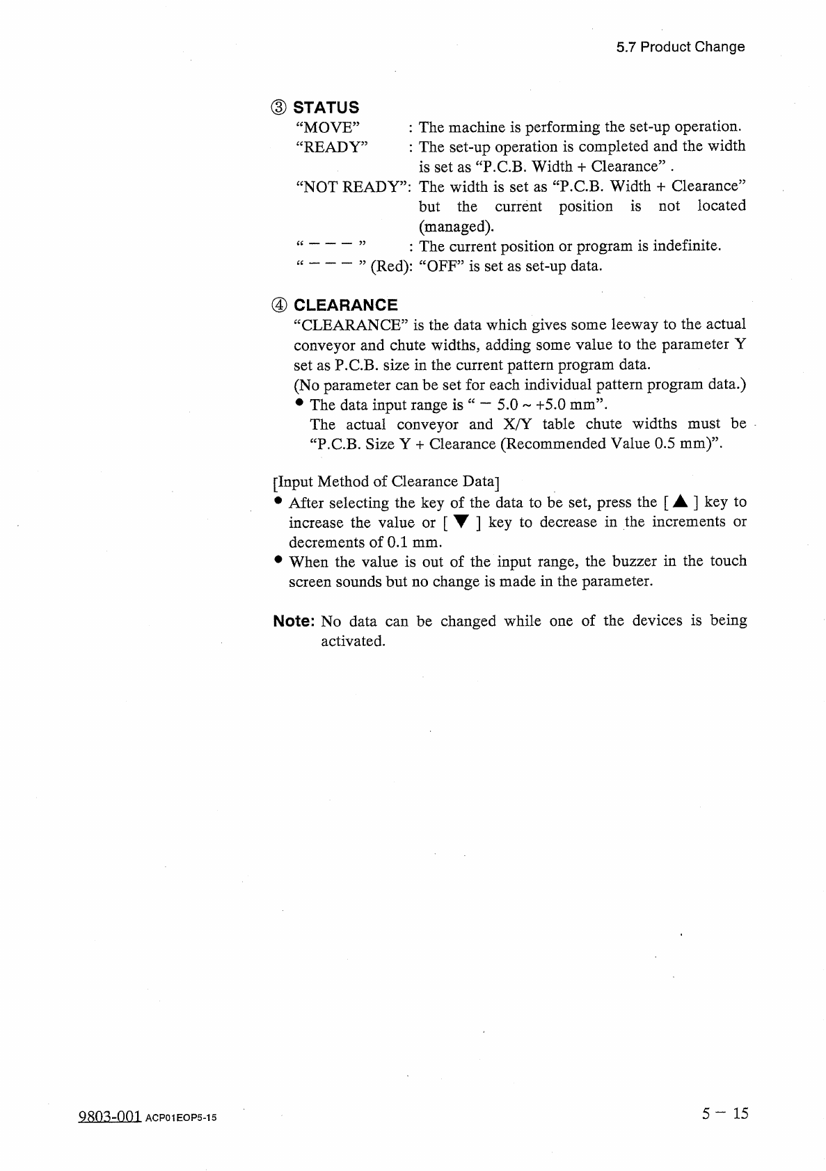 5.7 Product Change ③ STATUS “ MOVE ” “ READY , : The machine is performing the set - up operation . : The set - up operation is completed and the width is set as “ P . C . B . Width + Clearance ” • NOT READY ” : The widt…