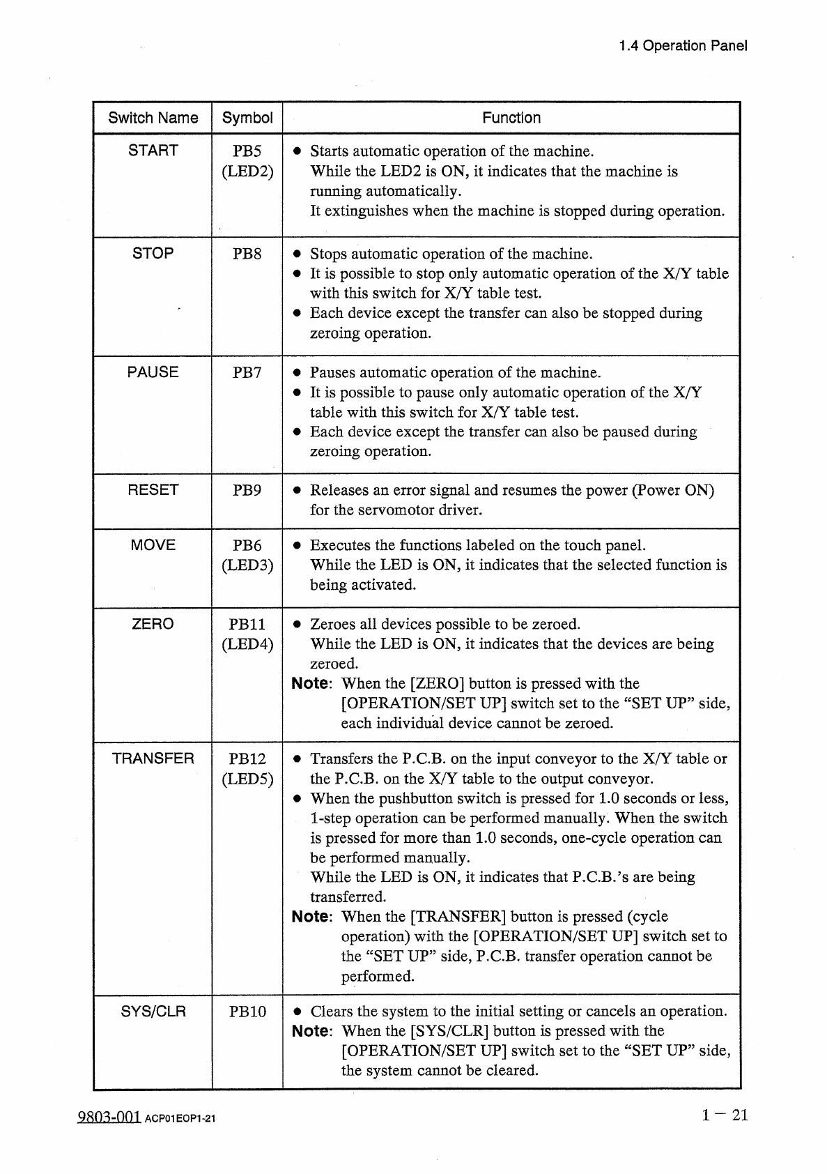 1.4 Operation Panel Switch Name Symbol Function START • Starts automatic operation of the machine . While the LED 2 is ON , it indicates that the machine is running automatically . It extinguishes when the machine is sto…