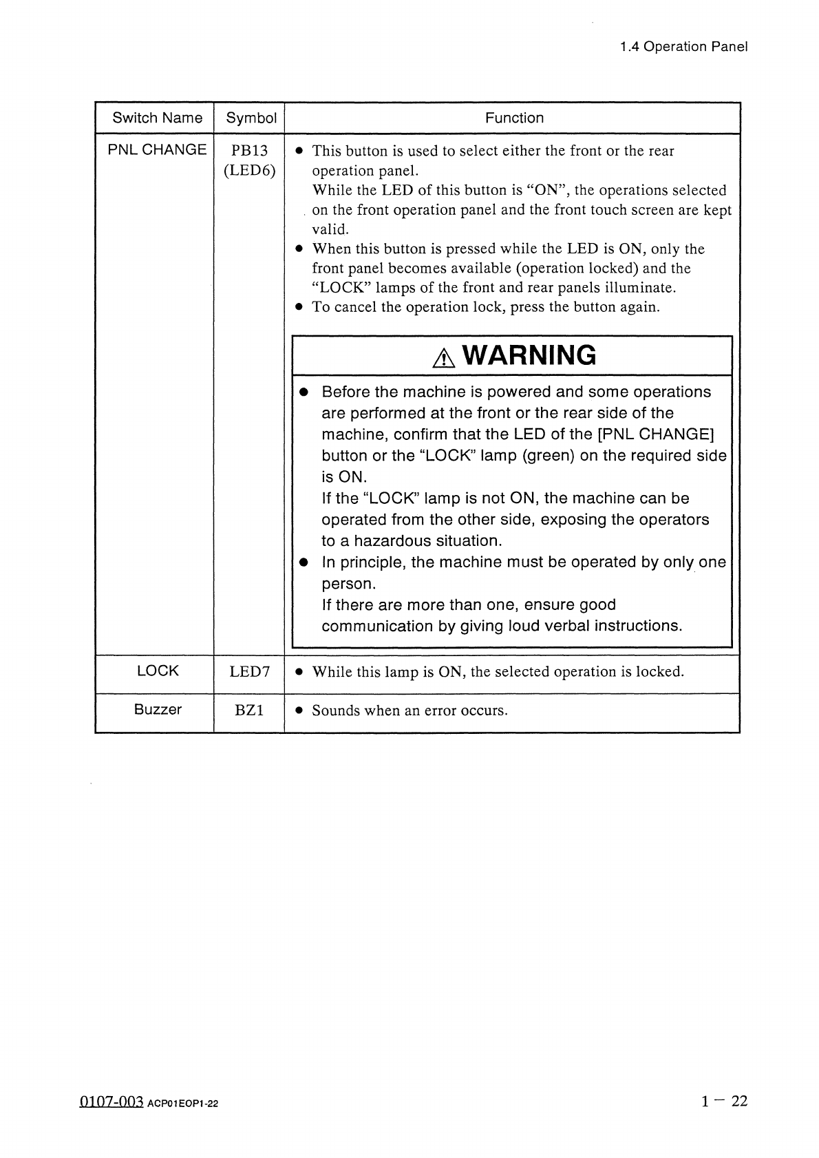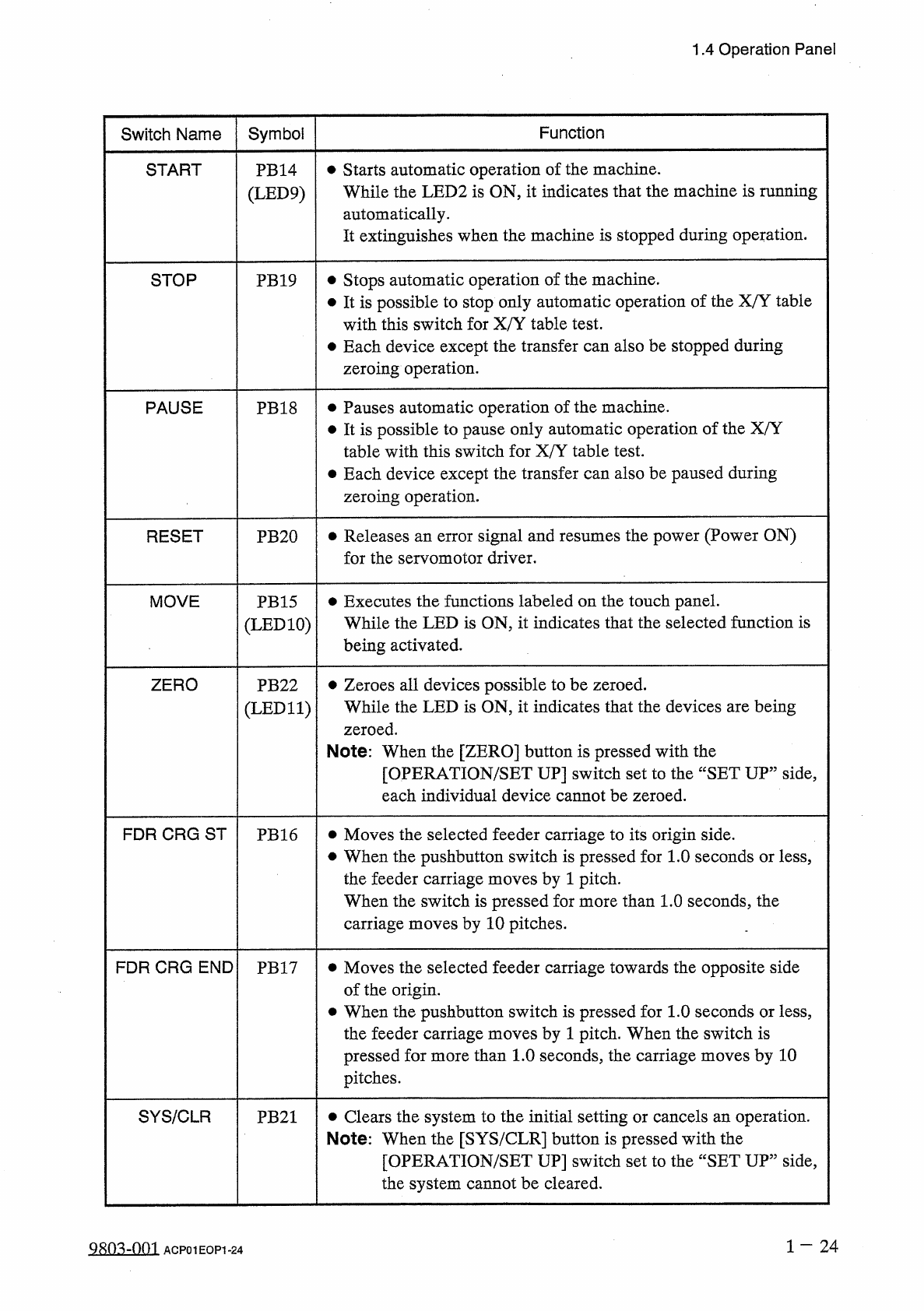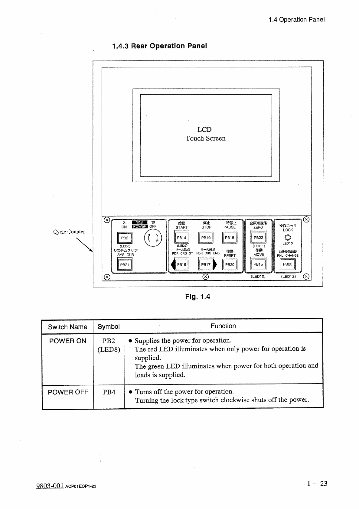 1.4 Operation Panel 1 , 4 , 3 Rear Operation Panel LCD Touch Screen © 切 入 停止 - m ± PAUSE 始動 全原点鶴 ZERO 操作 □ , : / 夕 LOCK OFF ON STOP START Cycle Counter o PB 14 PB 2 PB 19 PB 18 PB 22 LED 13 ( LED 9 ) y - 儿始点 y - 祕点 ; CRG…