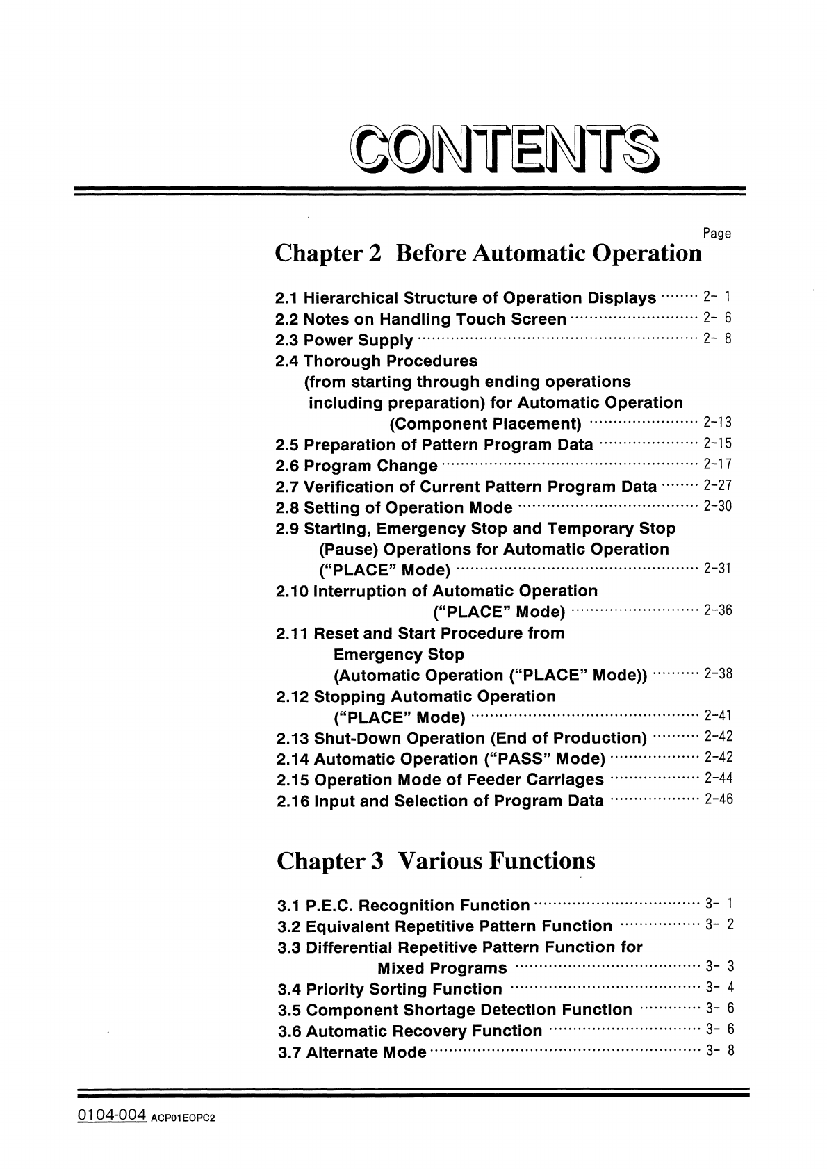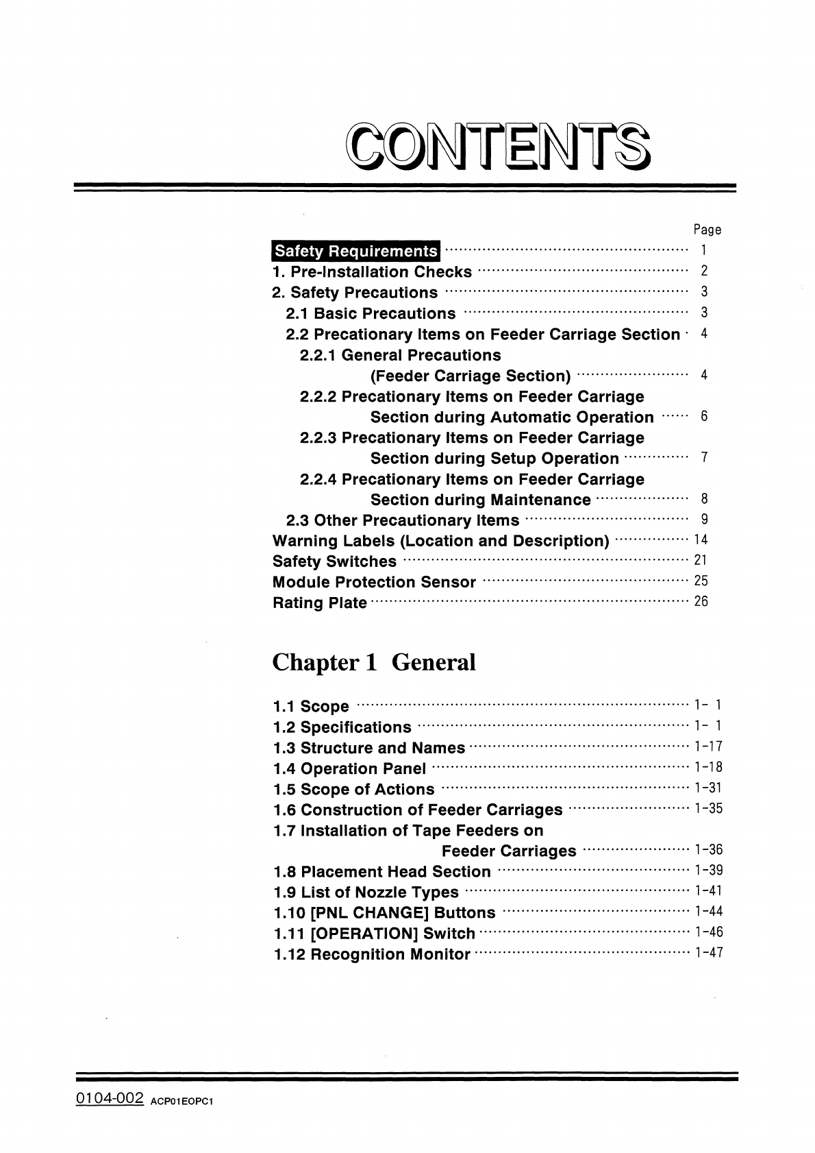 Page Safety Requirements 2 1 . Pre - Installation Checks 2 . Safety Precautions 2.1 Basic Precautions … 2.2 Precationary Items on Feeder Carriage Section 4 2.2 . 1 General Precautions ( Feeder Carriage Section ) 2.2 . 2 …