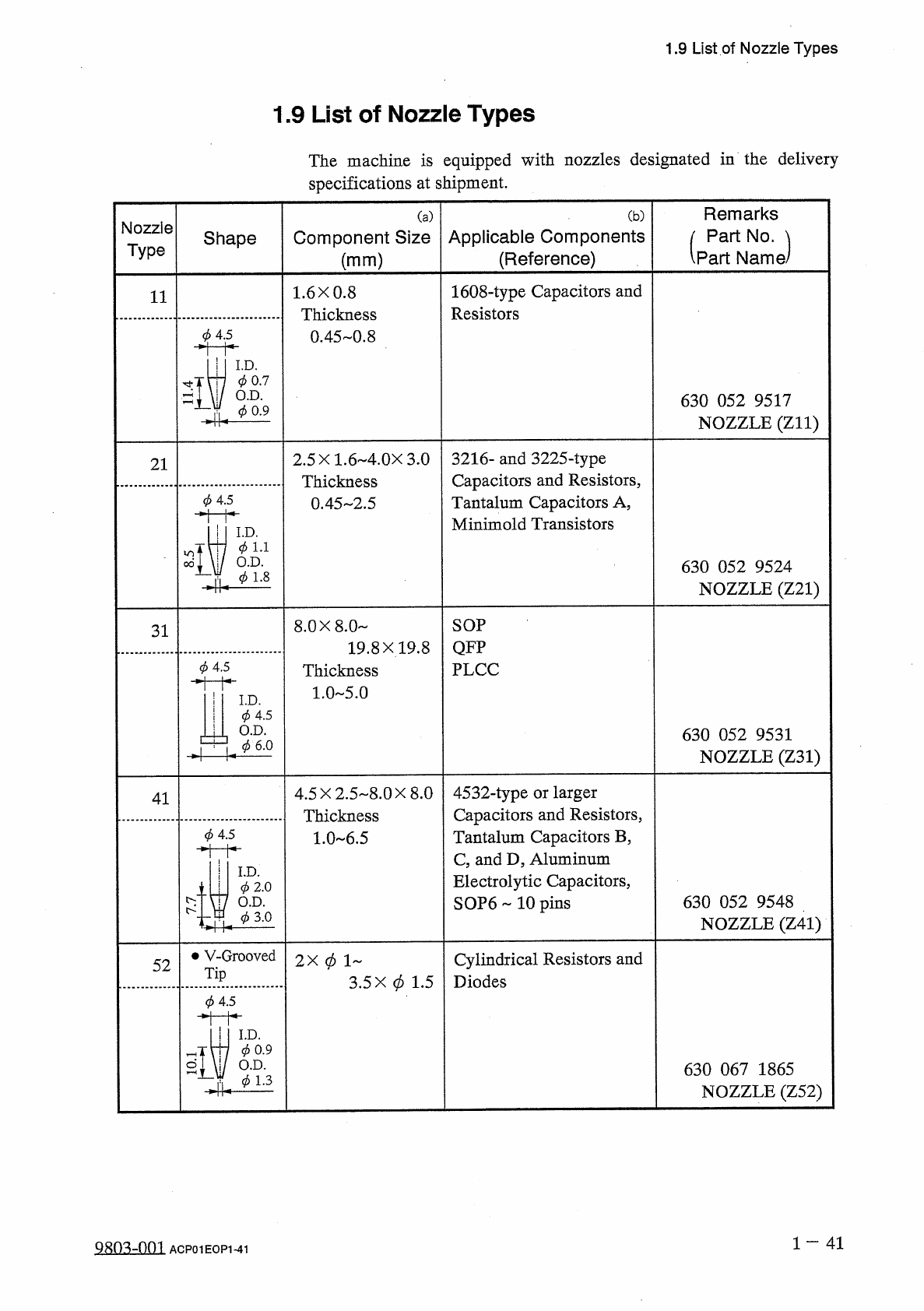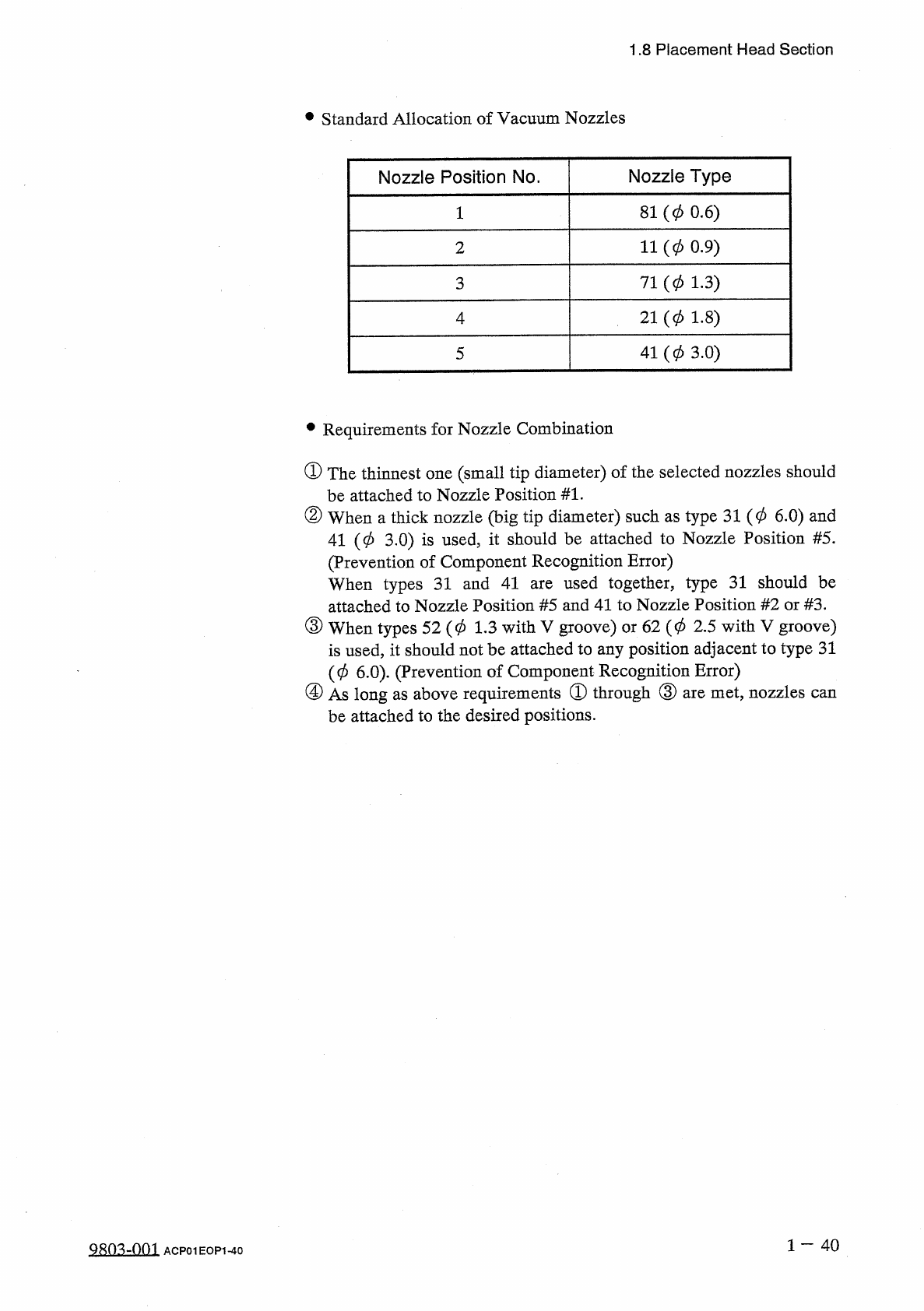 1.8 Placement Head Section • Standard Allocation of Vacuum Nozzles Nozzle Position No . Nozzle Type 81 ( 0 0.6 ) 11 ( 0 0.9 ) 2 71 ( 0 1.3 ) 3 2 1 ( 0 1 . 8 ) 4 41 ( 0 3.0 ) 5 • Requirements for Nozzle Combination ① The …