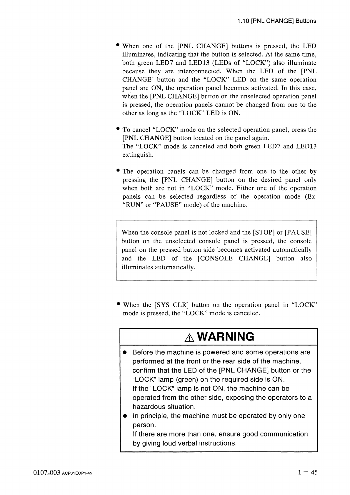 1.11 [ OPERATION ] Switch 1.11 [ OPERATION ] Switch When the [ OPERATION / SET UP ] switch is set to the “ SET UP ” side , the safety check switch on the front safety door is deactivated and setup operations become possi…