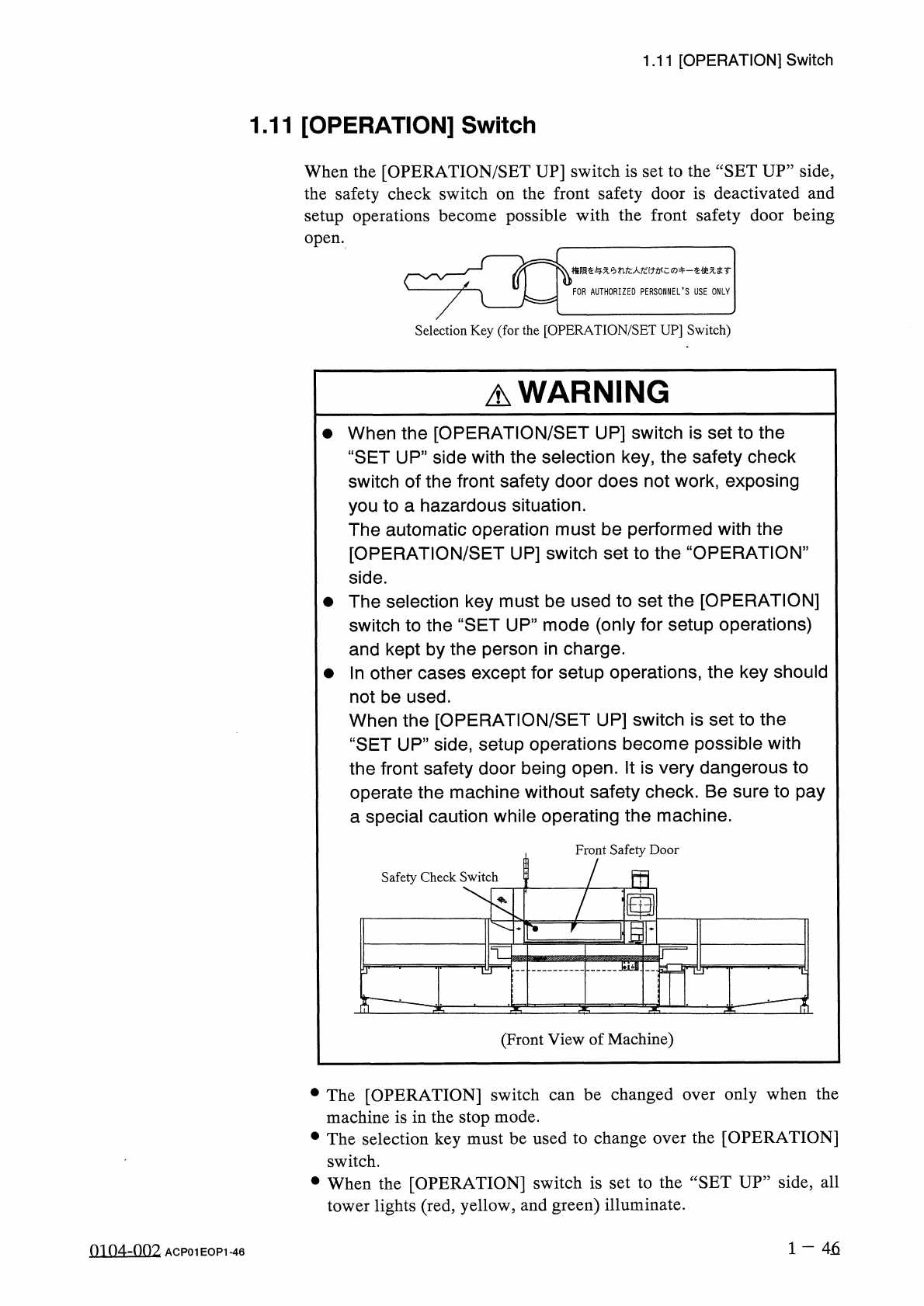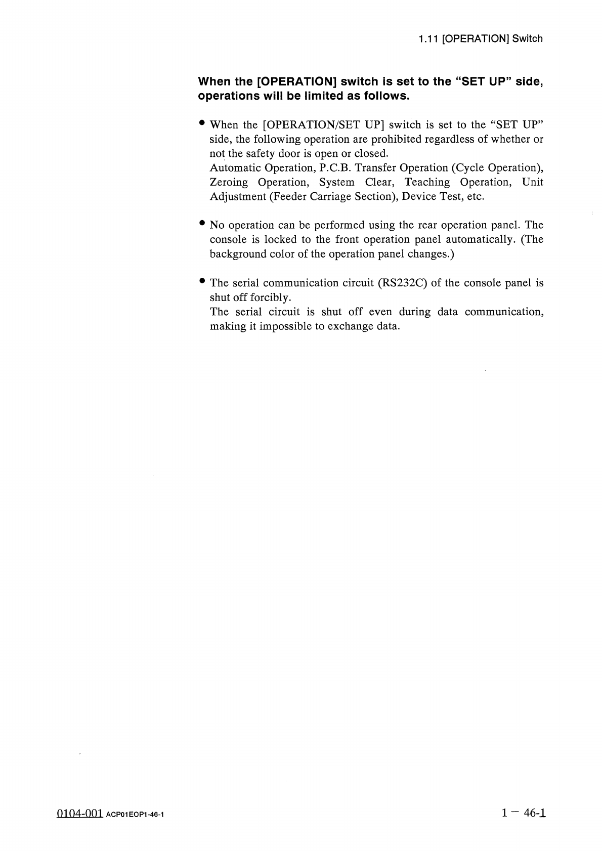 1.11 [ OPERATION ] Switch When the [ OPERATION ] switch is set to the “ SET UP ” side , operations will be limited as follows . • When the [ OPERATION / SET UP ] switch is set to the “ SET UP ” side , the following opera…