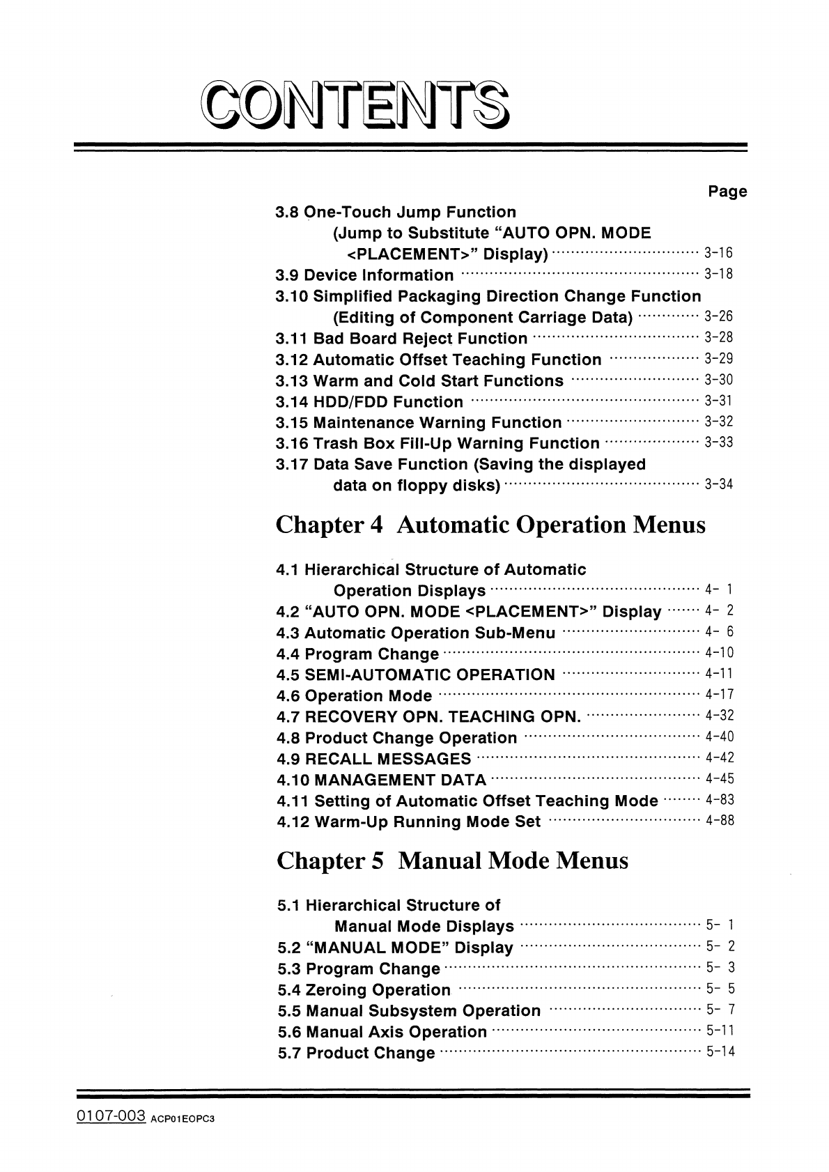 © DMTE T ^ Page 3.8 One - Touch Jump Function ( Jump to Substitute “ AUTO OPN . MODE 〈 PLACEMENT 〉 , , Display ) 3.9 Device Information 3.10 Simplified Packaging Direction Change Function ( Editing of Component Carriage …