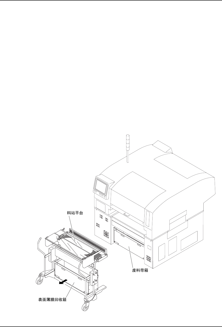 首先,请把表面薄膜回收箱拉出后废弃废料带。接下来,请将废料带排出箱拉到面前,废弃