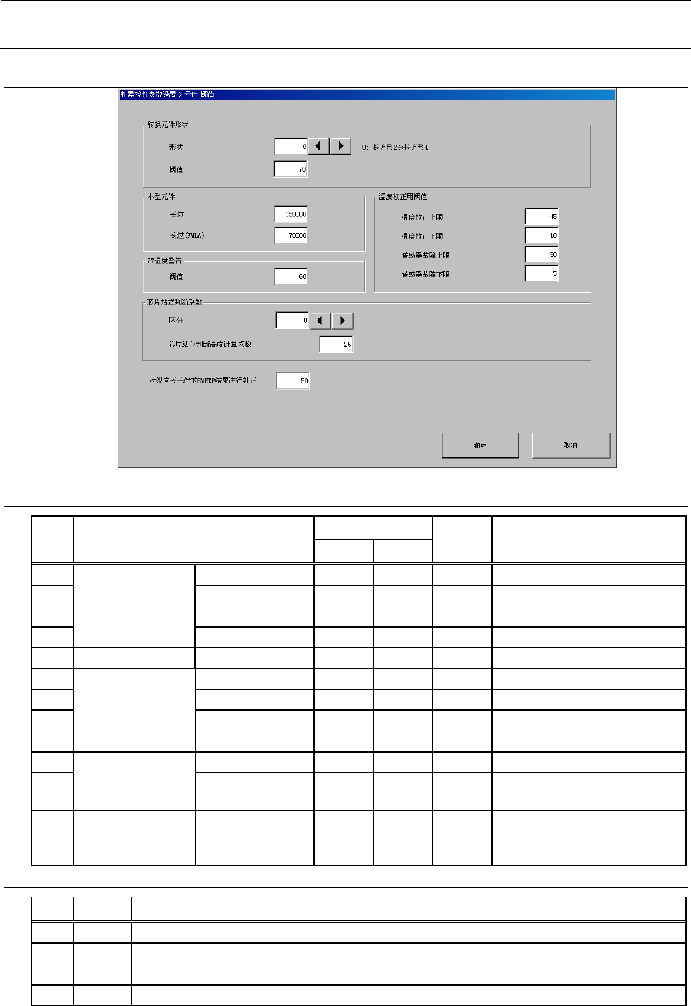 机器控制参数 2- 107 2-5- 25 元件 阈值 2-5- 25 -1 设定项目 No. 项目 输入范围 单位 备考 最小值 最大值 1 转换元件形状 形状 0 9 参照 2-5-25-2 转换元件形状 2 阈值 3 小型元件 长辺 4 长辺( FMLA ) 5 ZT 温度警告 阈值 6 温度校正用阈值 温度校正上限 7 温度校正下限 8 传感器故障上限 9 传感器故障下限 10 芯片站立判断系 数 区分 0 7 11 芯片站立判…