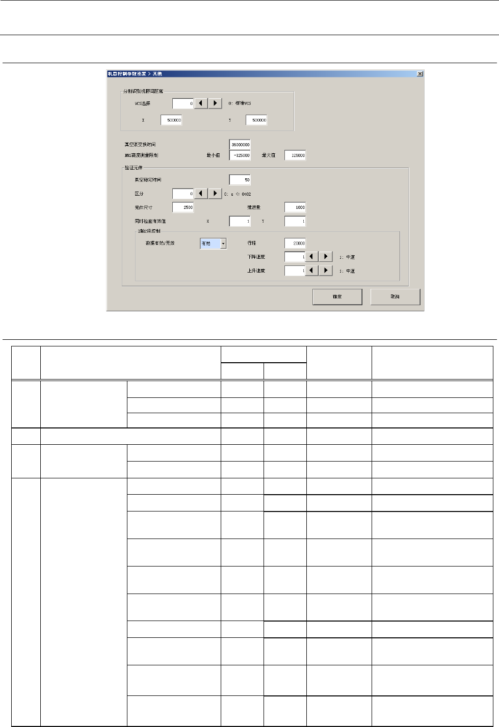 机器控制参数 2- 129 2-5- 38 其他 2-5- 38 -1 设定项目 No. 项目 输入范围 单位 备考 最小值 最大值 1 分割识别视野间 距离 VCS 选择 0 1 参照 2-5-38- 2 VCS 选择 X Y 2 真空泵交换时间 3 HMS 高度測量 限制 最小值 最大值 4 验证元件 真空稳定时间 ms 默认 50 区分 0 9 参照 2-5-38-3 区分 元件尺寸 1/10000m m 参照 2-5-38- 5…