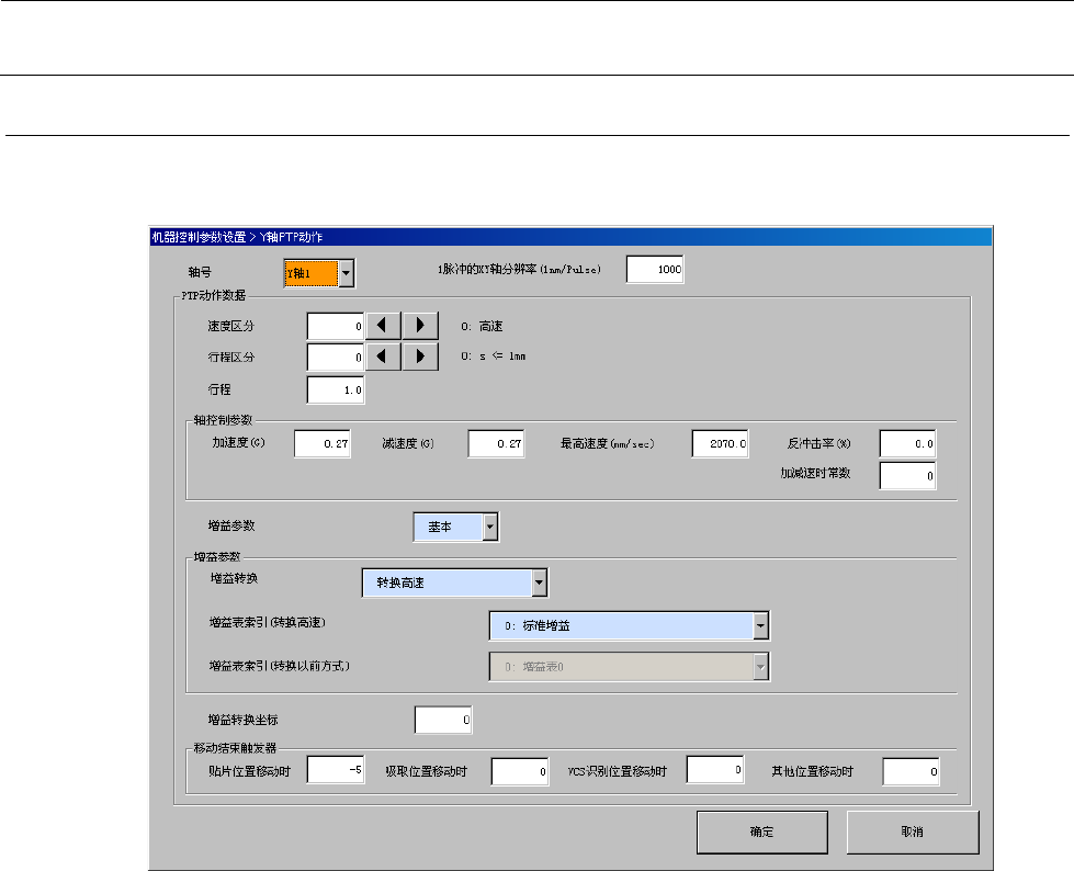 机器控制参数 2- 24 2-2-3-1 设定项目 No. 项目 输入范围 单位 备考 最小值 最大值 1 轴号 1 2 Y 轴 1 、 Y 轴 2 2 1 脉冲的 XY 轴分辨率 1nm/Puls e 3 PTP 动作 数据 速度区分 0 9 参照 2-2-3- 2 速度区分 4 行程区分 0 19 参照 2-2-3- 3 行程区分 5 行程 - 10000 0 100000 6 轴控 制参 数 加速度 - 10 10 G 7 减速度…