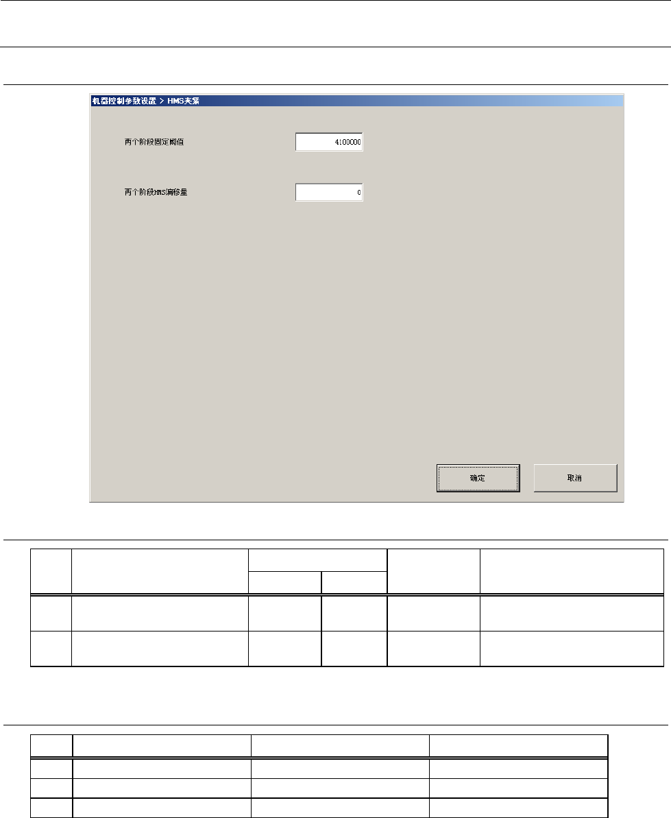 机器控制参数 2- 51 2-3-4 HMS 夹紧 2-3-4-1 设定项目 No. 项目 输入范围 单位 备考 最小值 最大值 1 两个阶段固定阈值 1/10000mm 参照 2-3-4-2 两个阶段固定 阈值 2 两个阶段 HMS 偏移量 - 100000 0 100000 0 1/10000mm 2-3-4-2 两个阶段固定阈值 No. 基板规格 最小值 最大值 1 L 基板规格 4100000 8000000 2 L- Wide…
