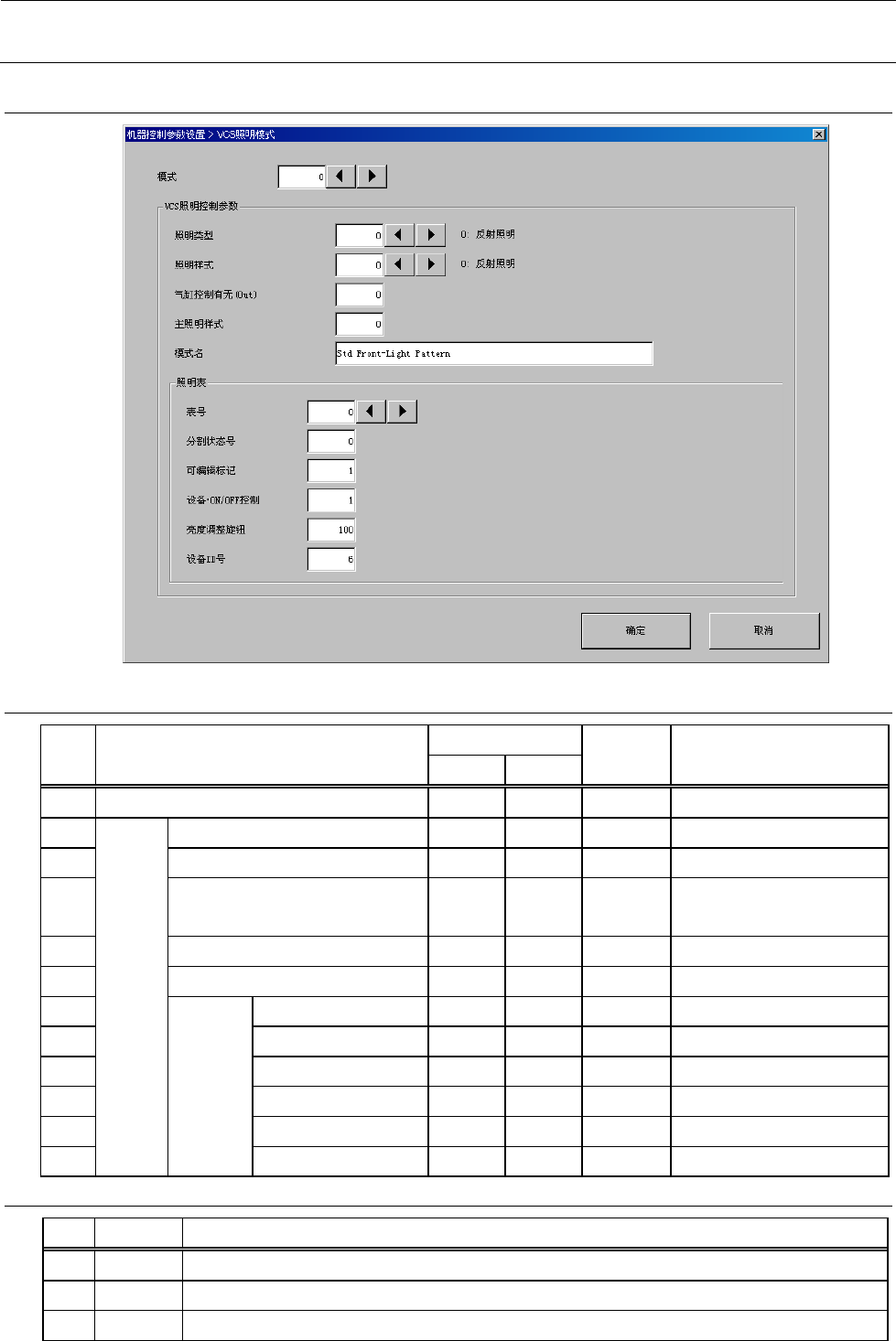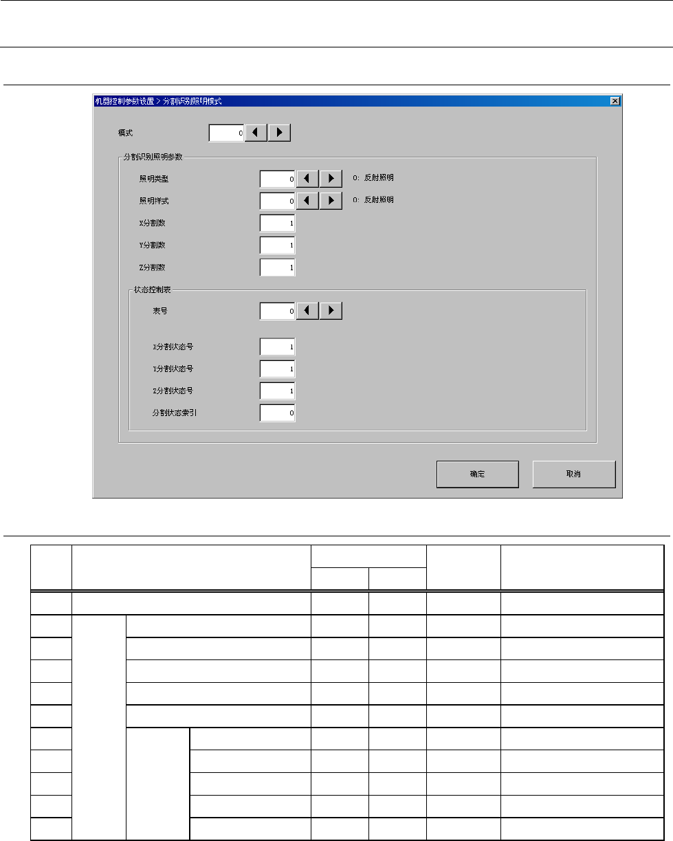 机器控制参数 2- 55 2-4-2-3 照明样式 No. 类别 内容 1 0 反射照明 2 1 CBGA 反射照明 3 2 LGA 反射照明 4 3 ~ 15 预备 5 16 透射照明(分开纵偶数) 6 17 透射照明(分开块 / 纵奇数) 7 18 小元件用透射照明 8 19 ~ 31 预备 9 32 侧面照明(红、无气缸控制) 10 33 侧面照明(红、有气缸控制) 11 34 ~ 47 预备 12 48 侧面照明(蓝、无气缸控制…