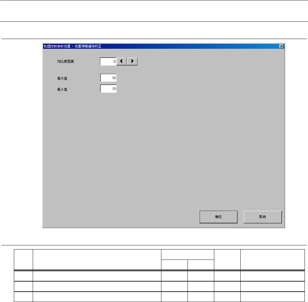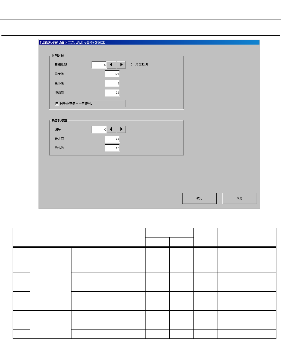 机器控制参数 2- 71 2-4- 15 二维条形码自动识别设置 2-4- 15 -1 设定项目 No. 项目 输入范围 单位 备考 最小值 最大值 1 照明数据 照明类型 0 2 0 :角度照明 1 :垂直照明 2 : 外圈照明 (选项) 2 最大值 3 最小值 4 増减值 5 照明调整值中一定使用 0 6 摄像机增益 编号 0 31 7 最大值 8 最小值
