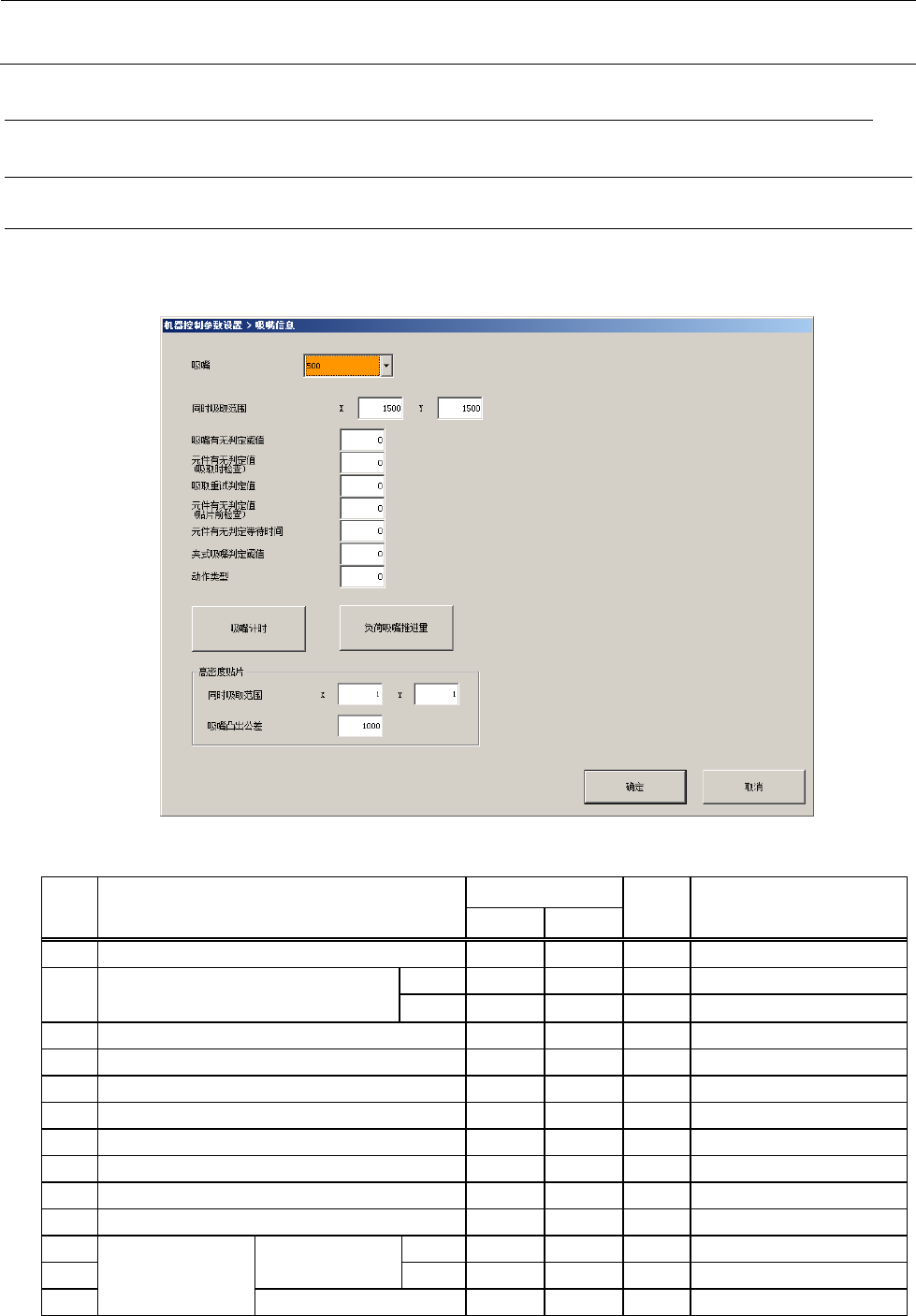 机器控制参数 2- 77 2-5-1-2 吸嘴计时设置画面 用 [OK] 按钮或 [ 取消 ] 按钮结束本画面后将返回 吸嘴信息画面。 2-5-1-2-1 设定项目 No. 项目 输入范围 单位 备考 最小值 最大值 1 吸嘴 0 499 2 夹式吸 嘴计时 吸取计 时 从打开夹盘到 Z 方向开始下 降为止的最低保证时间 ms 3 下死点停留时间 ms 4 从夹盘关闭到 Z 方向开始上 升为止的时间 ms 5 贴片时 间/废 弃时间 下…