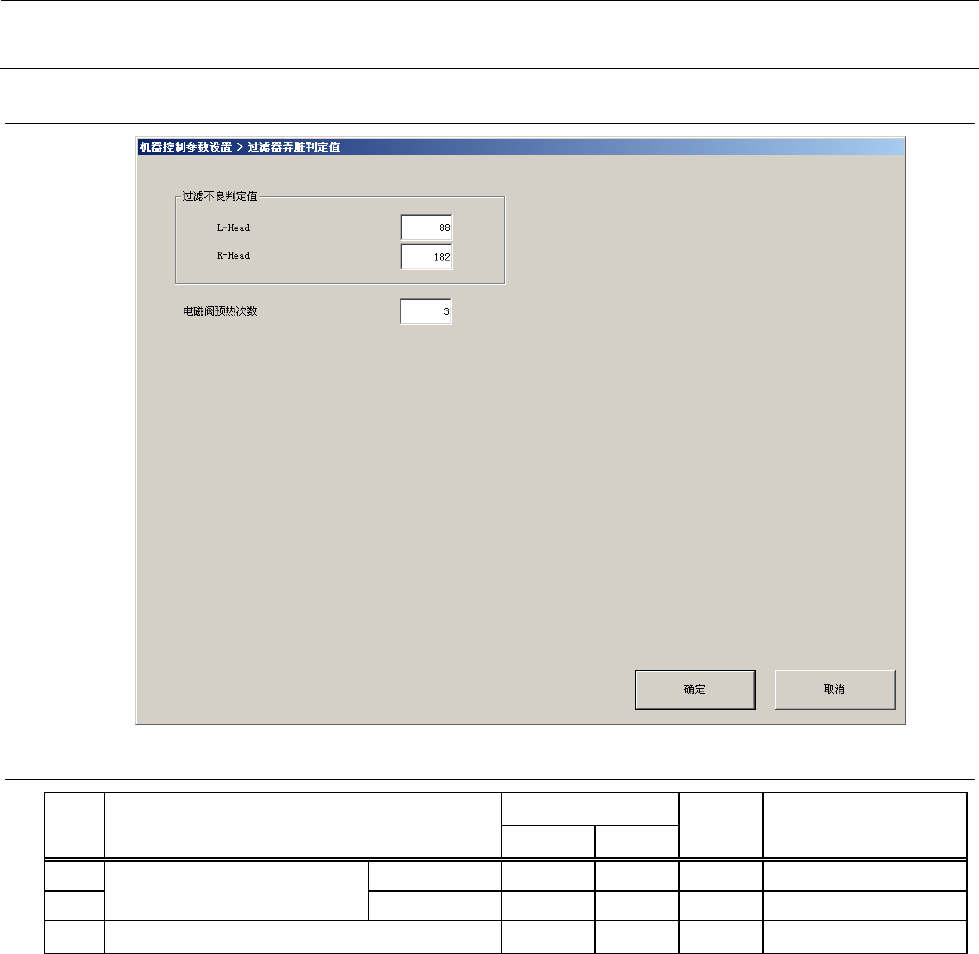 机器控制参数 2- 88 2-5- 10 过滤 器弄脏判定值 2-5- 10 -1 设定项目 No. 项目 输入范围 单位 备考 最小值 最大值 1 过滤不良判定值 L- Head 2 R- Head 3 电磁阀预热次数
