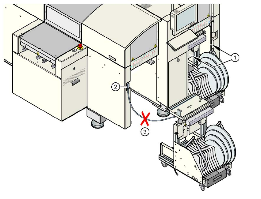 → Never reach into the gap between the component trolley and the machine base (item 1 in Fig.