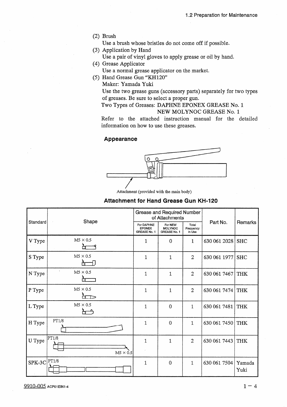 1.2 Preparation for Maintenance ( 6 ) Dispense Gun “ DG 10 KIT ” Maker : Sanei Tech This gun can be used for three types of greases . Use the syringes and the nozzles properly . Three Types of Greases : DAPHNE EPONEX GRE…