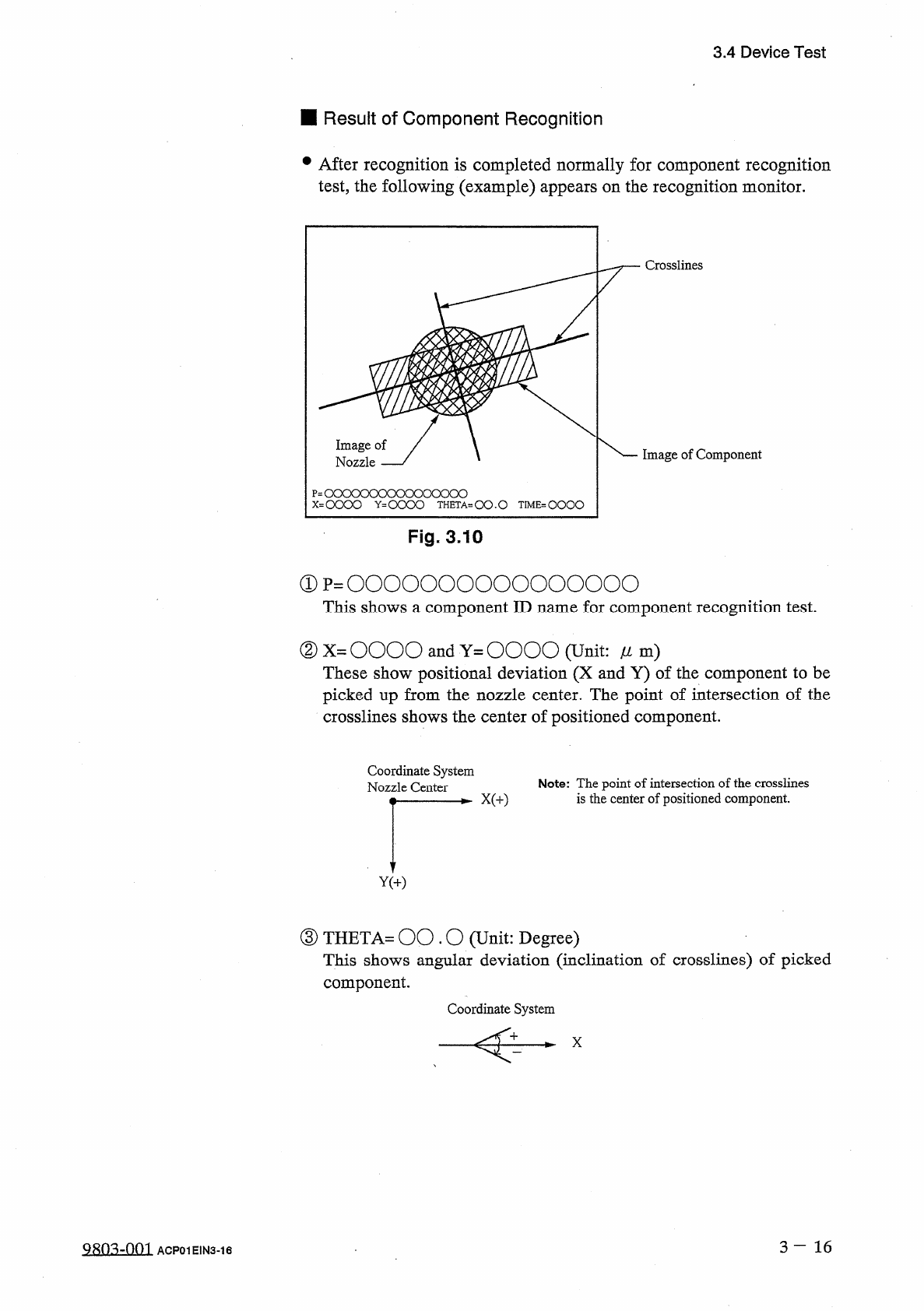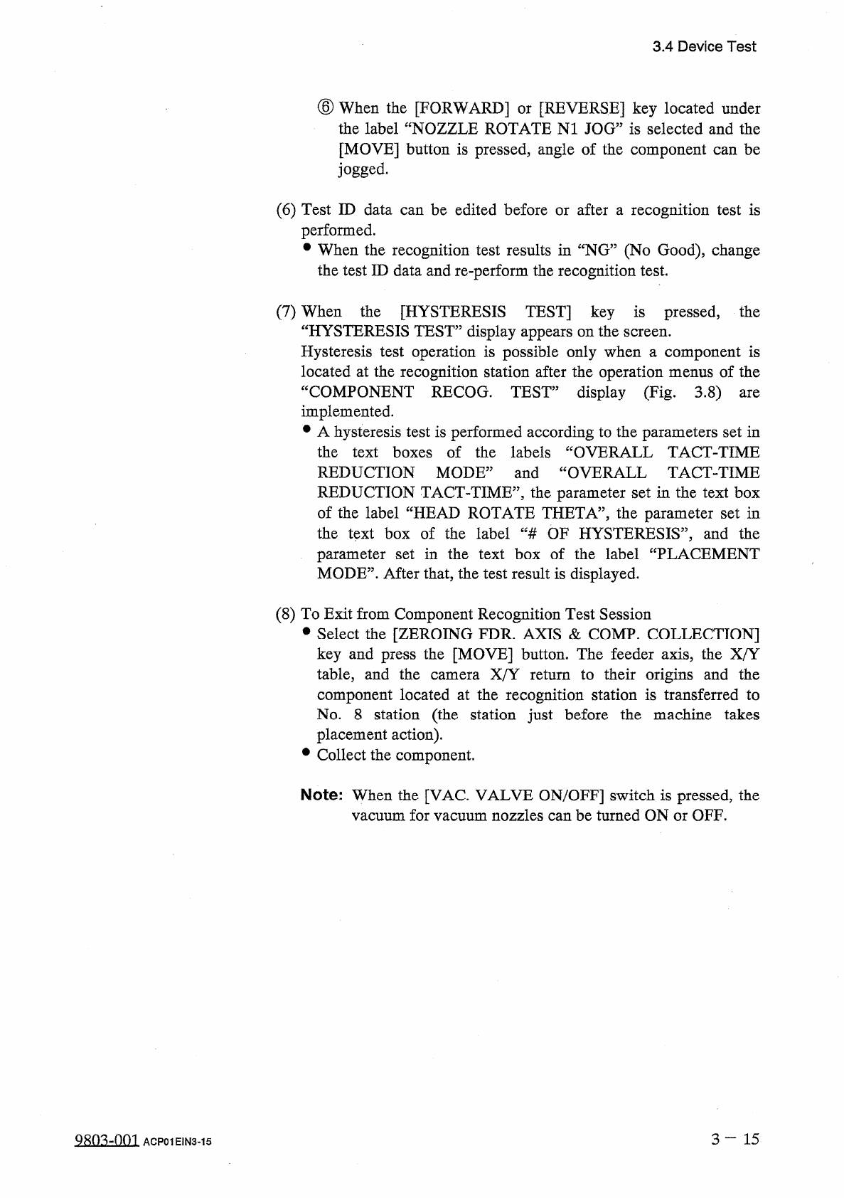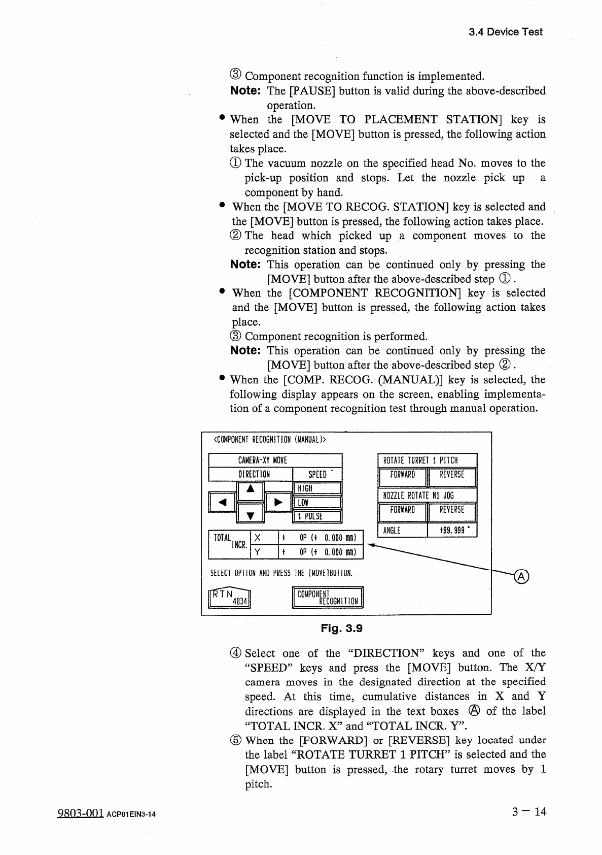 3.4 Device Test ⑥ When the [ FORWARD ] or [ REVERSE ] key located under the label “ NOZZLE ROTATE N 1 JOG ” is selected and the [ MOVE ] button is pressed , angle of the component can be jogged . ( 6 ) Test ID data can b…