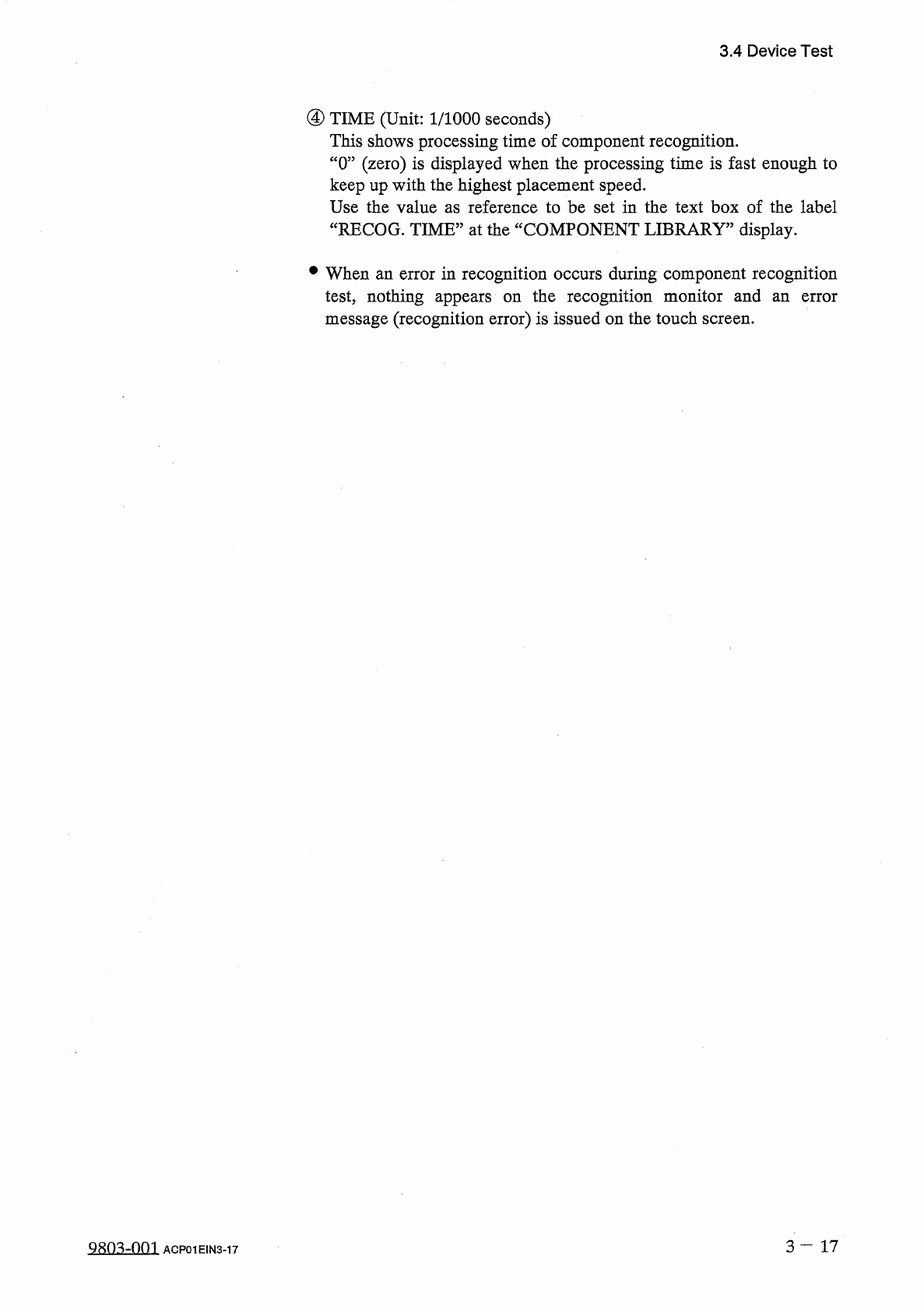3.4 Device Test ④ TIME ( Unit : 1 / 1000 seconds ) This shows processing time of component recognition . “ 0 ” ( zero ) is displayed when the processing time is fast enough to keep up with the highest placement speed . U…