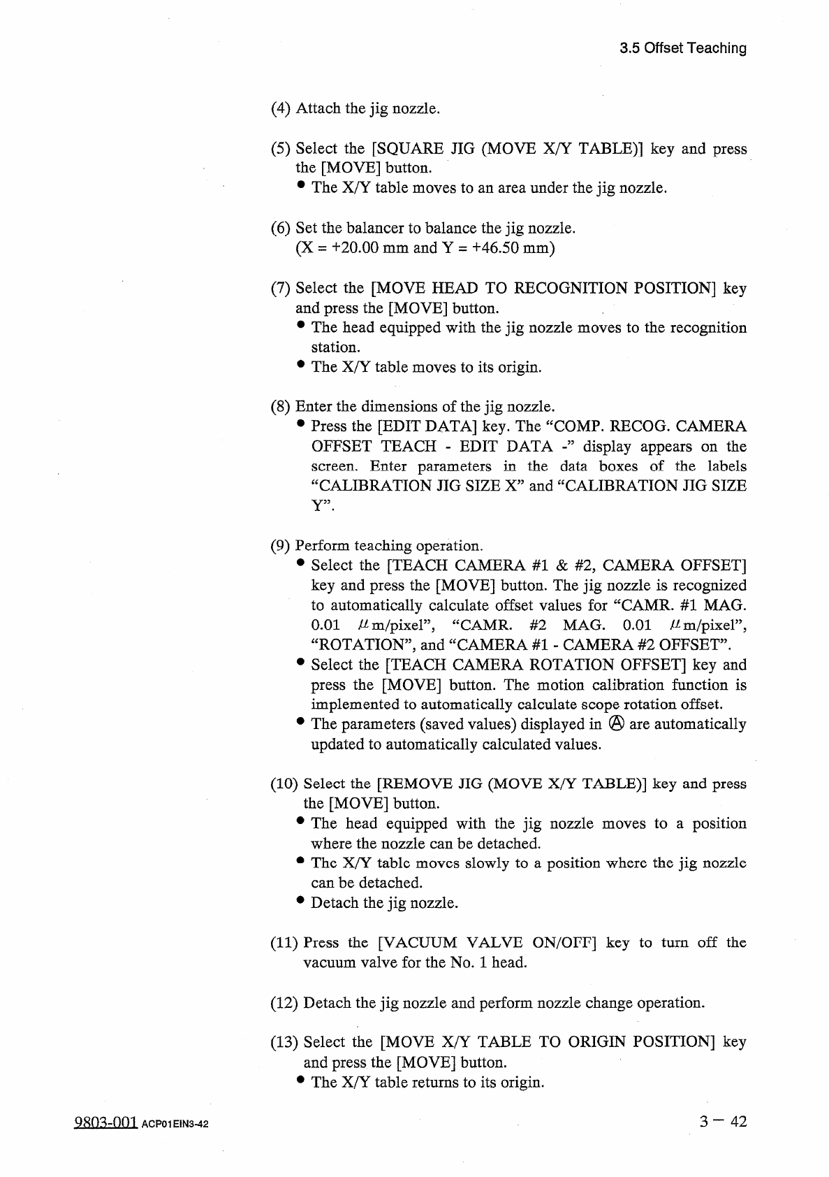 3.5 Offset Teaching ( 4 ) Attach the jig nozzle . ( 5 ) Select the [ SQUARE JIG ( MOVE X / Y TABLE ) ] key and press the [ MOVE ] button . • The X / Y table moves to an area under the jig nozzle . ( 6 ) Set the balancer …