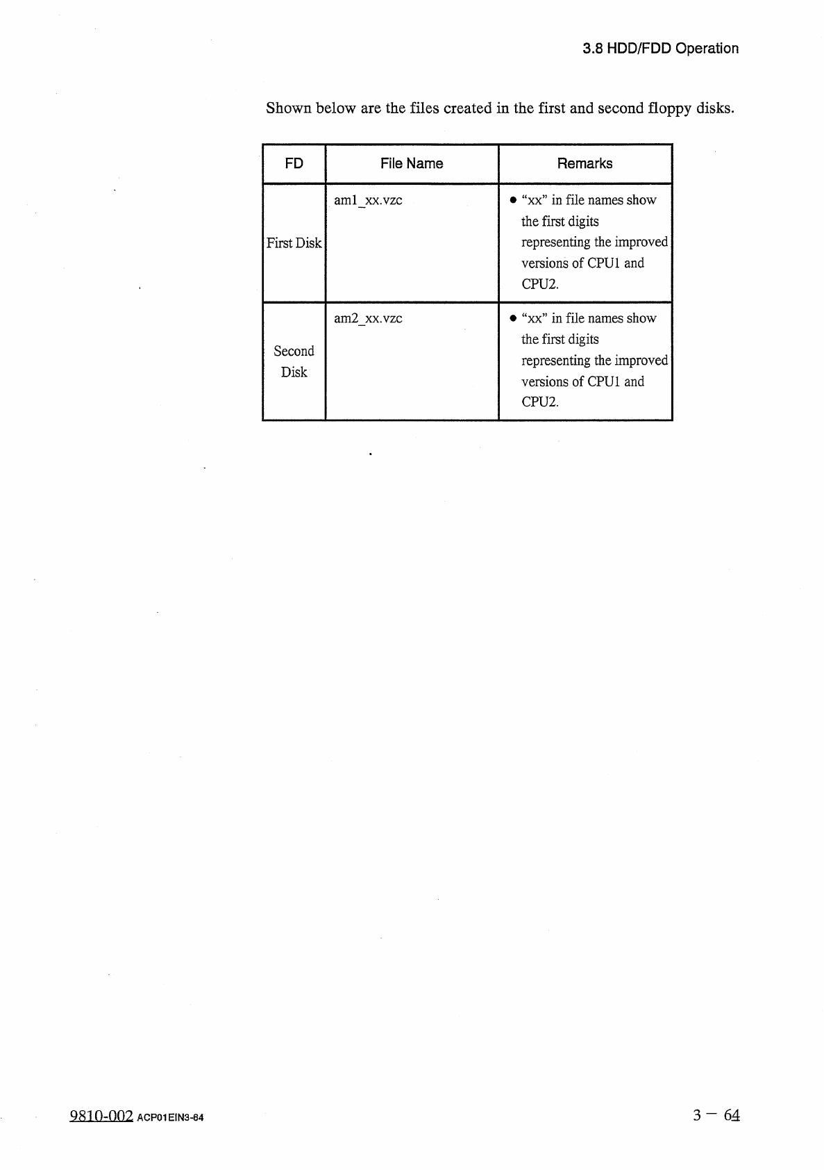 3.8 HDD / FDD Operation Shown below are the files created in the first and second floppy disks . FD File Name Remarks • “ xx ” in file names show the first digits representing the improved versions of CPU 1 and CPU 2 . a…
