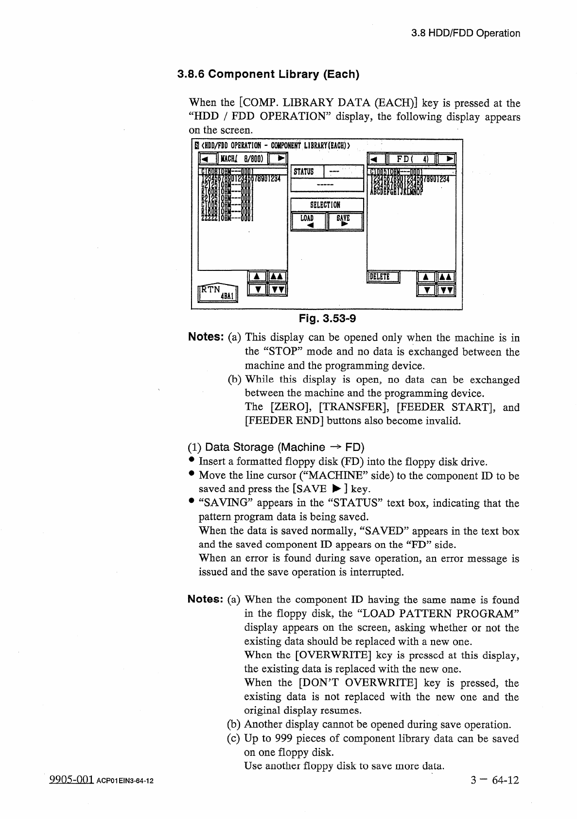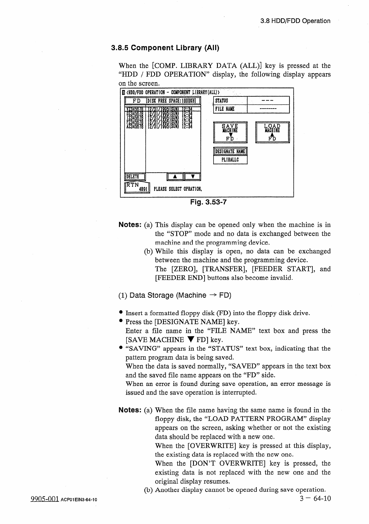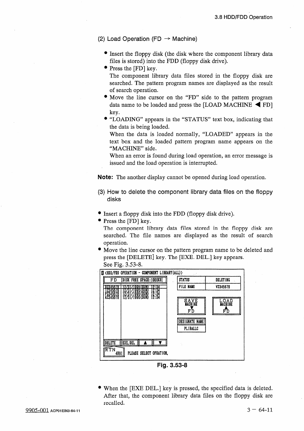 3.8 HDD / FDD Operation ( 2 ) Load Operation ( FD — Machine ) • Insert the floppy disk ( the disk where the component library data files is stored ) into the FDD ( floppy disk drive ) . • Press the [ FD ] key . The compo…