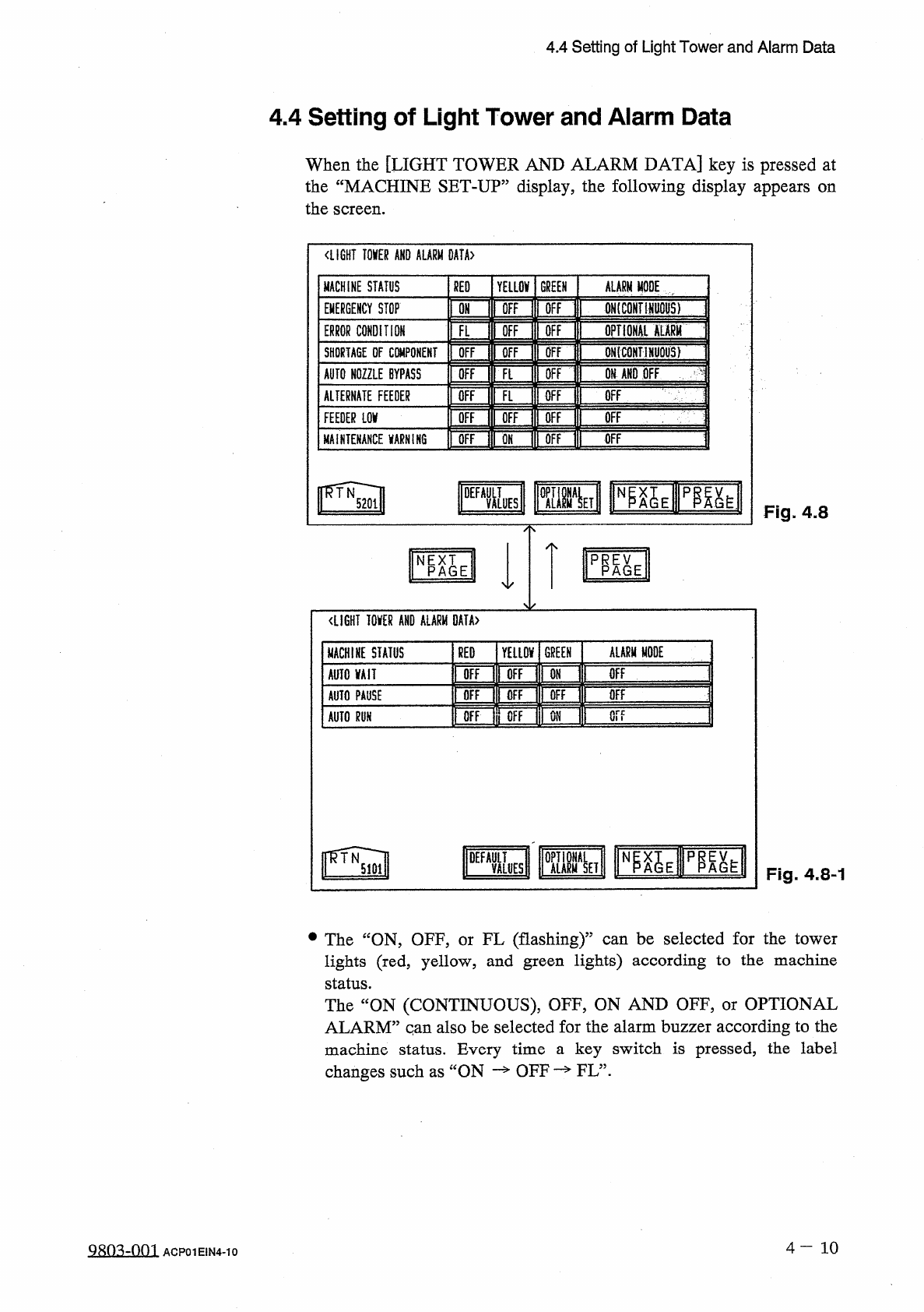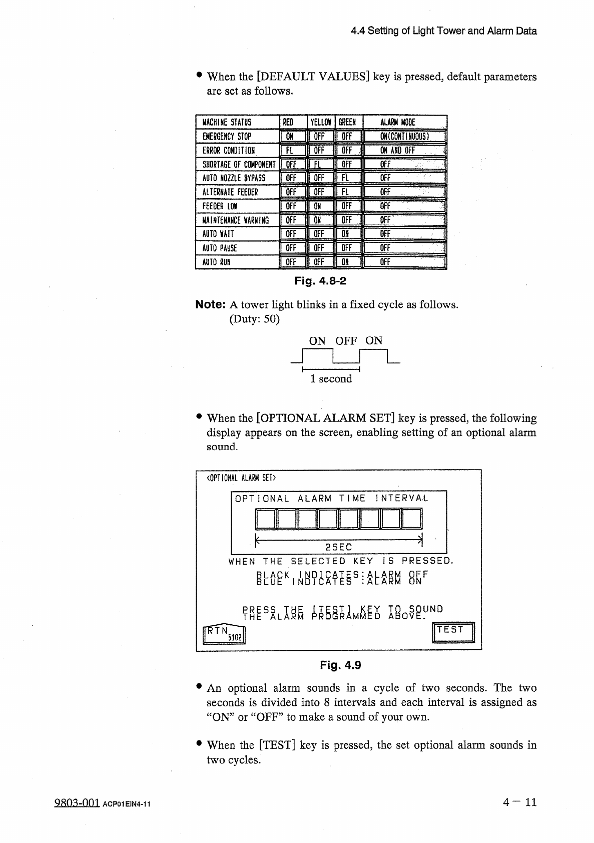 4.4 Setting of Light Tower and Alarm Data • When the [ DEFAULT VALUES ] key is pressed , default parameters are set as follows . MACHINE STATUS RED YELLOW GREEN ALARM MODE OH irOFF H OFF II QN ( CONTIHWS ) EMERGENCY STOP…